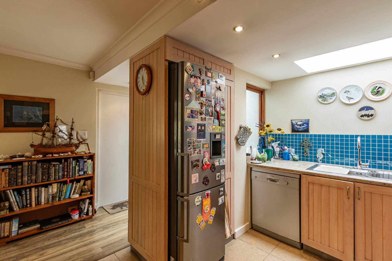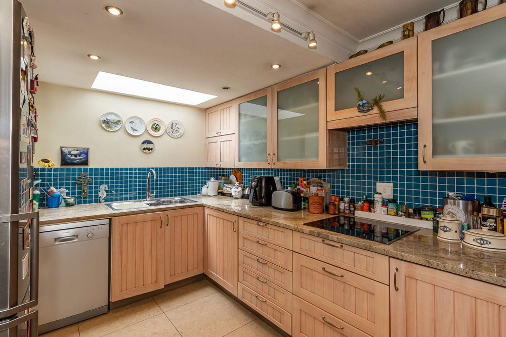 Downstairs, a versatile ensuite bedroom includes an interleading door, allowing the bathroom to double as a guest cloakroom. The open-plan lounge and dining area is anchored by a cosy wood-burning fireplace and flows effortlessly onto a north-facing patio shaded by majestic Oak trees, providing cool summers and warm, sunlit winters.