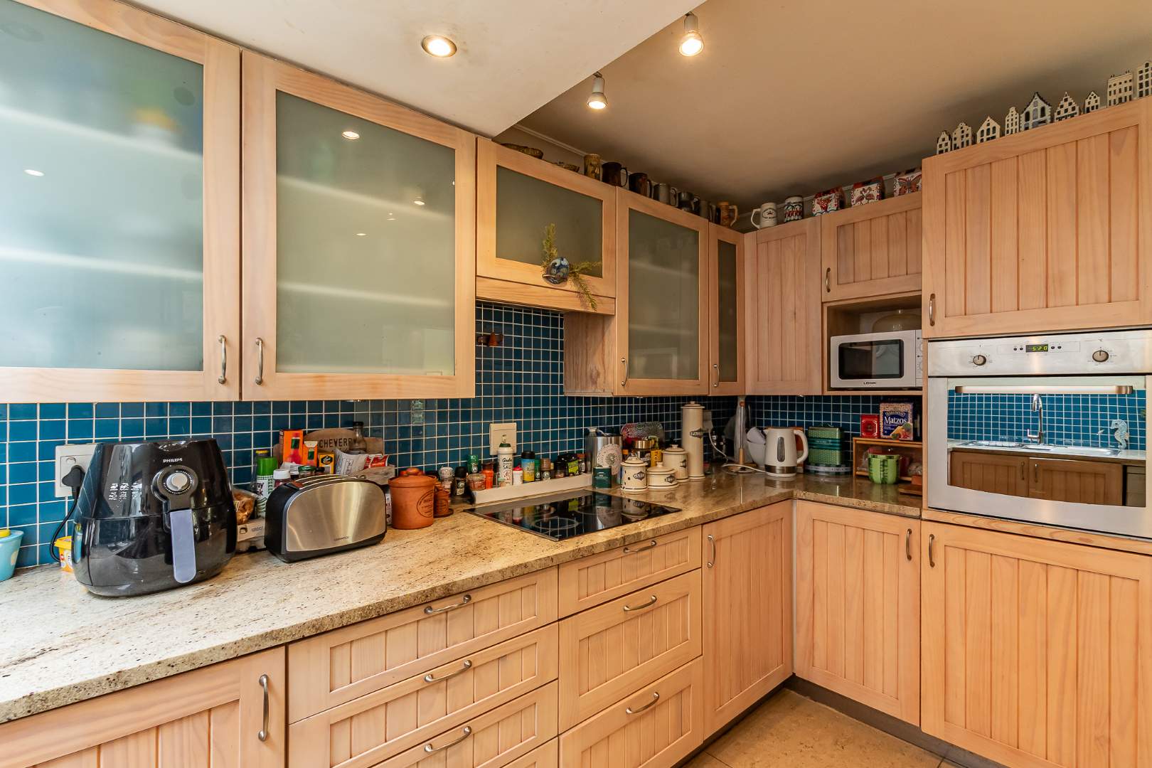 The home features a single garage with additional parking for one vehicle directly in front. Inside, the kitchen is fitted with built-in cupboards and a central island, perfect for casual dining and entertaining.