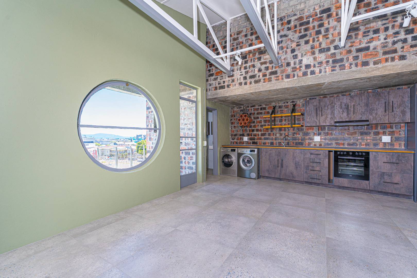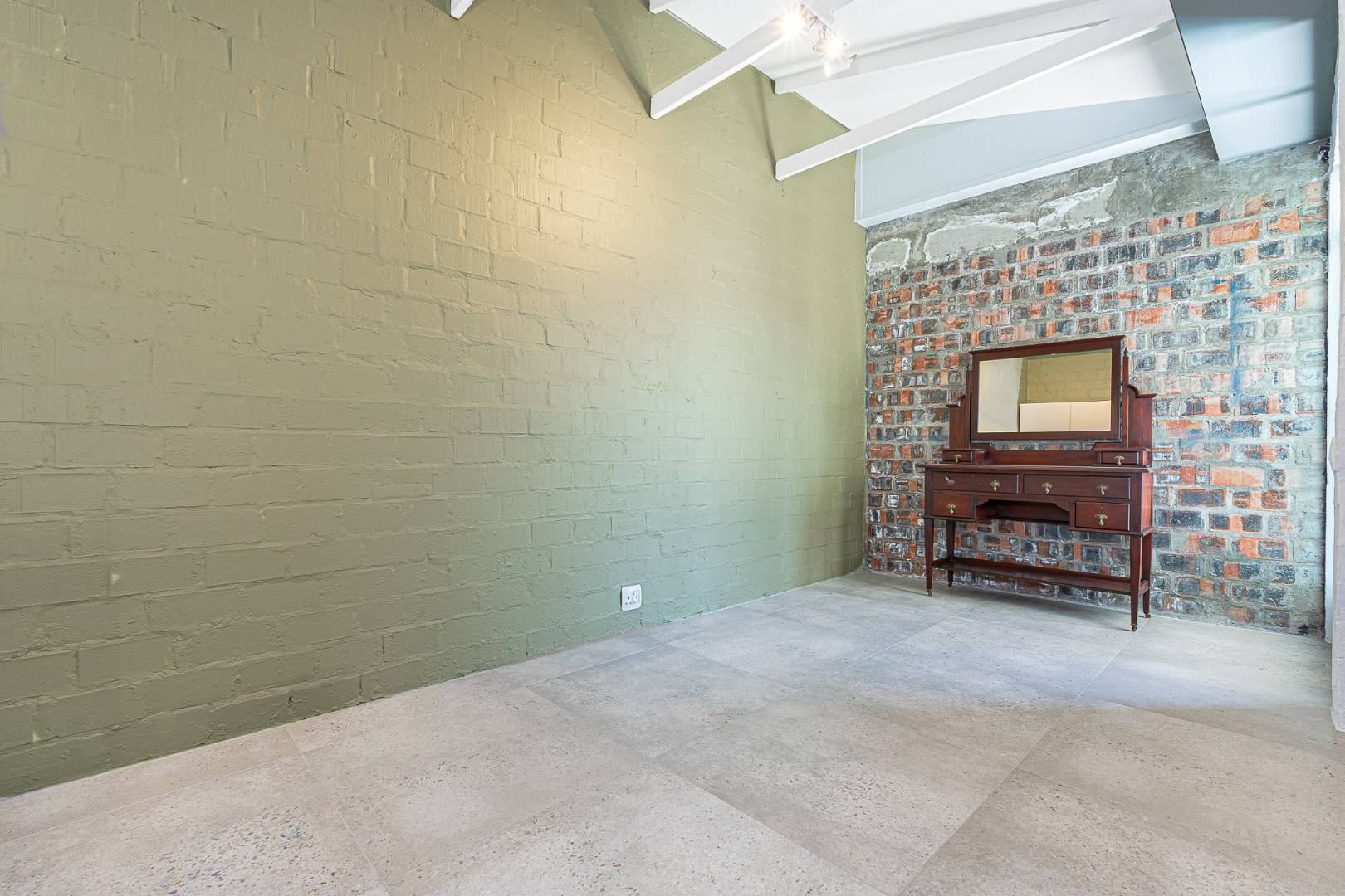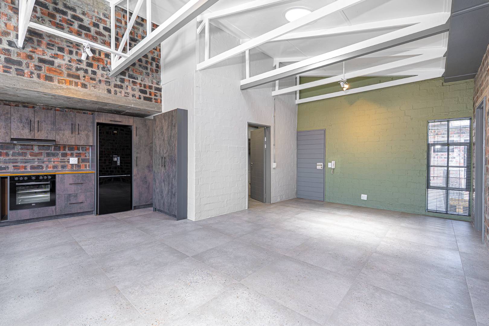 The apartment with brick feature walls, warm green touches, and white painted exposed ceiling beams & tiled floors, give the industrial styling a polished look.
