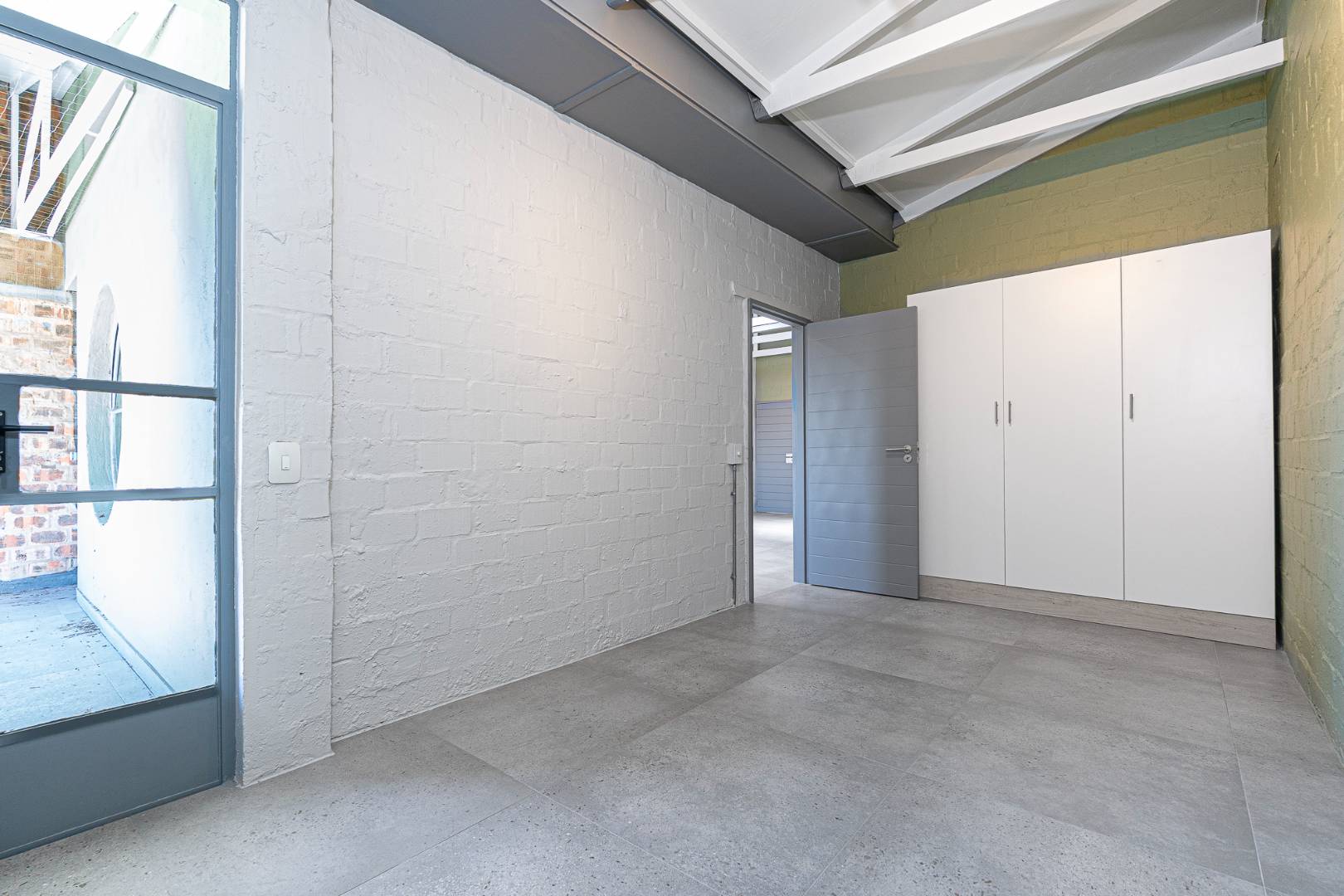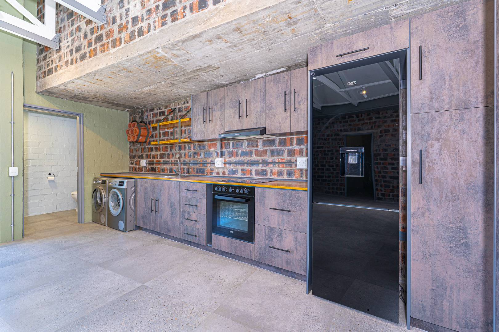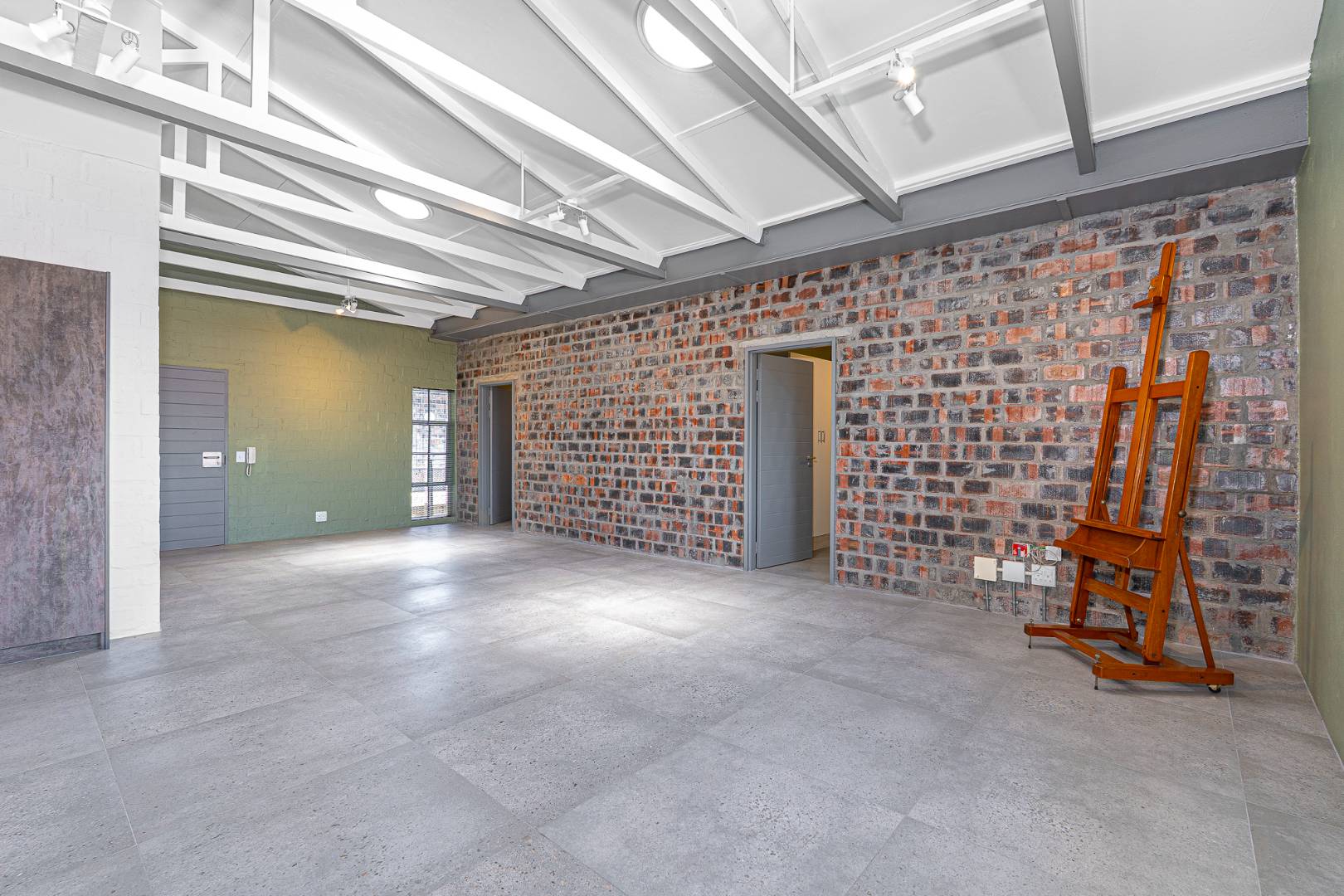 The apartment with brick feature walls, warm green touches, and white painted exposed ceiling beams & tiled floors, give the industrial styling a polished look.