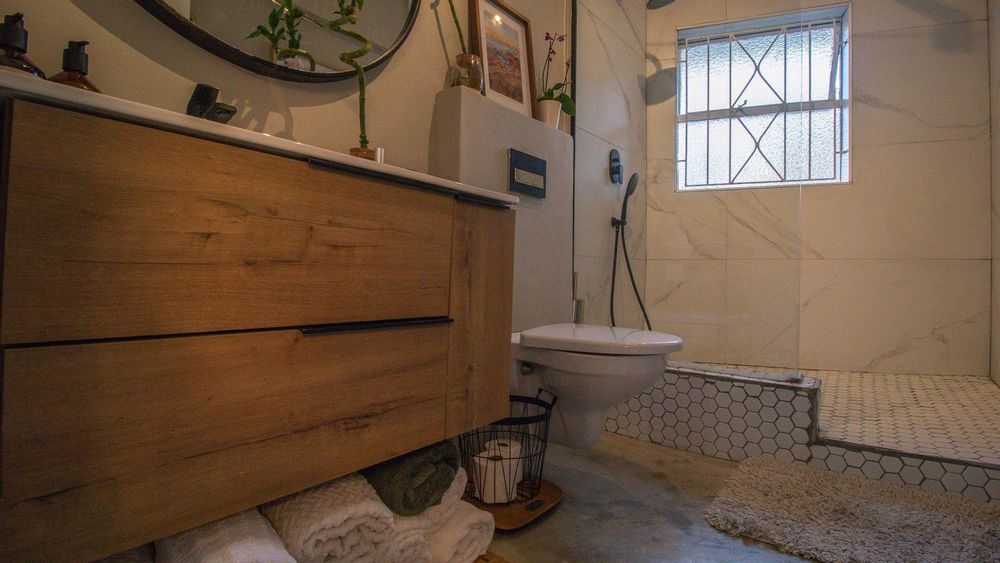 The bathroom gleams in cool-toned tile,