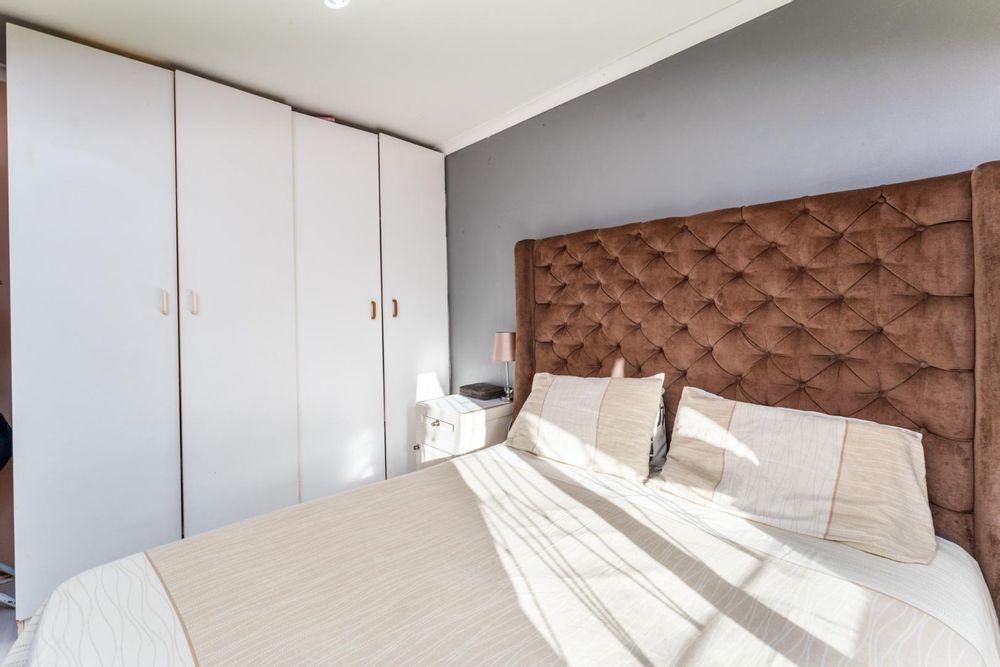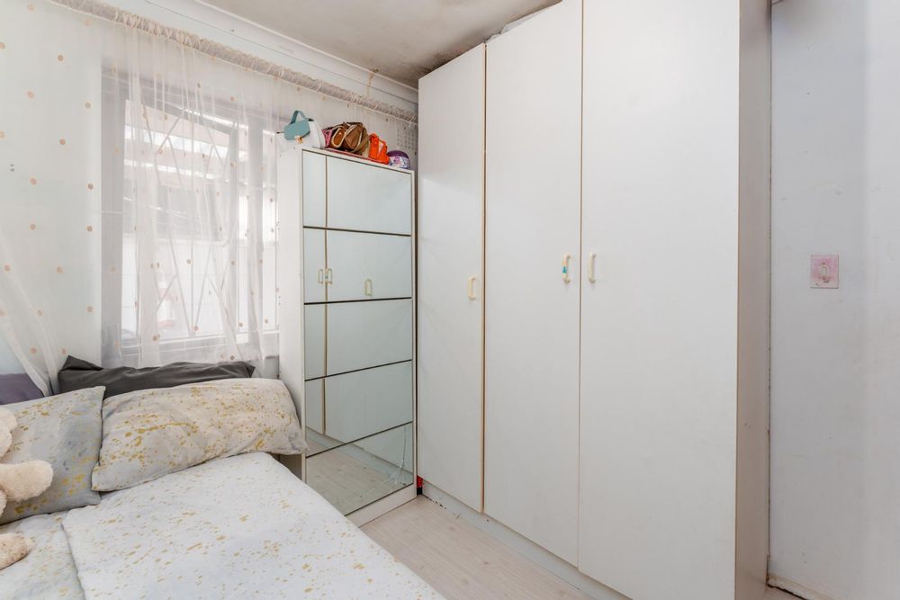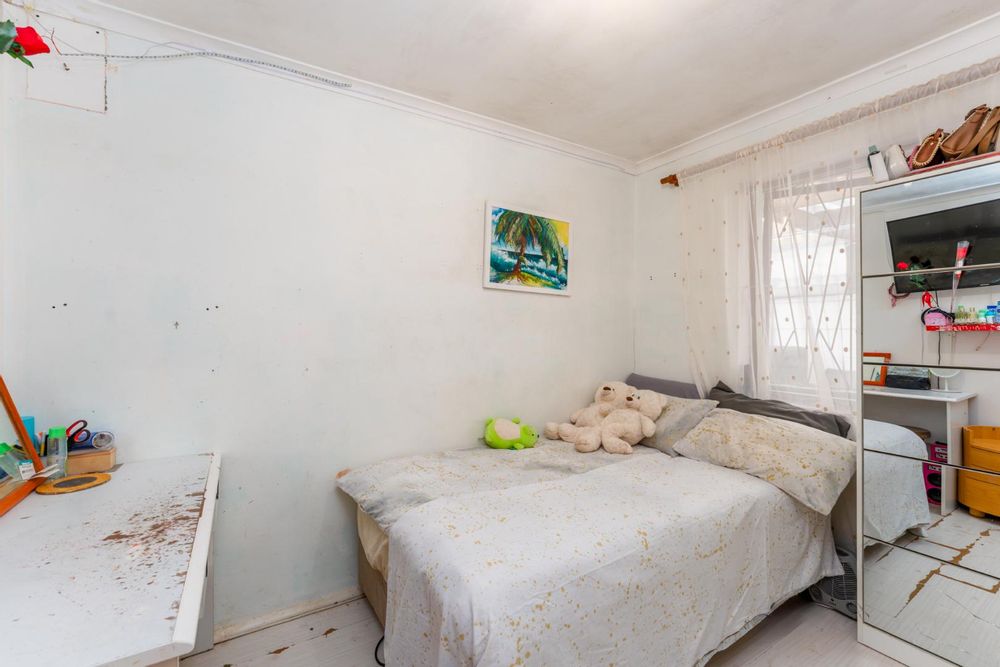 The home features two generously sized bedrooms, with the main bedroom offering extra space and natural light. A neatly tiled family bathroom includes a bath, basin, and toilet.