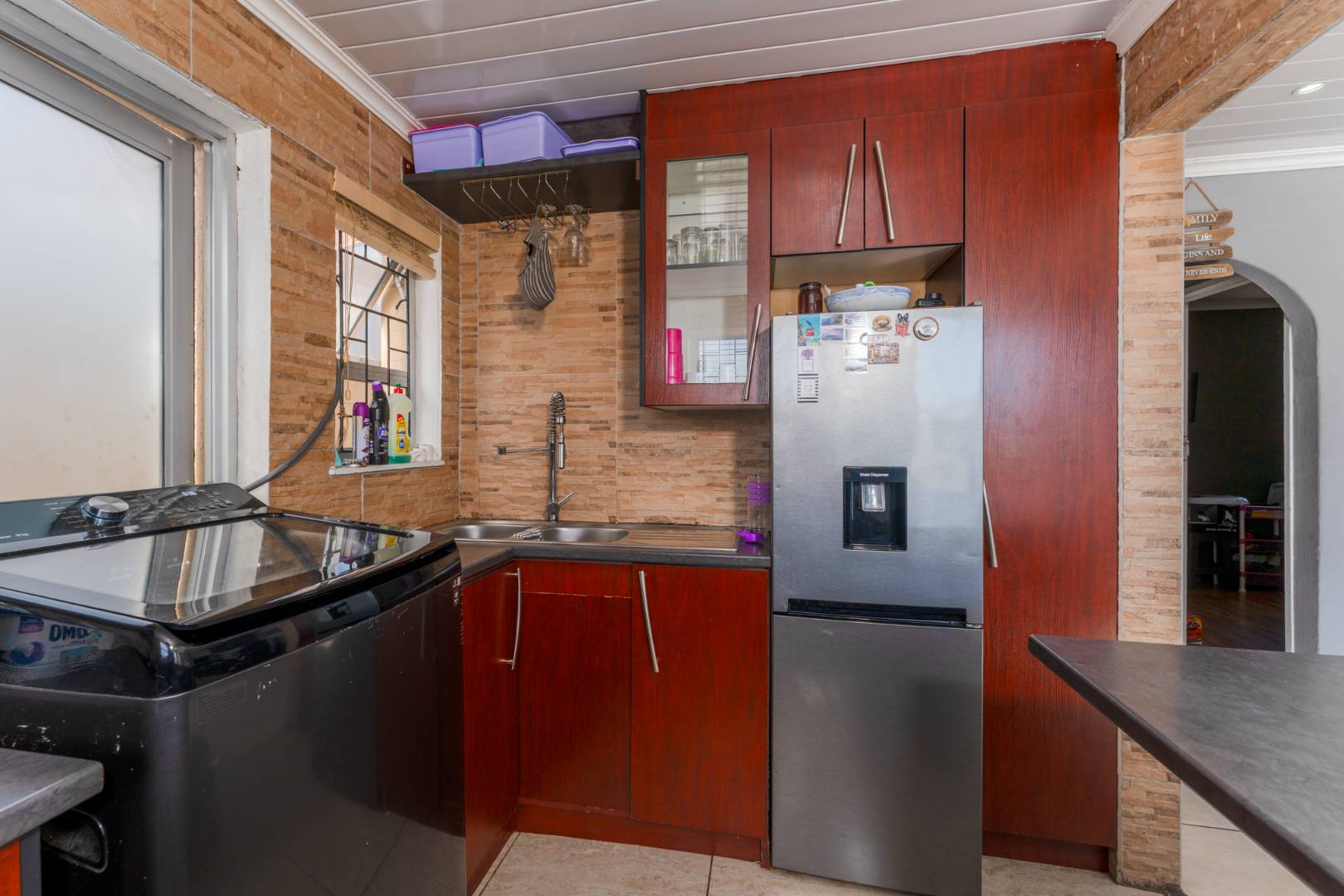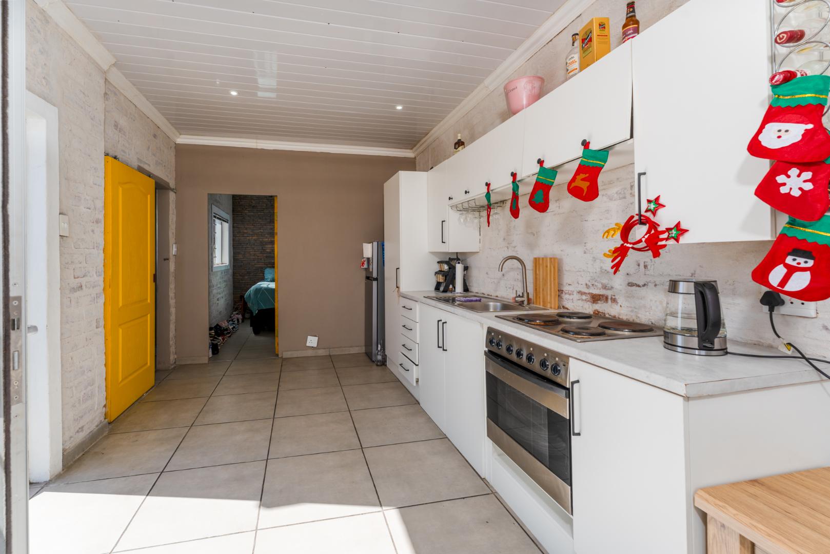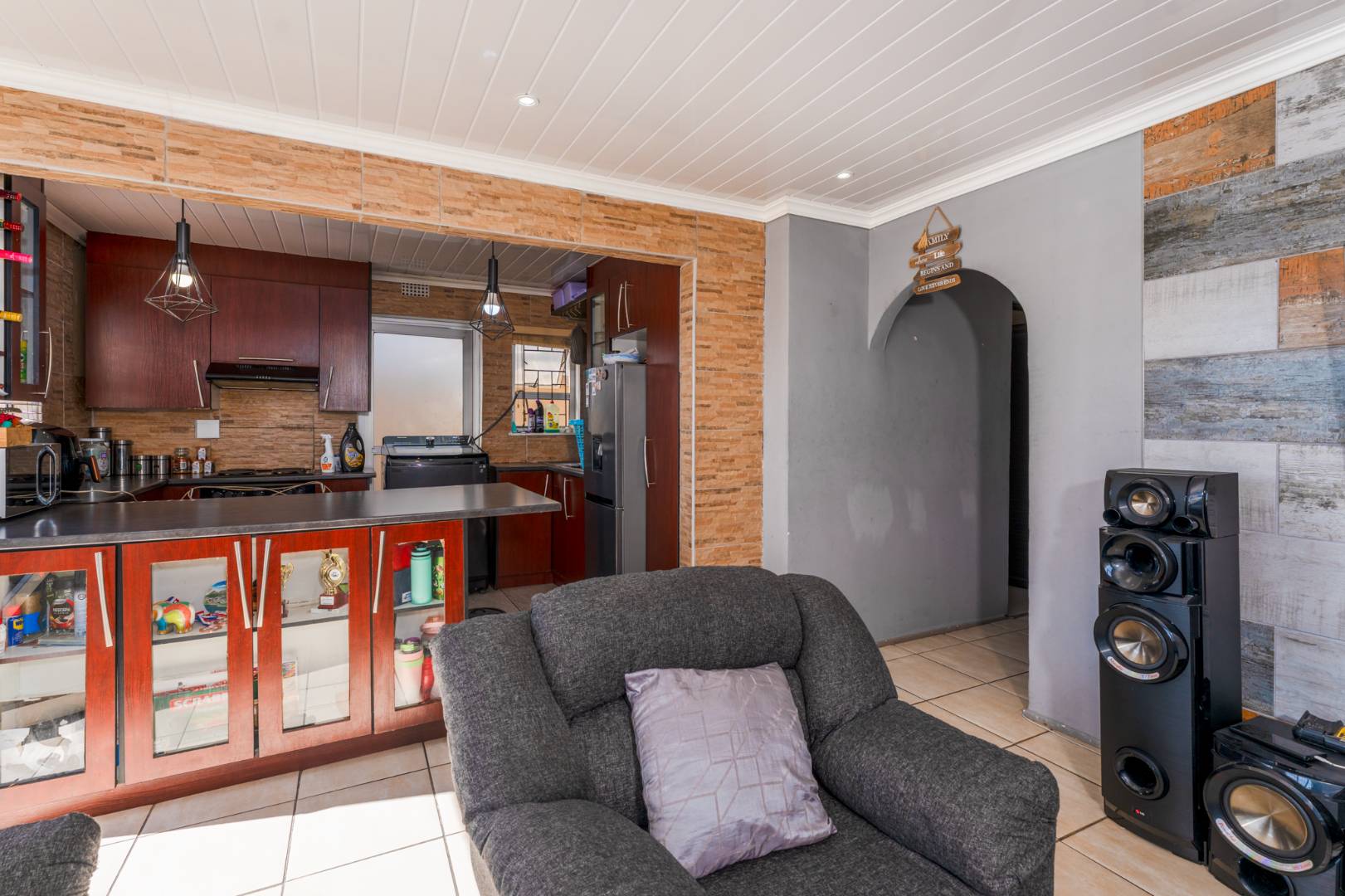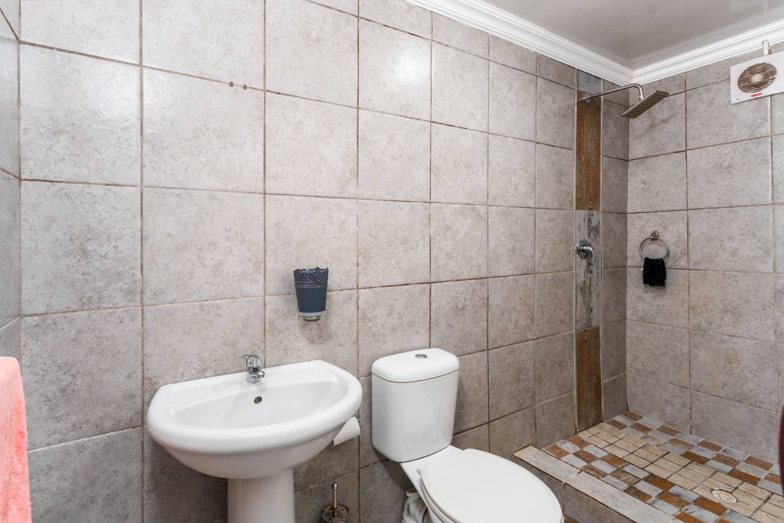 The main house features a neat open-plan kitchen and lounge area, fully tiled and offering ample built-in cupboard space for convenient storage. The home boasts three well-sized bedrooms, all fitted with built-in cupboards and laminated flooring. The main bedroom is generously sized and enhanced with a stylish feature wall. A full family bathroom completes the main house, fitted with a sunken bath, shower, toilet, and basin.