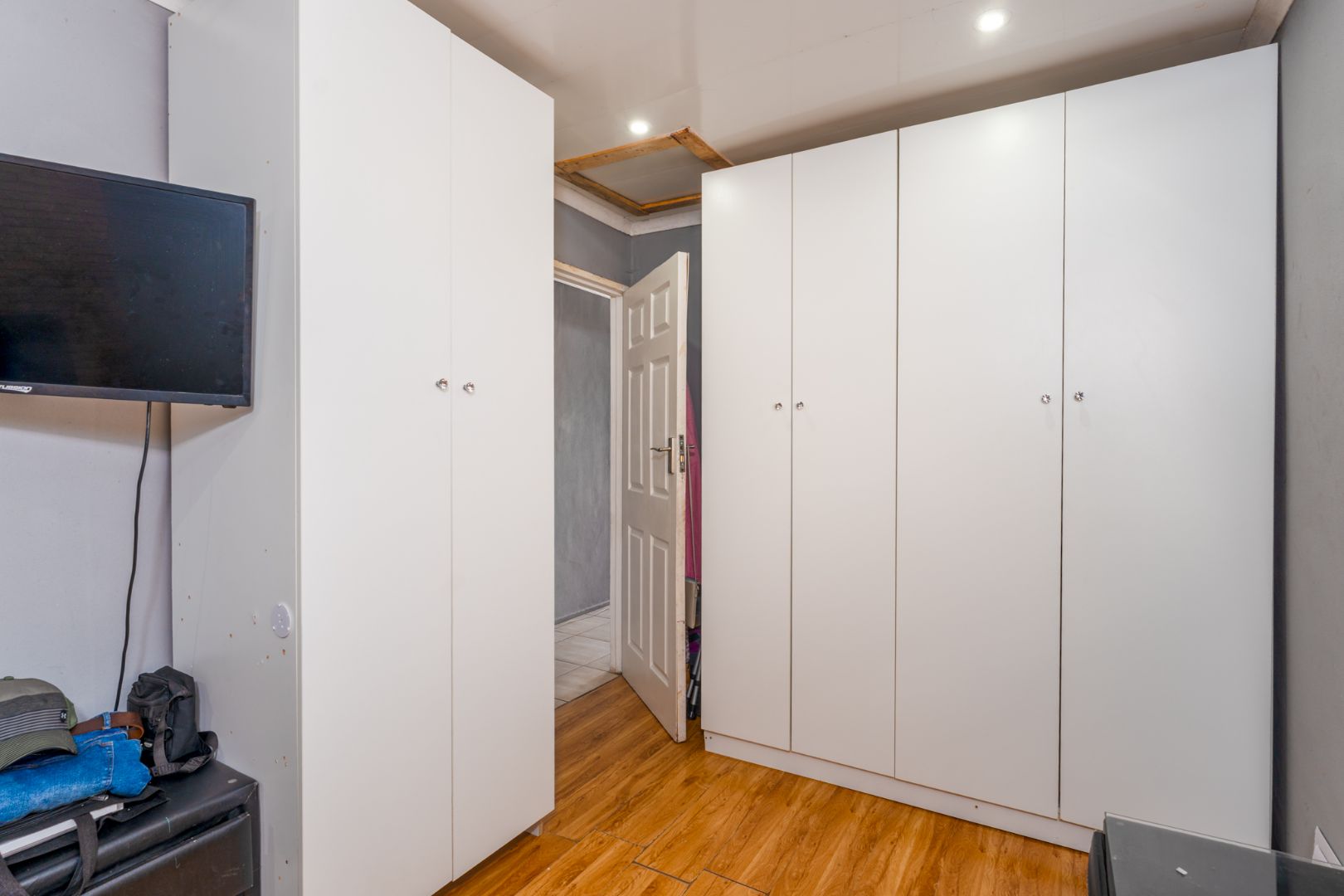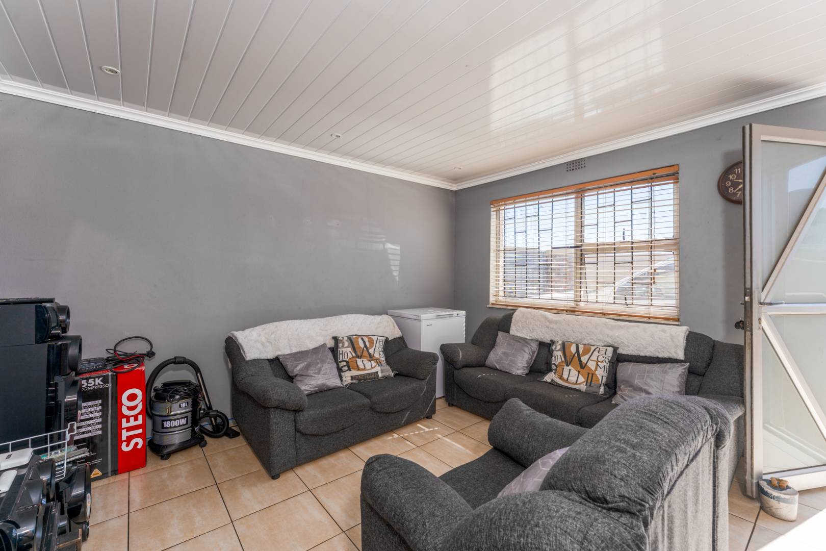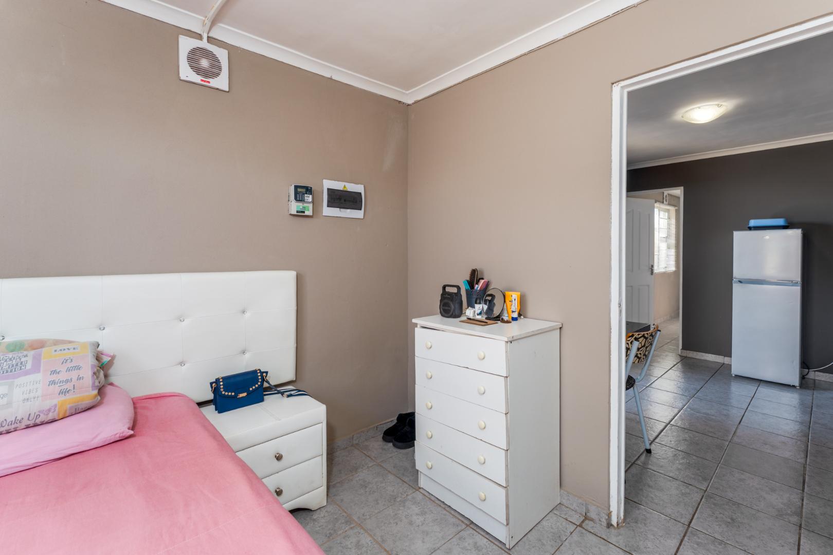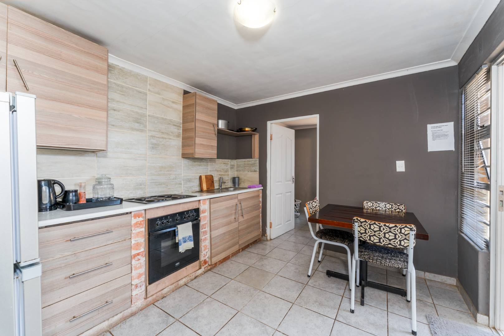 The main house features a neat open-plan kitchen and lounge area, fully tiled and offering ample built-in cupboard space for convenient storage. The home boasts three well-sized bedrooms, all fitted with built-in cupboards and laminated flooring. The main bedroom is generously sized and enhanced with a stylish feature wall. A full family bathroom completes the main house, fitted with a sunken bath, shower, toilet, and basin.