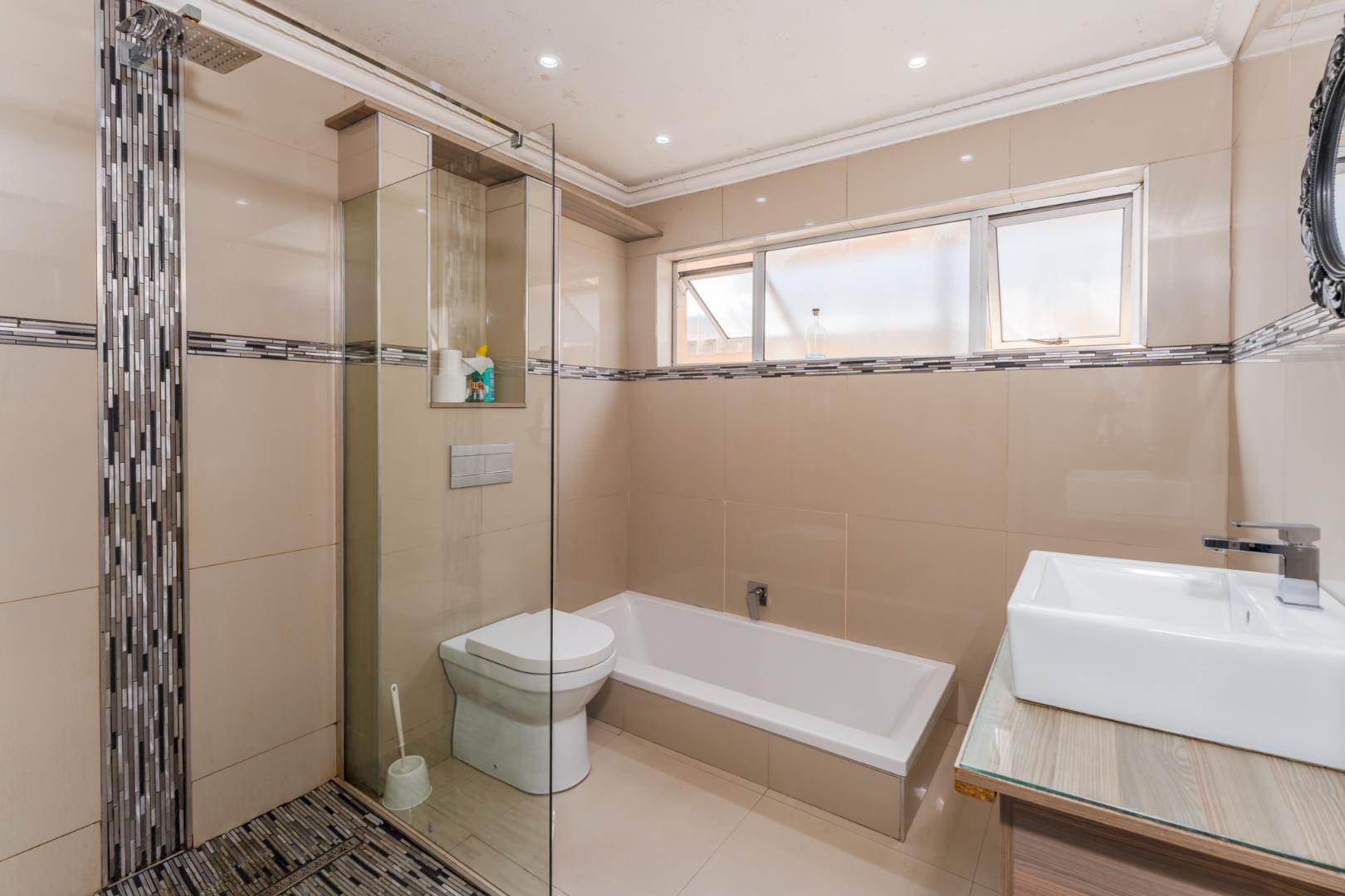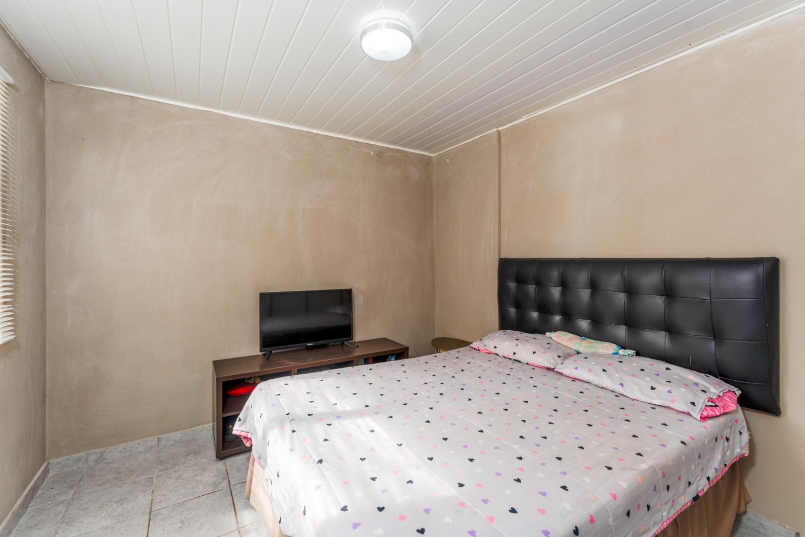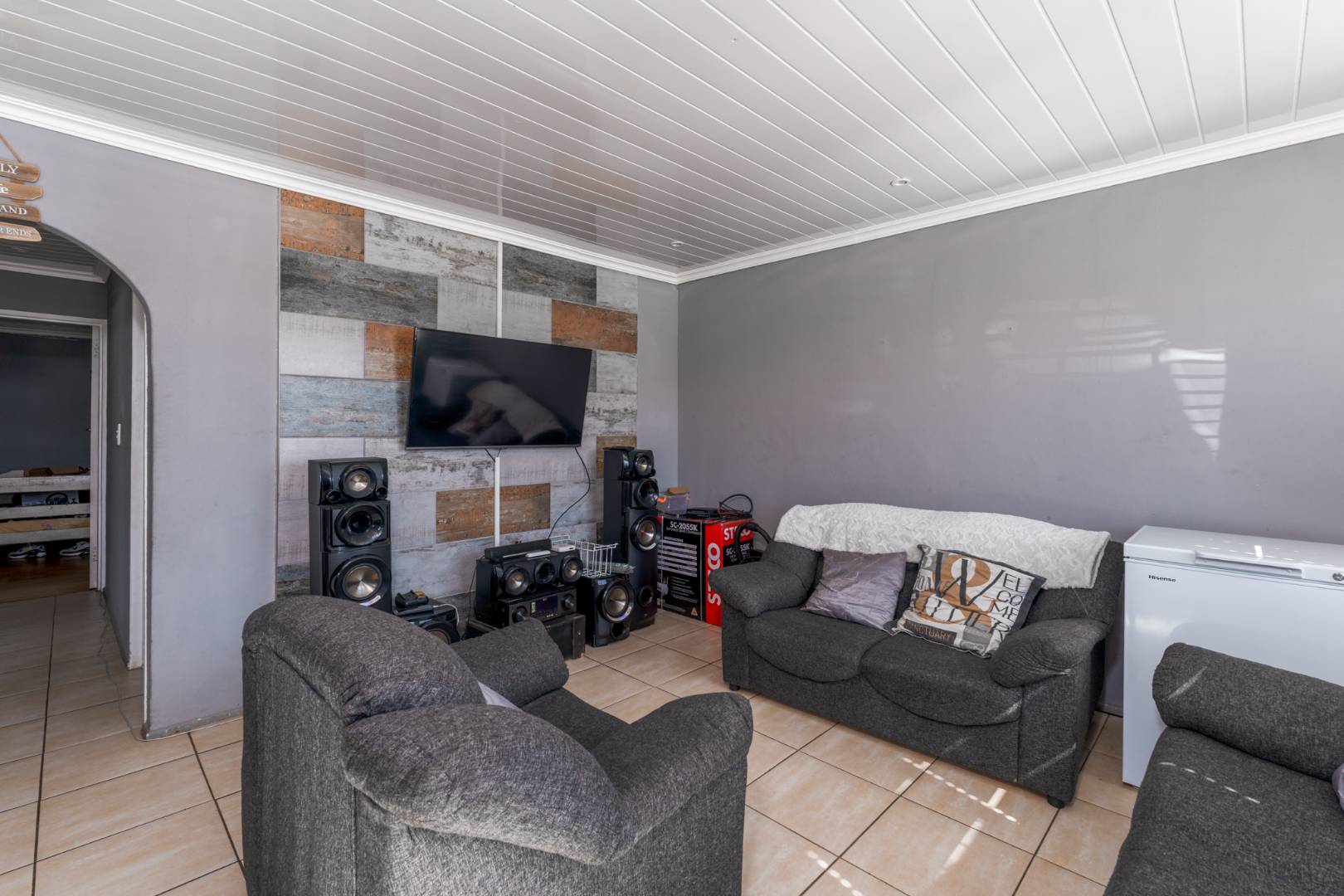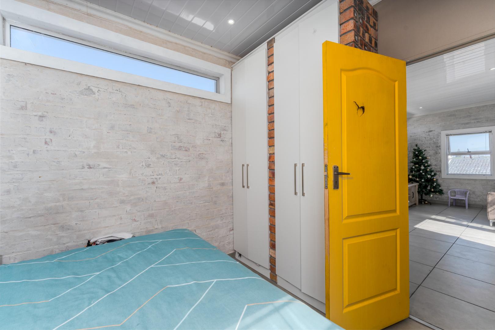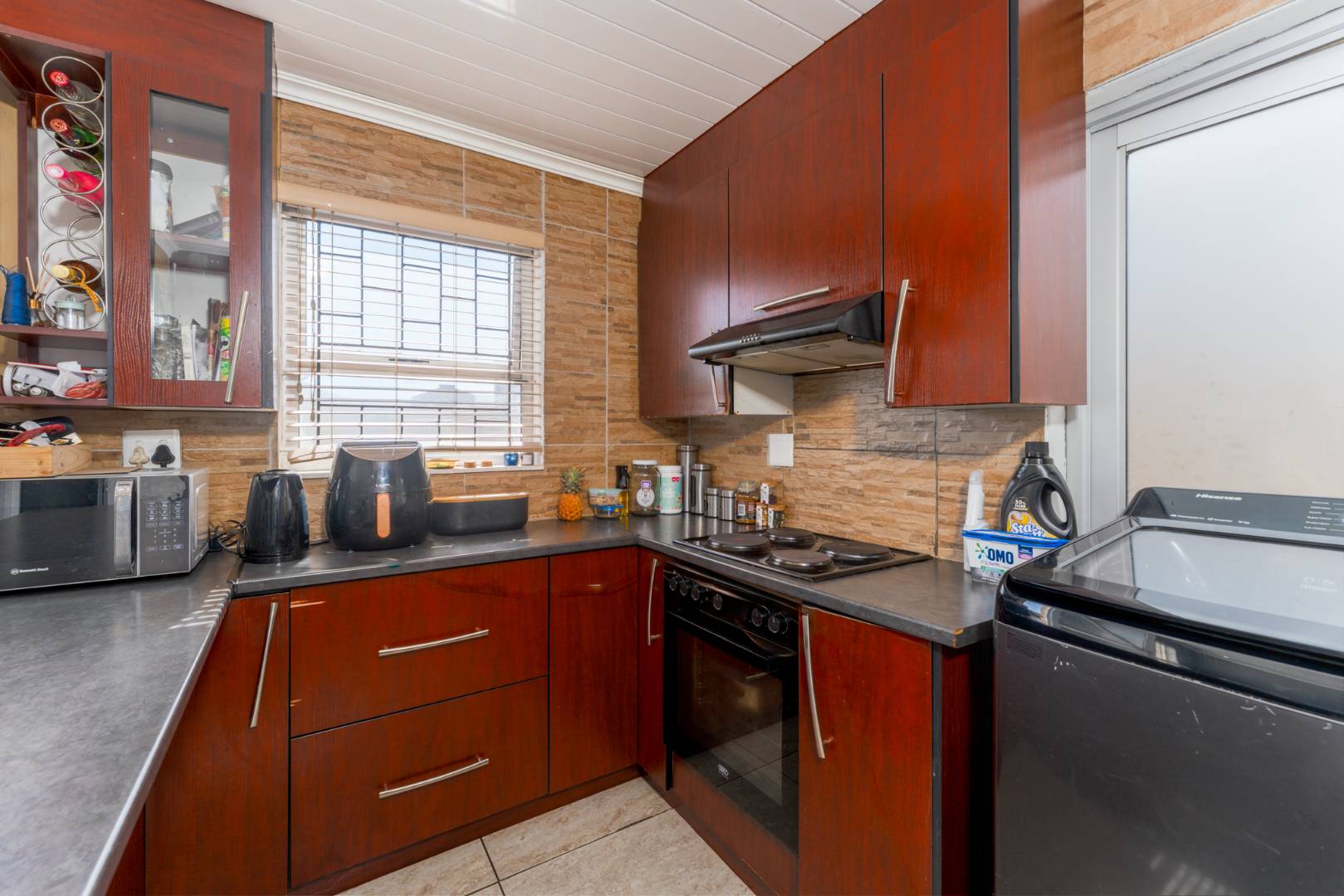 The main house features a neat open-plan kitchen and lounge area, fully tiled and offering ample built-in cupboard space for convenient storage. The home boasts three well-sized bedrooms, all fitted with built-in cupboards and laminated flooring. The main bedroom is generously sized and enhanced with a stylish feature wall. A full family bathroom completes the main house, fitted with a sunken bath, shower, toilet, and basin.