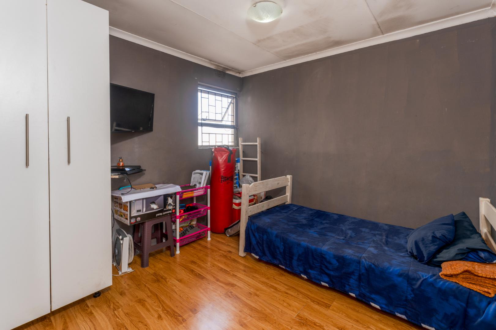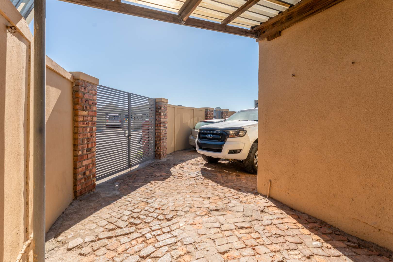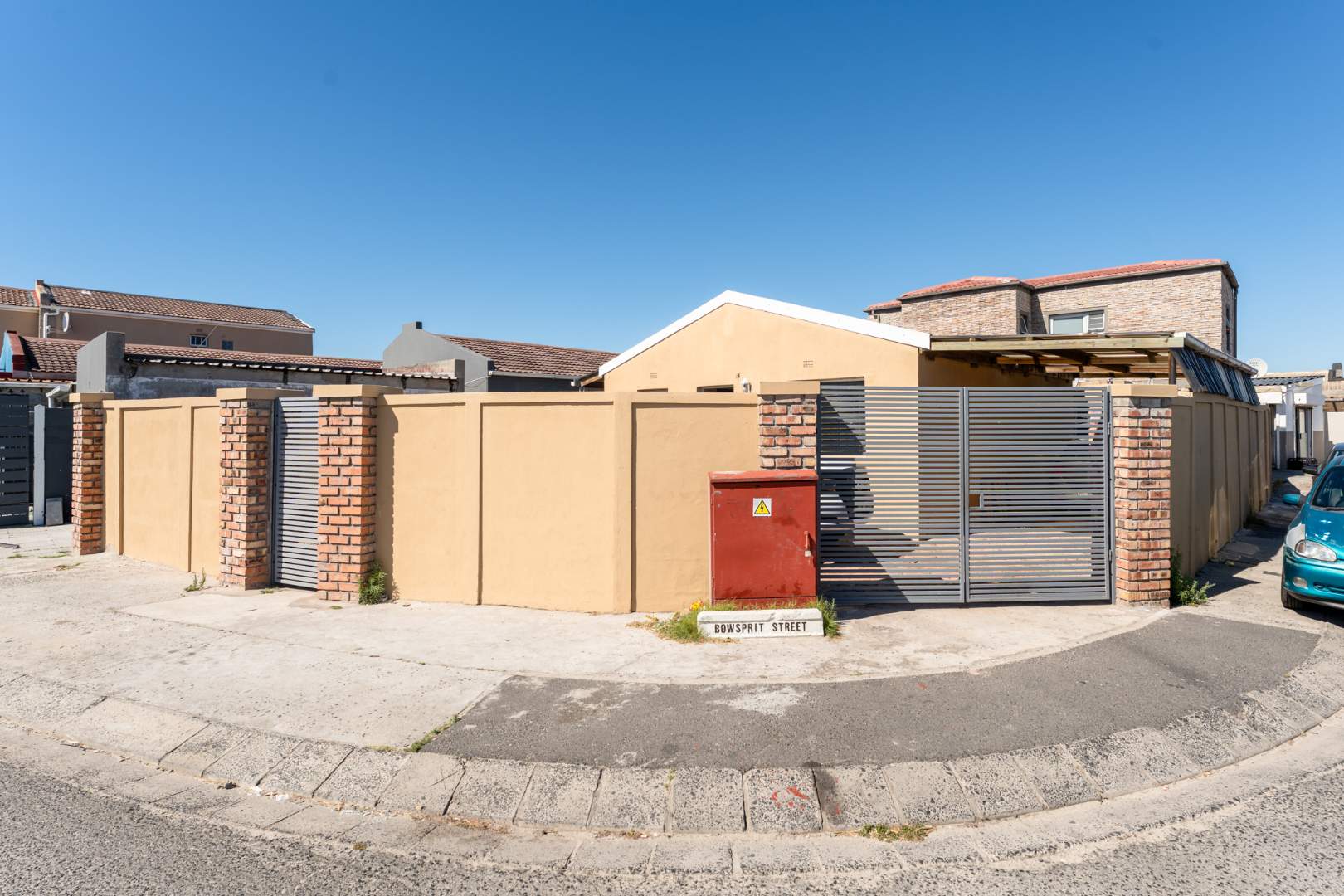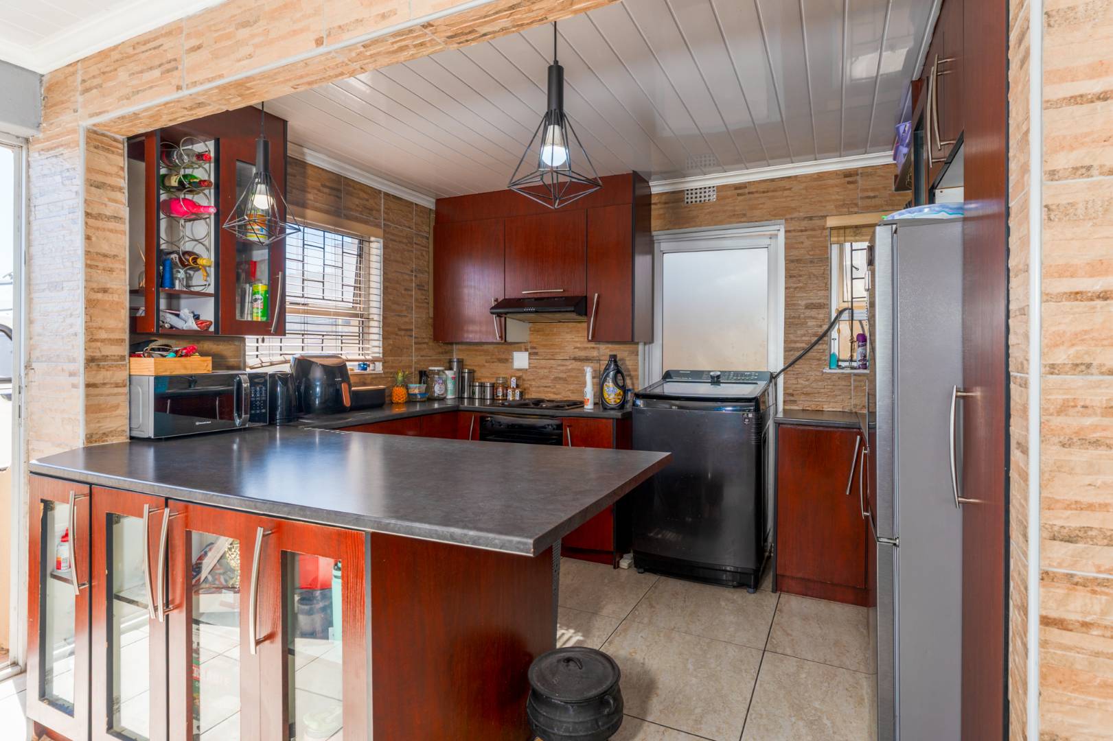 The main house features a neat open-plan kitchen and lounge area, fully tiled and offering ample built-in cupboard space for convenient storage. The home boasts three well-sized bedrooms, all fitted with built-in cupboards and laminated flooring. The main bedroom is generously sized and enhanced with a stylish feature wall. A full family bathroom completes the main house, fitted with a sunken bath, shower, toilet, and basin.