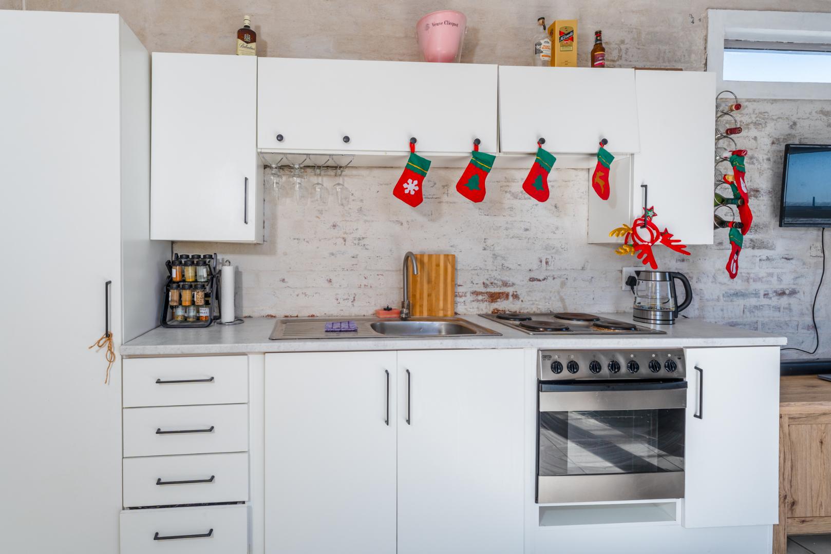 Separate Entrance Two is a charming loft-style unit featuring an open-plan kitchen and lounge area, fully tiled and fitted with built-in cupboards. The bathroom includes a shower, basin, and toilet. The exterior of this unit is beautifully finished with attractive rock cladding, adding character and visual appeal.