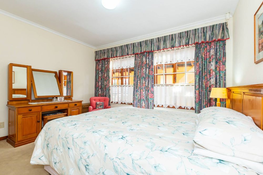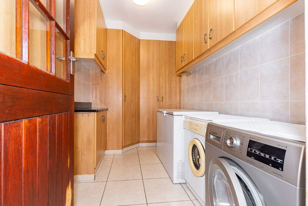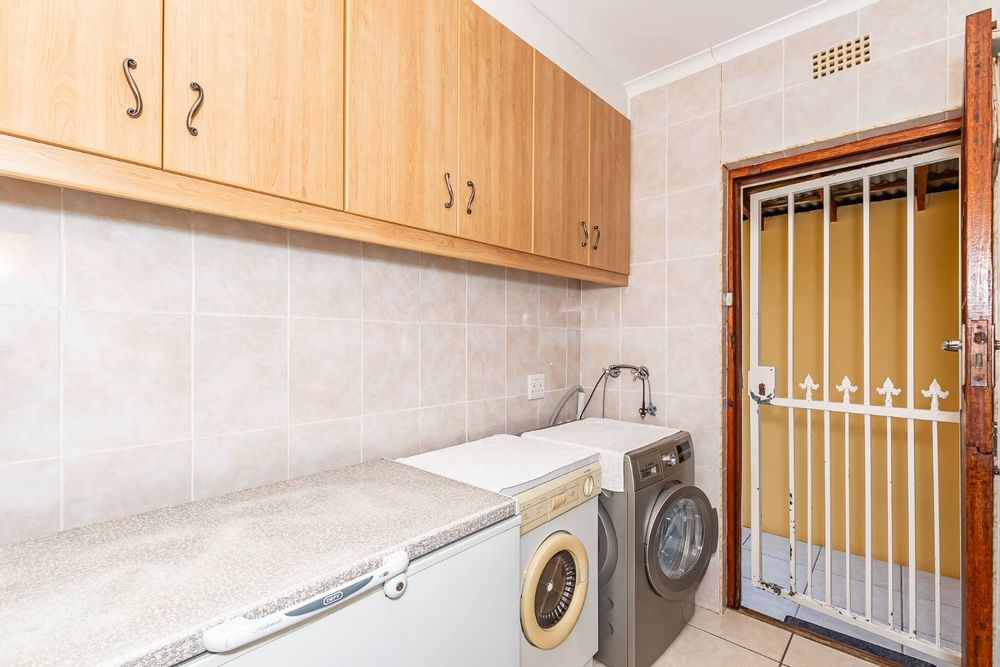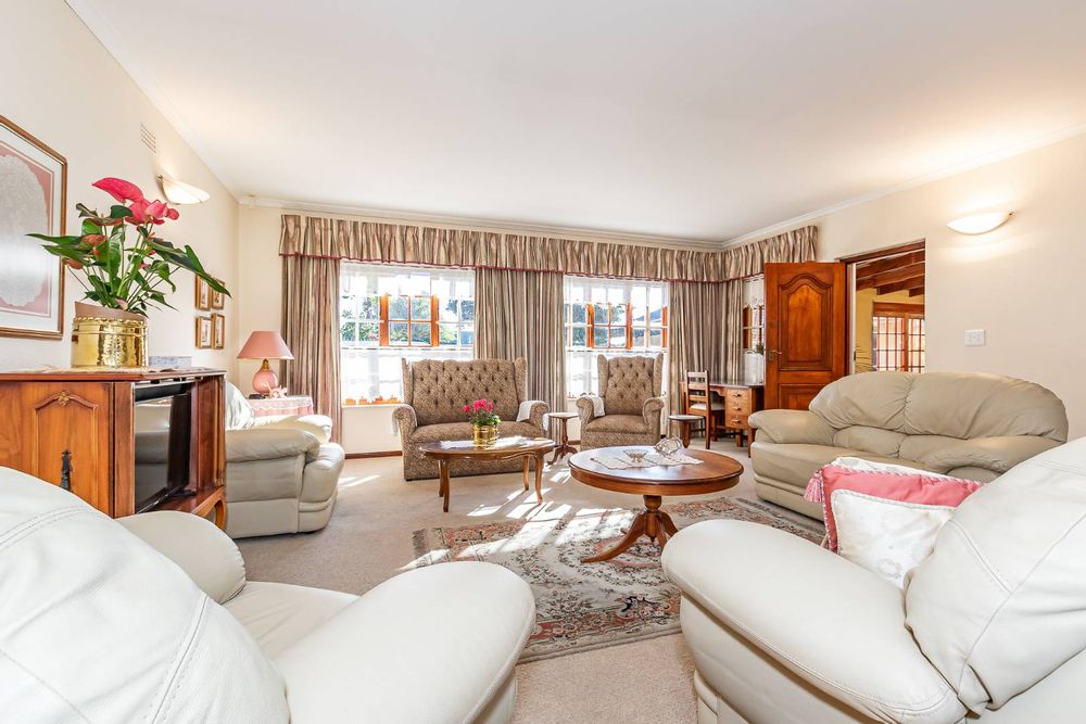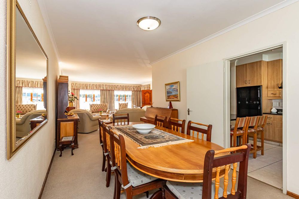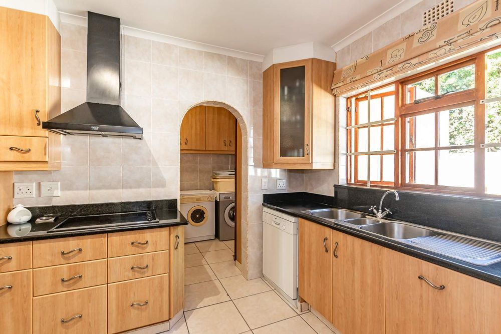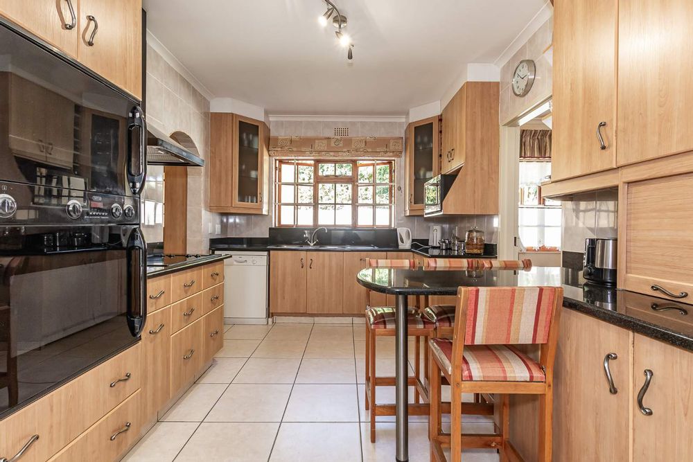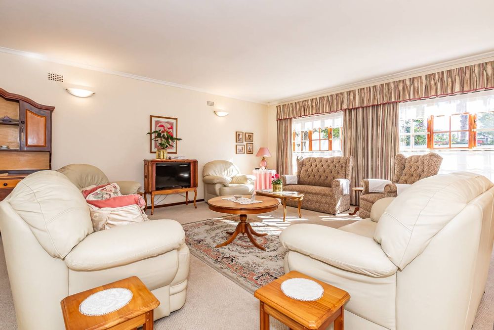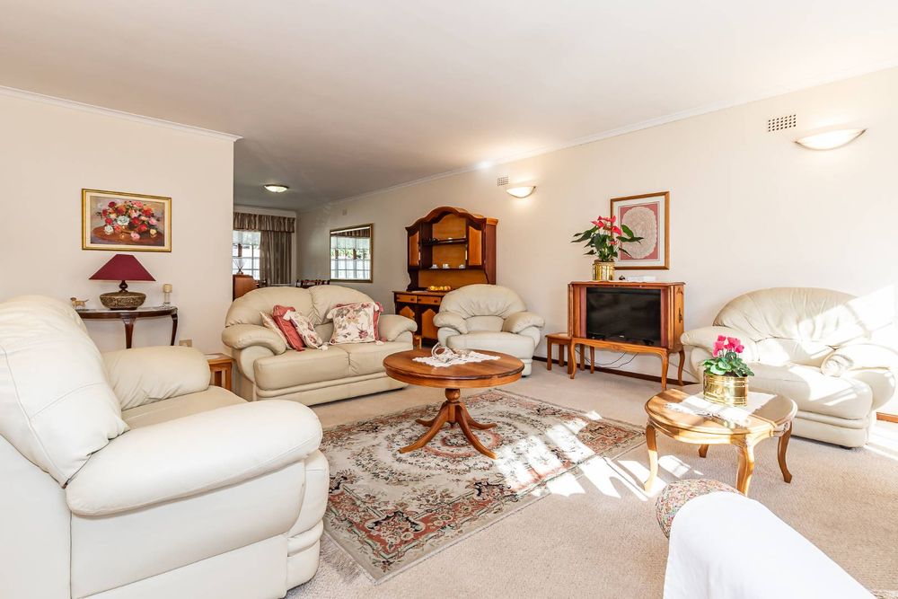Inside, a spacious sunroom welcomes you and leads into an elegant, carpeted lounge and formal dining area — both filled with natural light. The large, well-appointed kitchen boasts a double eye-level oven, a stove with hob, and abundant counter and cupboard space. A separate scullery with plumbing connections enhances convenience and keeps the main kitchen area tidy.