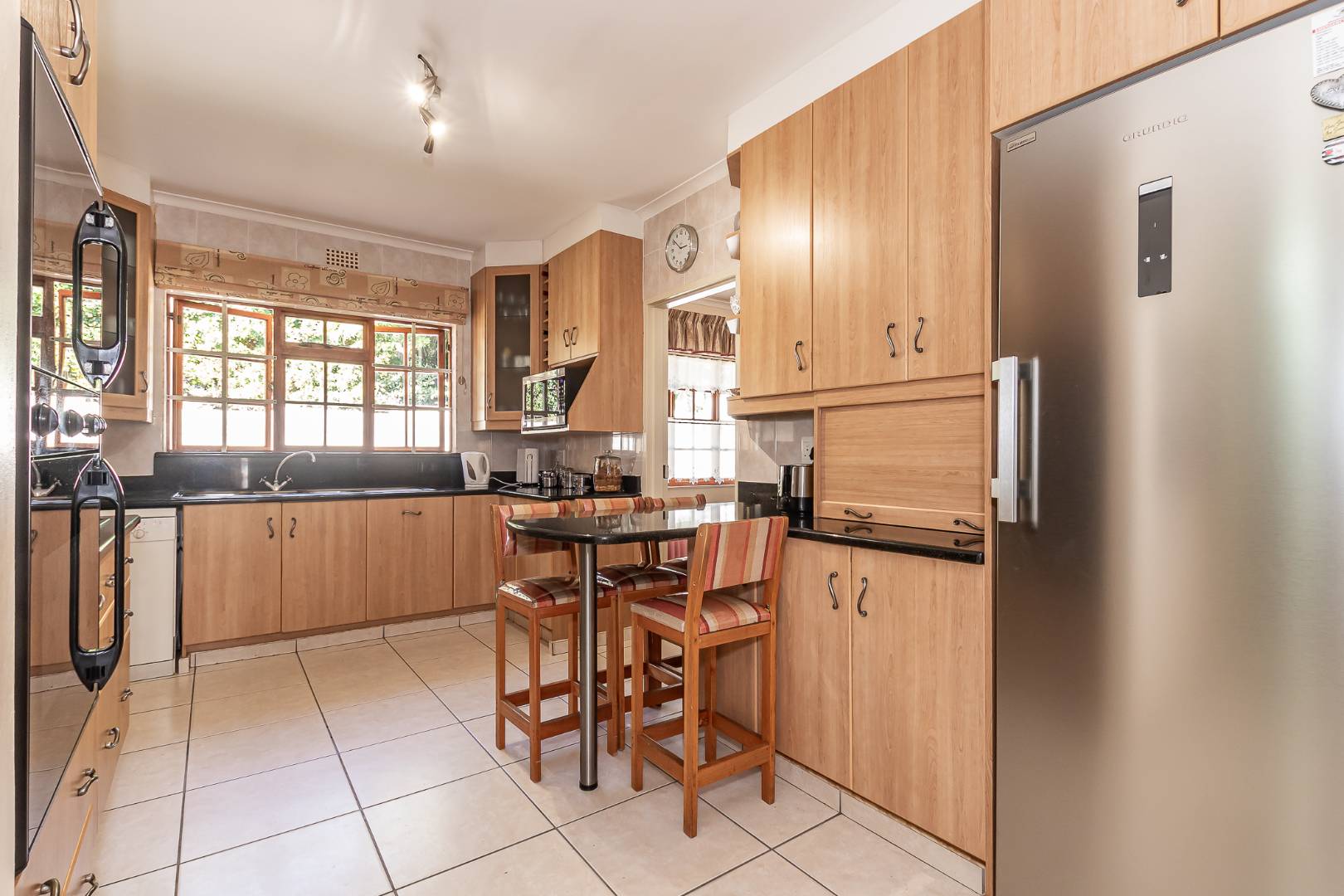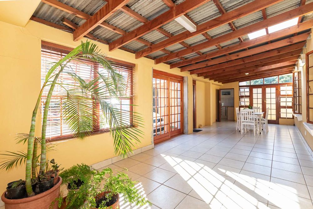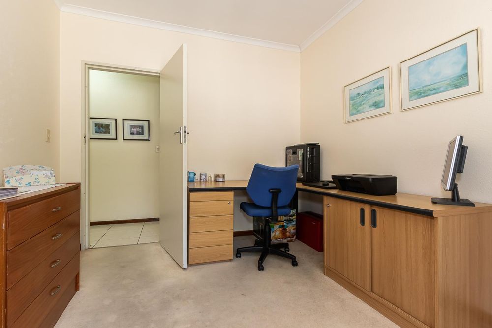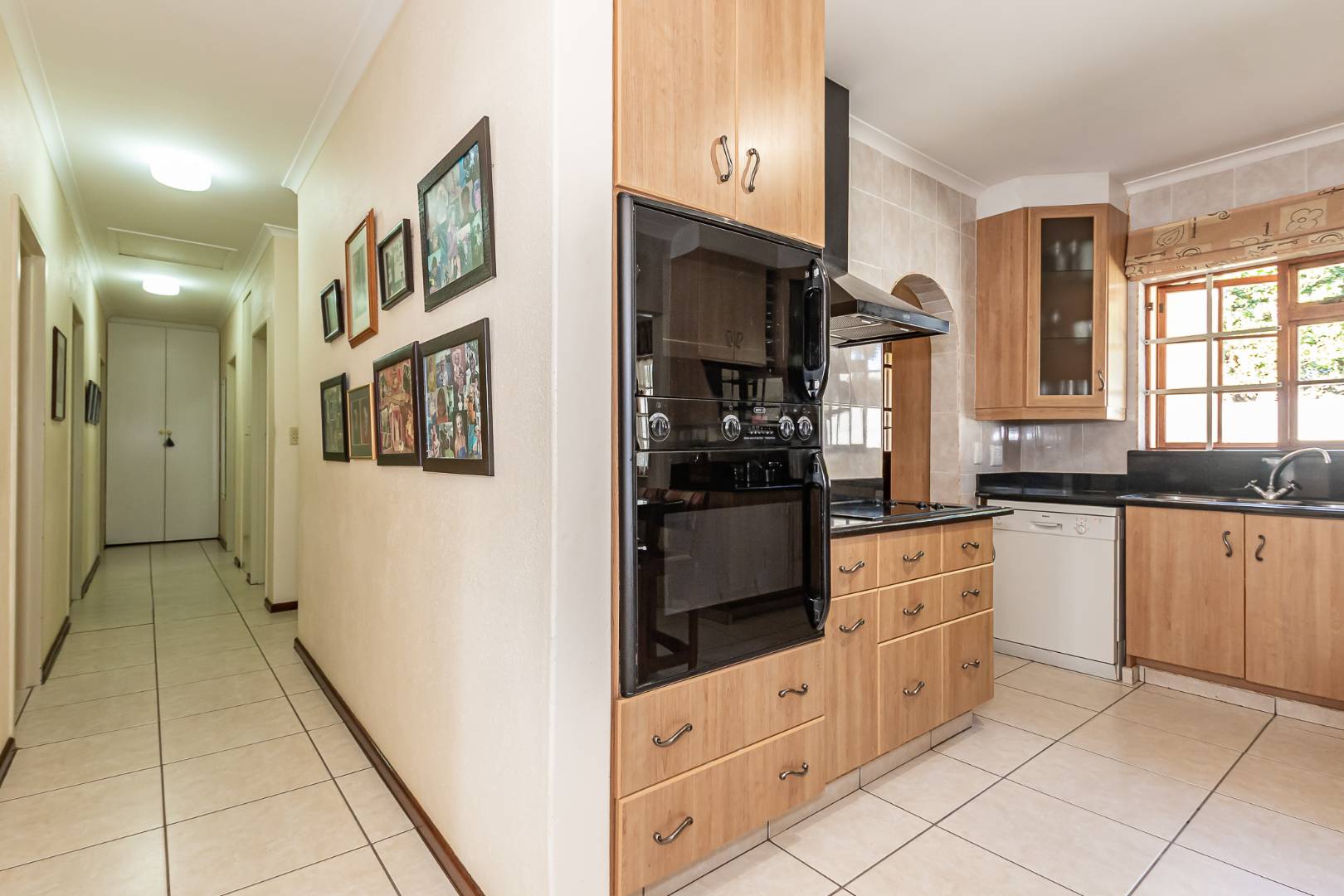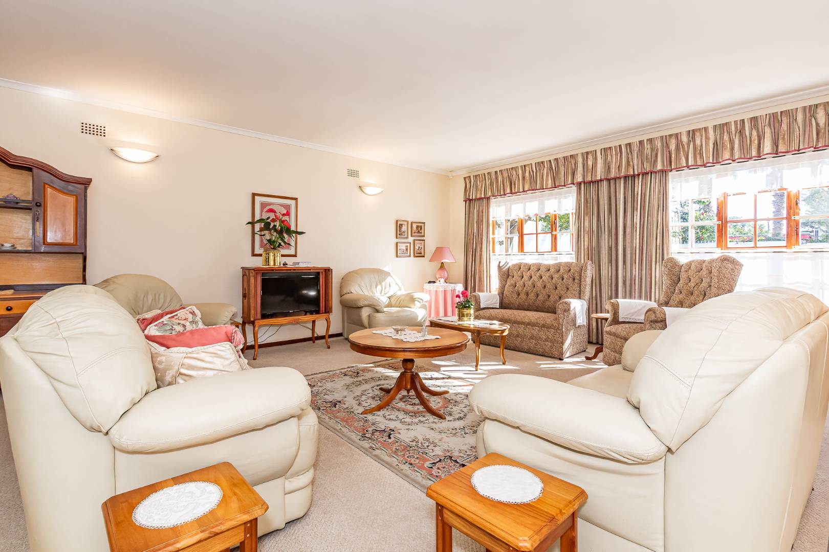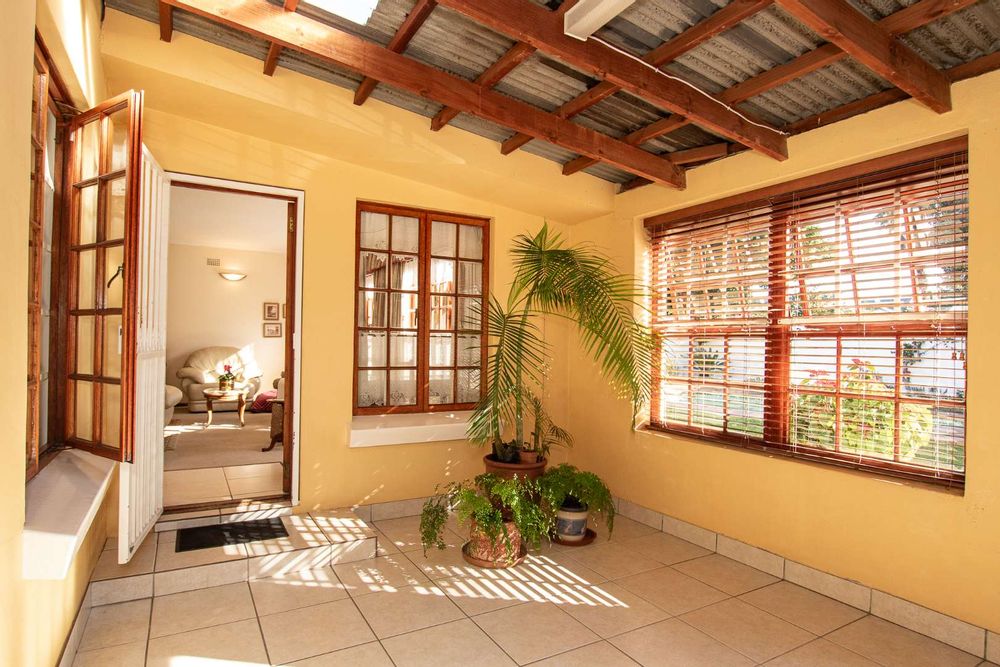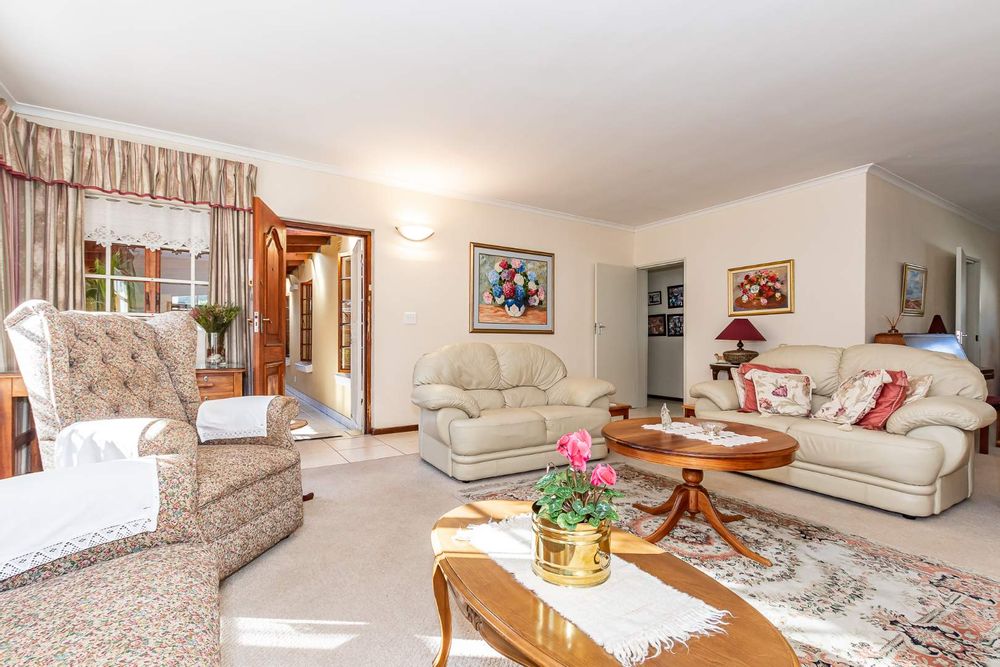Inside, a spacious sunroom welcomes you and leads into an elegant, carpeted lounge and formal dining area — both filled with natural light. The large, well-appointed kitchen boasts a double eye-level oven, a stove with hob, and abundant counter and cupboard space. A separate scullery with plumbing connections enhances convenience and keeps the main kitchen area tidy.