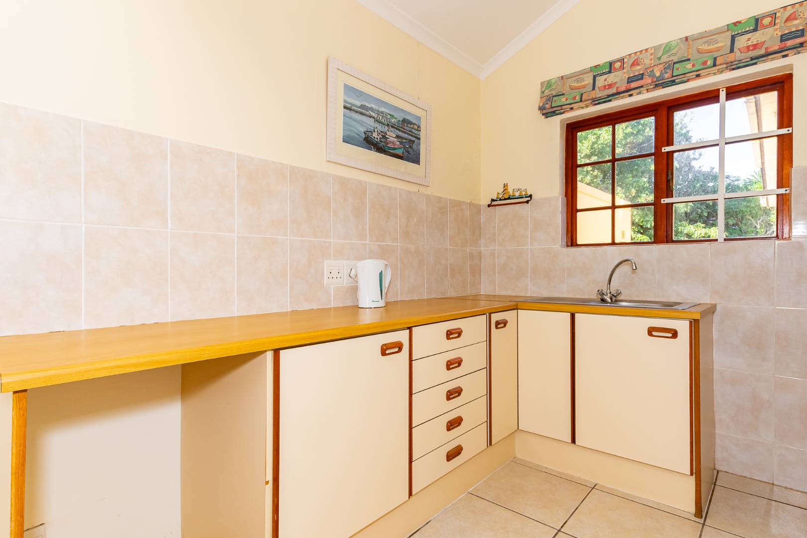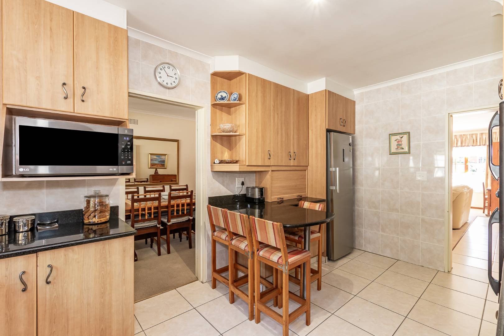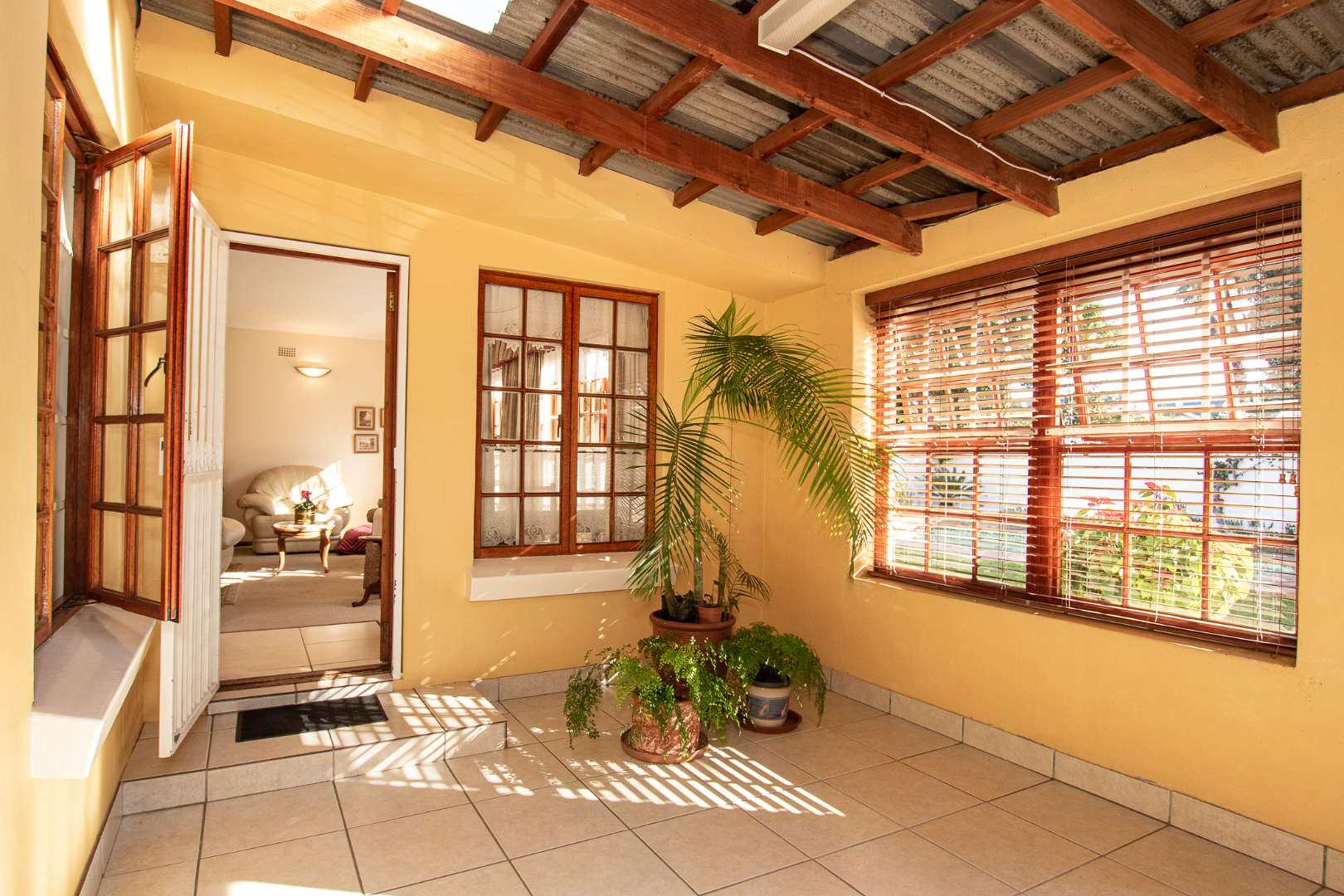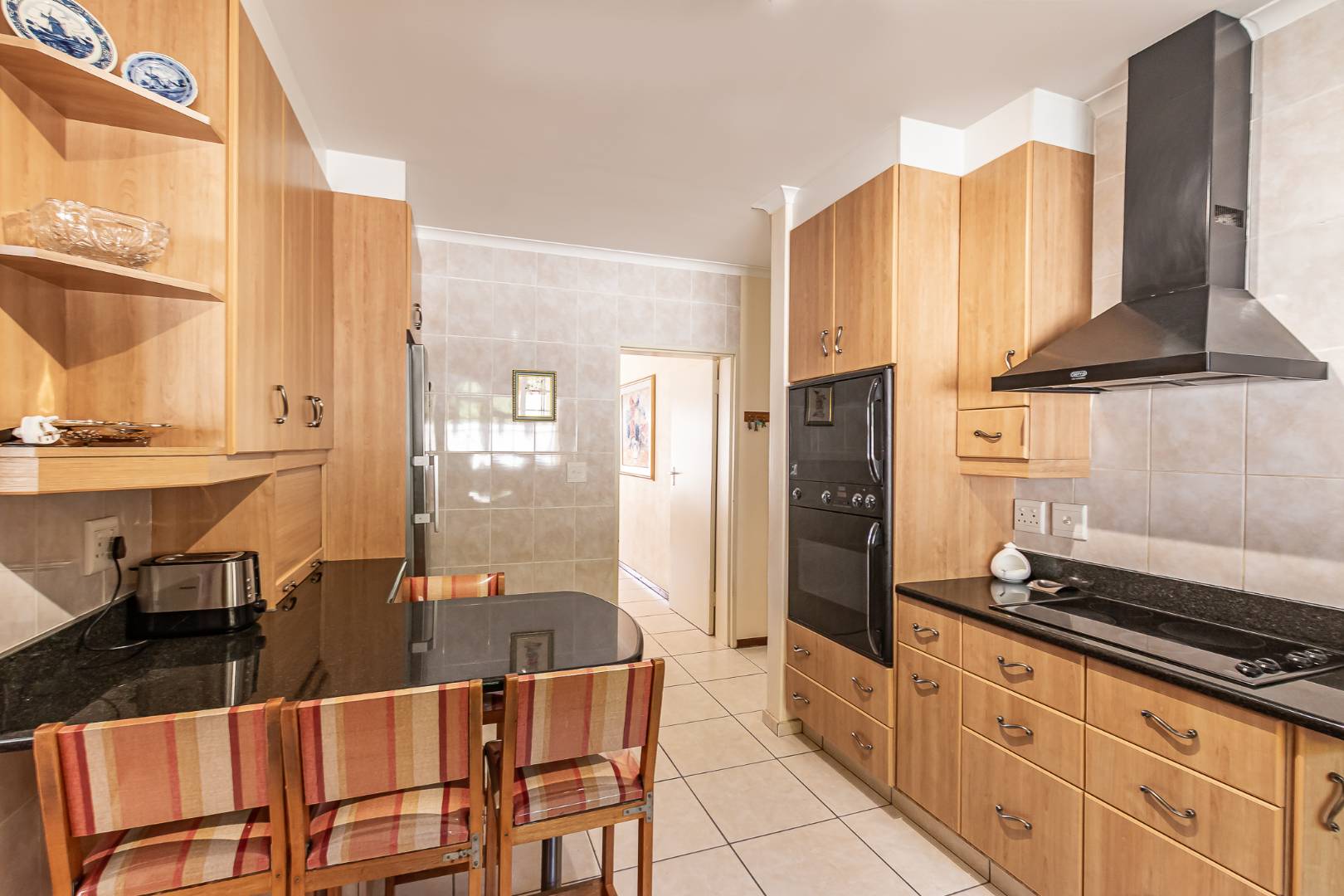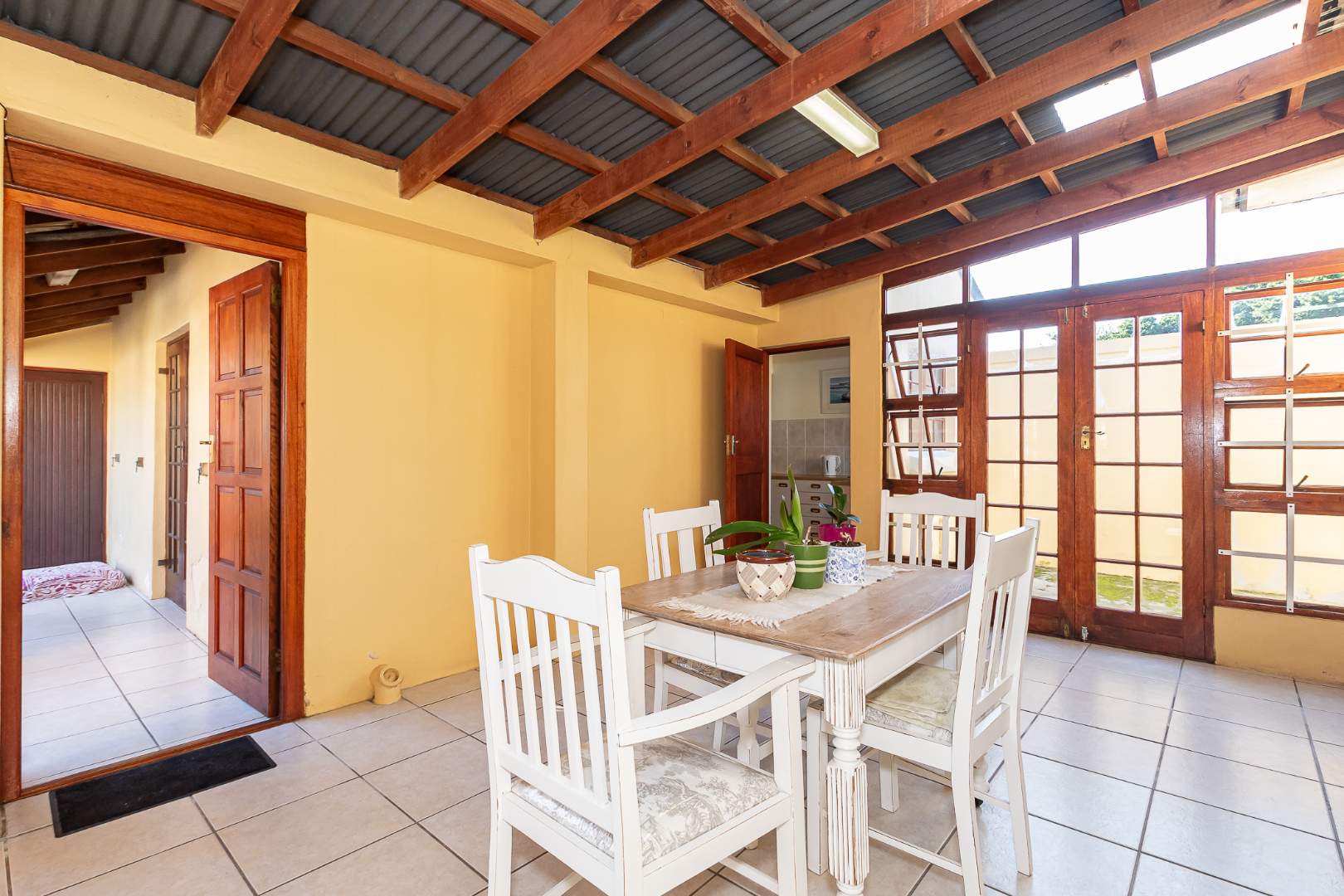Inside, a spacious sunroom welcomes you and leads into an elegant, carpeted lounge and formal dining area — both filled with natural light. The large, well-appointed kitchen boasts a double eye-level oven, a stove with hob, and abundant counter and cupboard space. A separate scullery with plumbing connections enhances convenience and keeps the main kitchen area tidy.