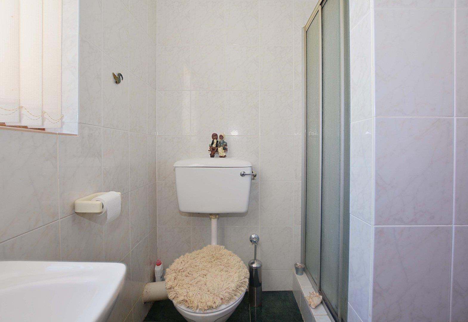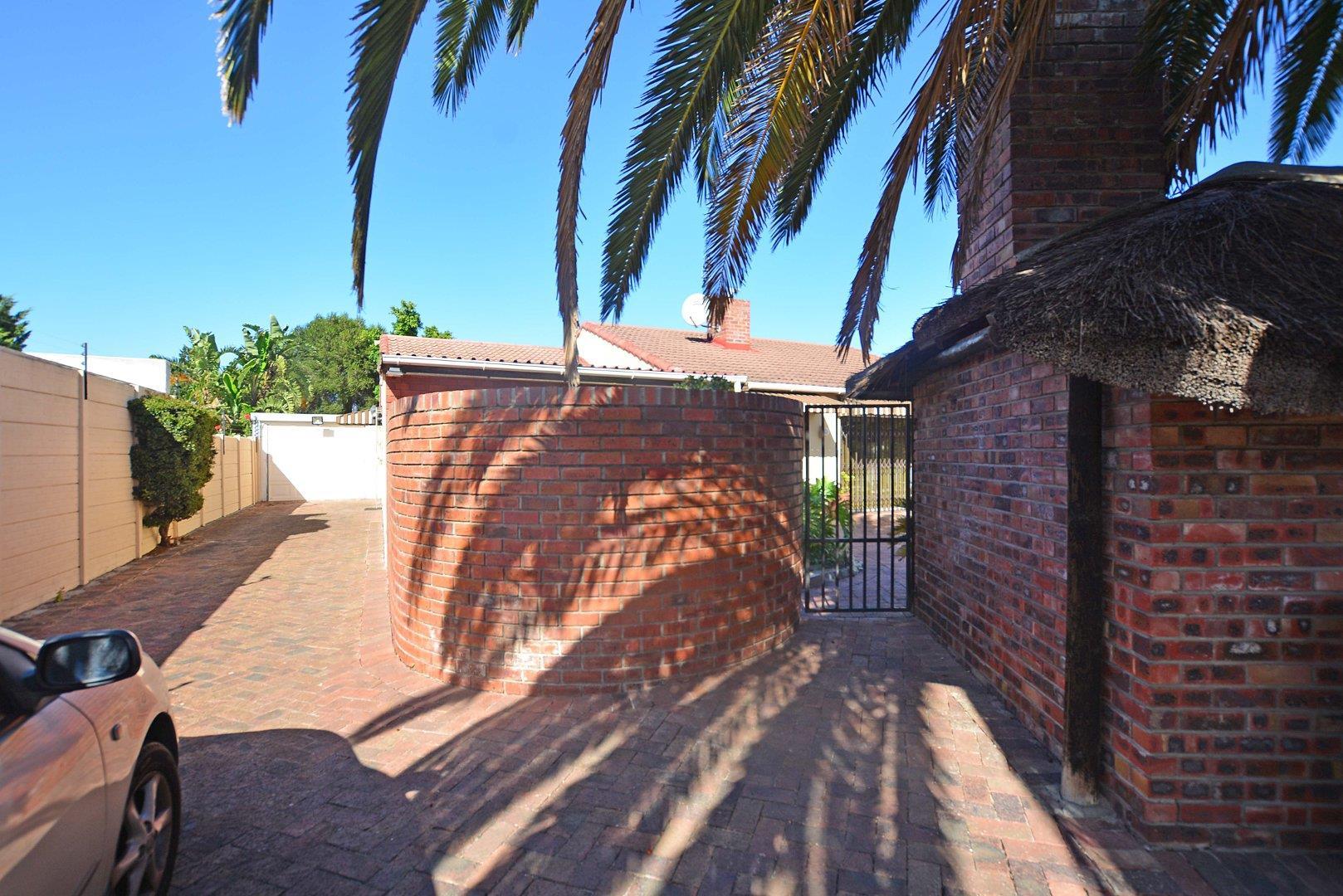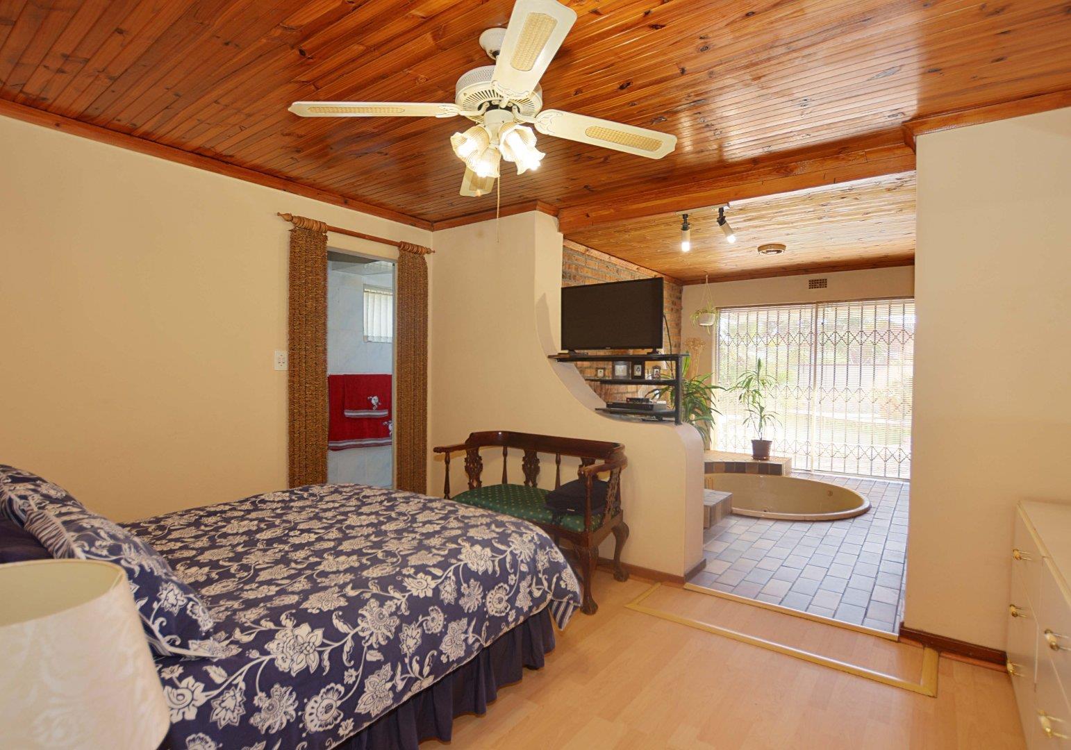 The master bedroom is a luxurious retreat with an en-suite bathroom, walk-in closets, a jacuzzi, sliding doors opening to the swimming pool, and an outdoor Lapa and braai area. The property includes a single lock-up garage and two tandem parking spaces in front of the garage. Surrounded by walls on all four sides, the property is further secured with electric fencing, additional security lights, and beams strategically placed around the premises.