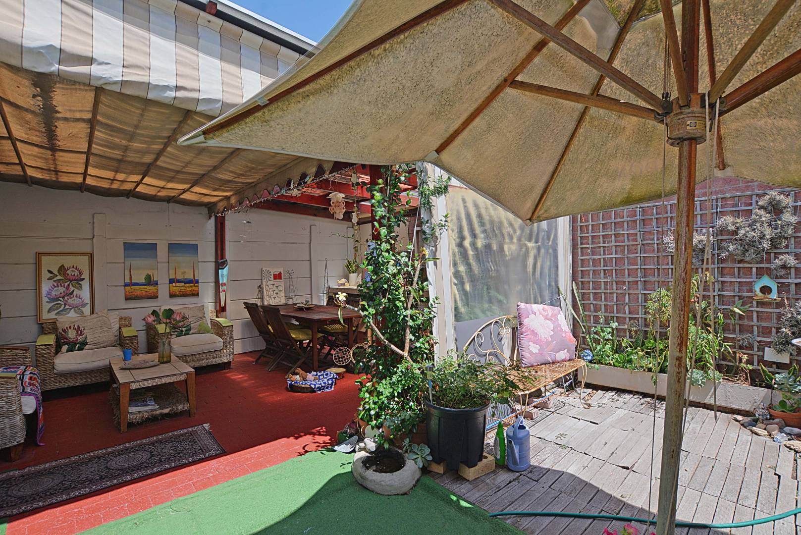 An open-plan lounge flows effortlessly into a private, low-maintenance garden—perfect for outdoor entertaining or relaxation. Enjoy all-weather comfort with a partially covered patio and a built-in braai.