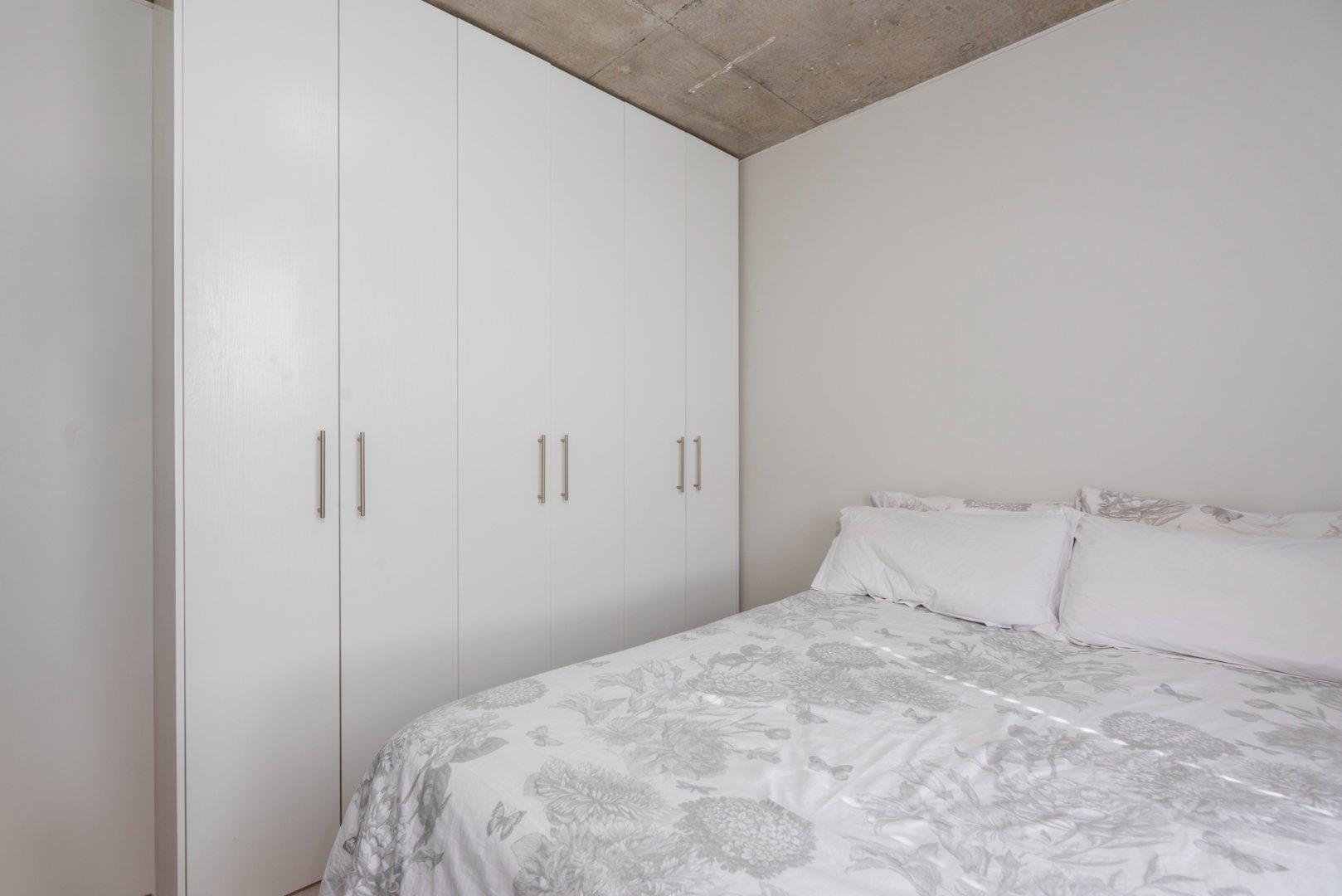 The apartment boasts a chic bathroom with a basin, toilet, and shower, ensuring comfort and convenience. The spacious bedroom is enhanced with built-in cupboards, providing ample storage space while maintaining the sleek aesthetic of the home.