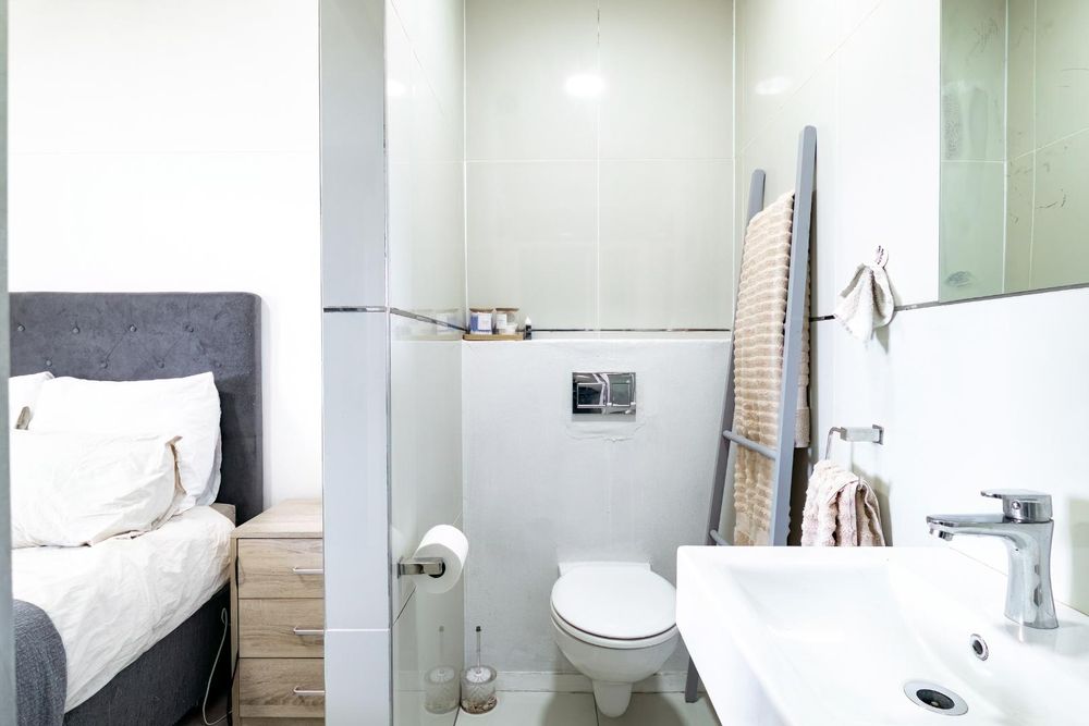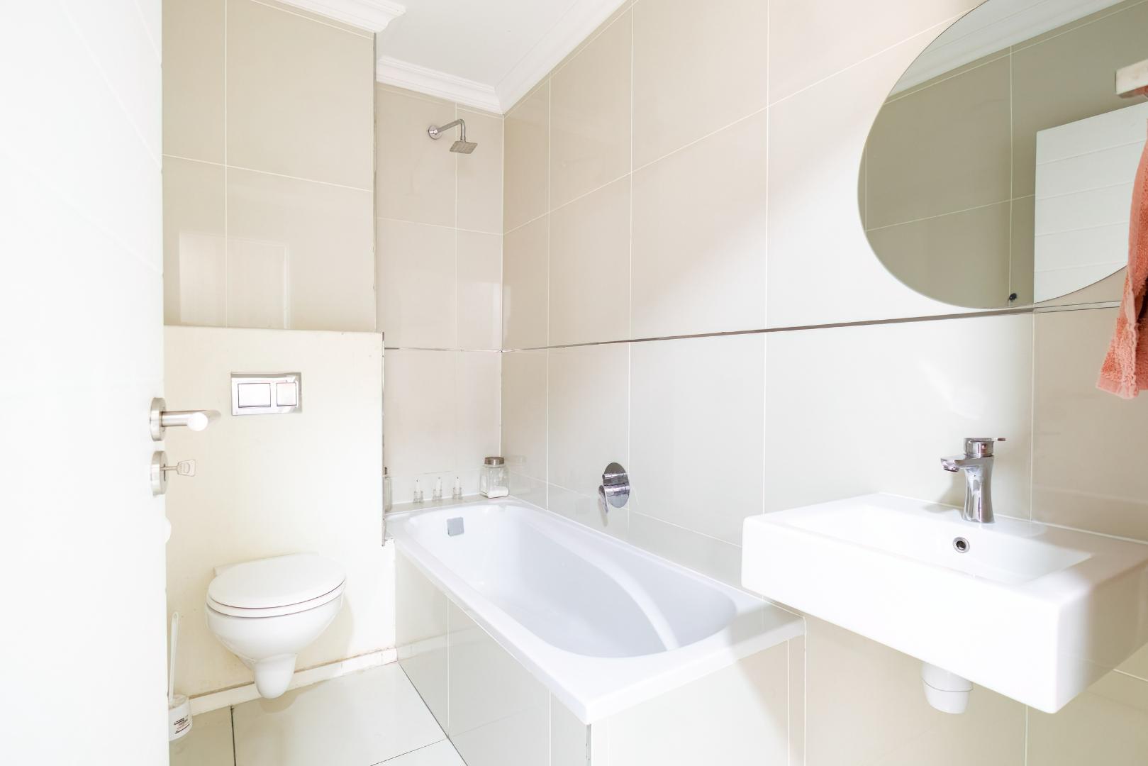 Family bathroom in neutral white tones with extractor fan.
