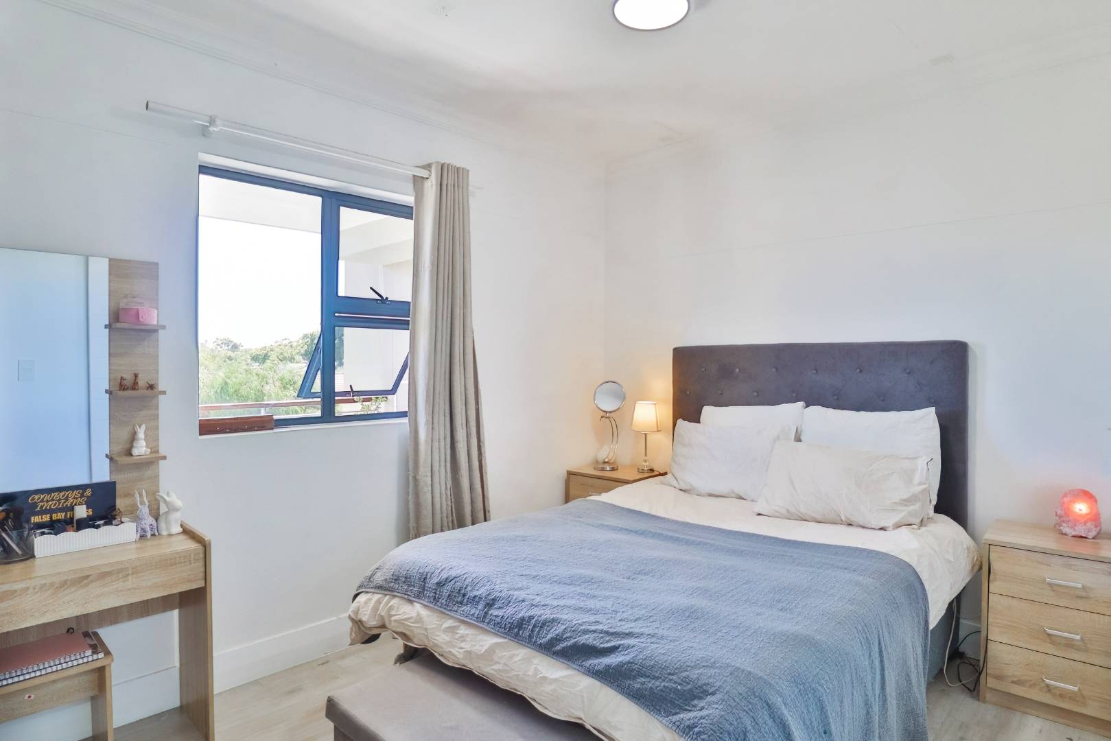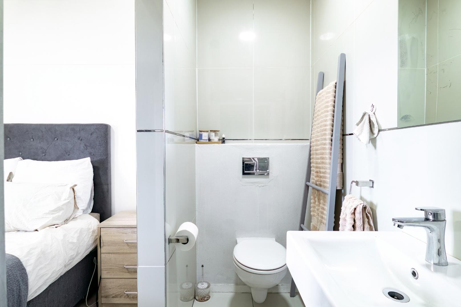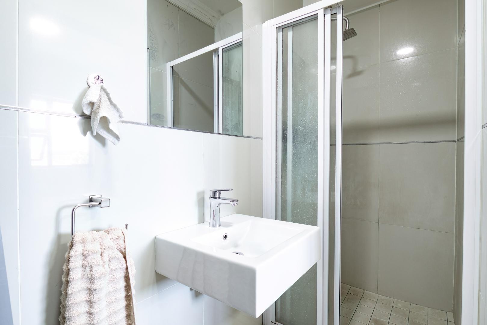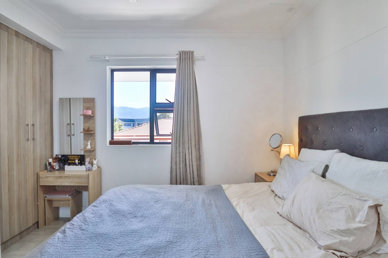 Main bedroom with a north-facing view towards the mountains, vinyl floors, built-in cupboards and en-suite shower, loo and basin.