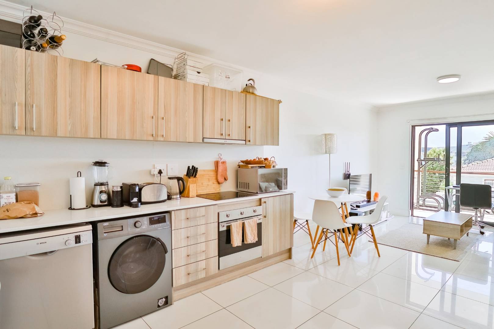 Situated on the 2nd floor with open-plan, tiled lounge/dining to the kitchen which offers Ceaserstone tops, loads of built-in cupboads plus a Smeg stove/oven, a double sink and space for two plumbed appliances.