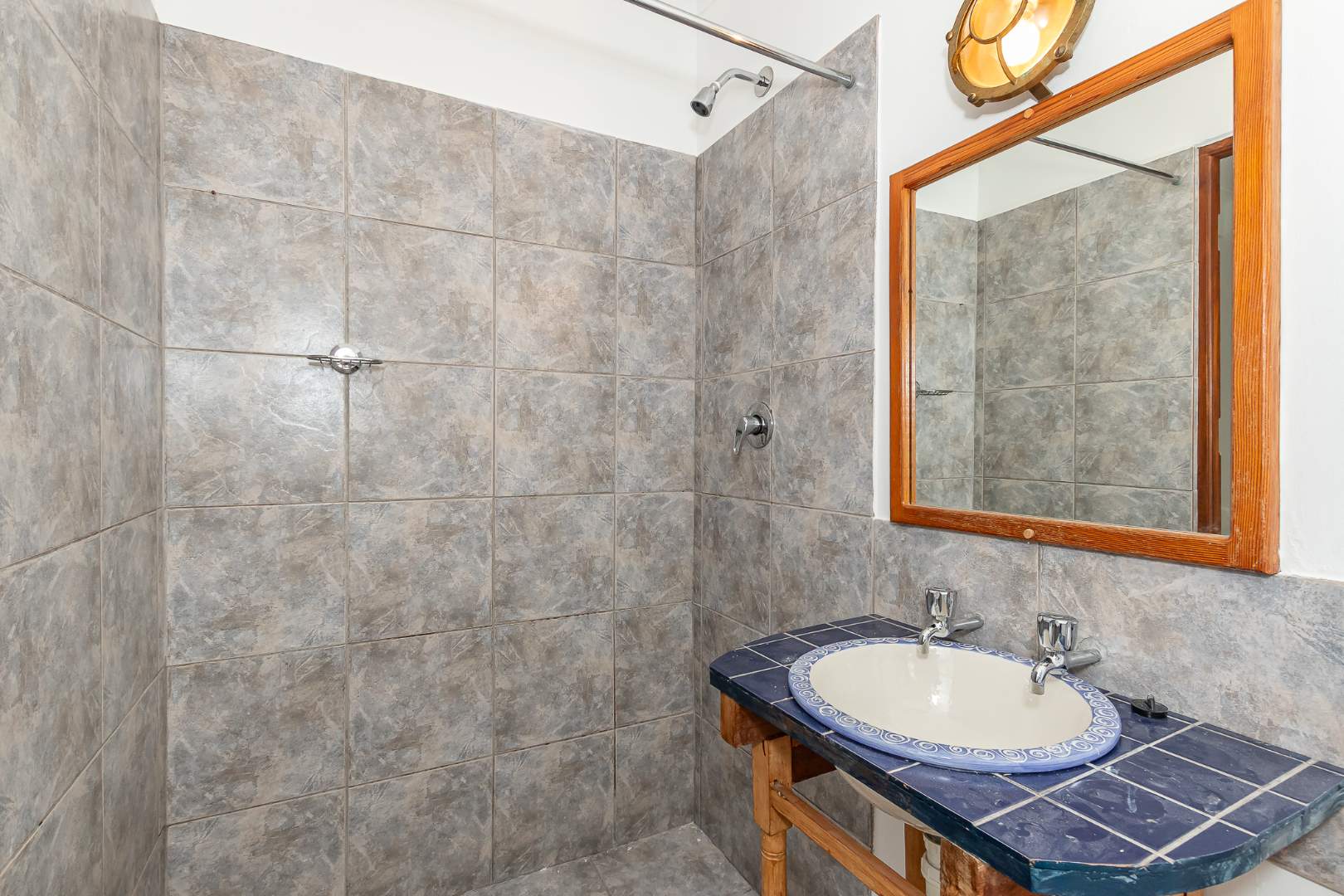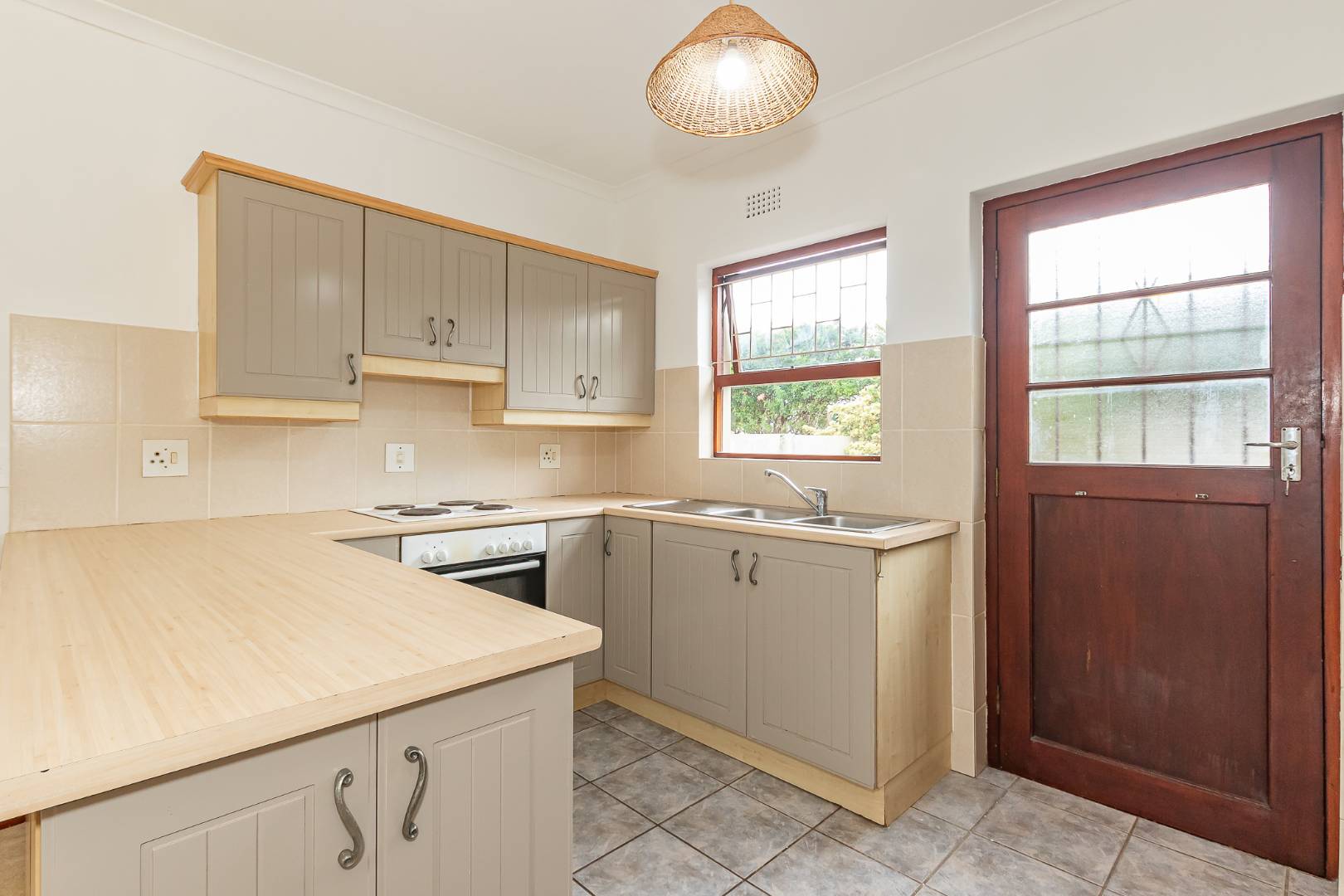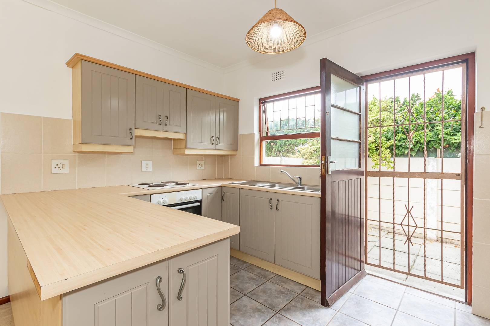 The modern kitchen is designed for convenience, featuring a breakfast counter and lovely shaker-style built-in cupboards. It has a built-in hob and oven, is fully plumbed for one appliance and has easy access to a quaint courtyard at the back.