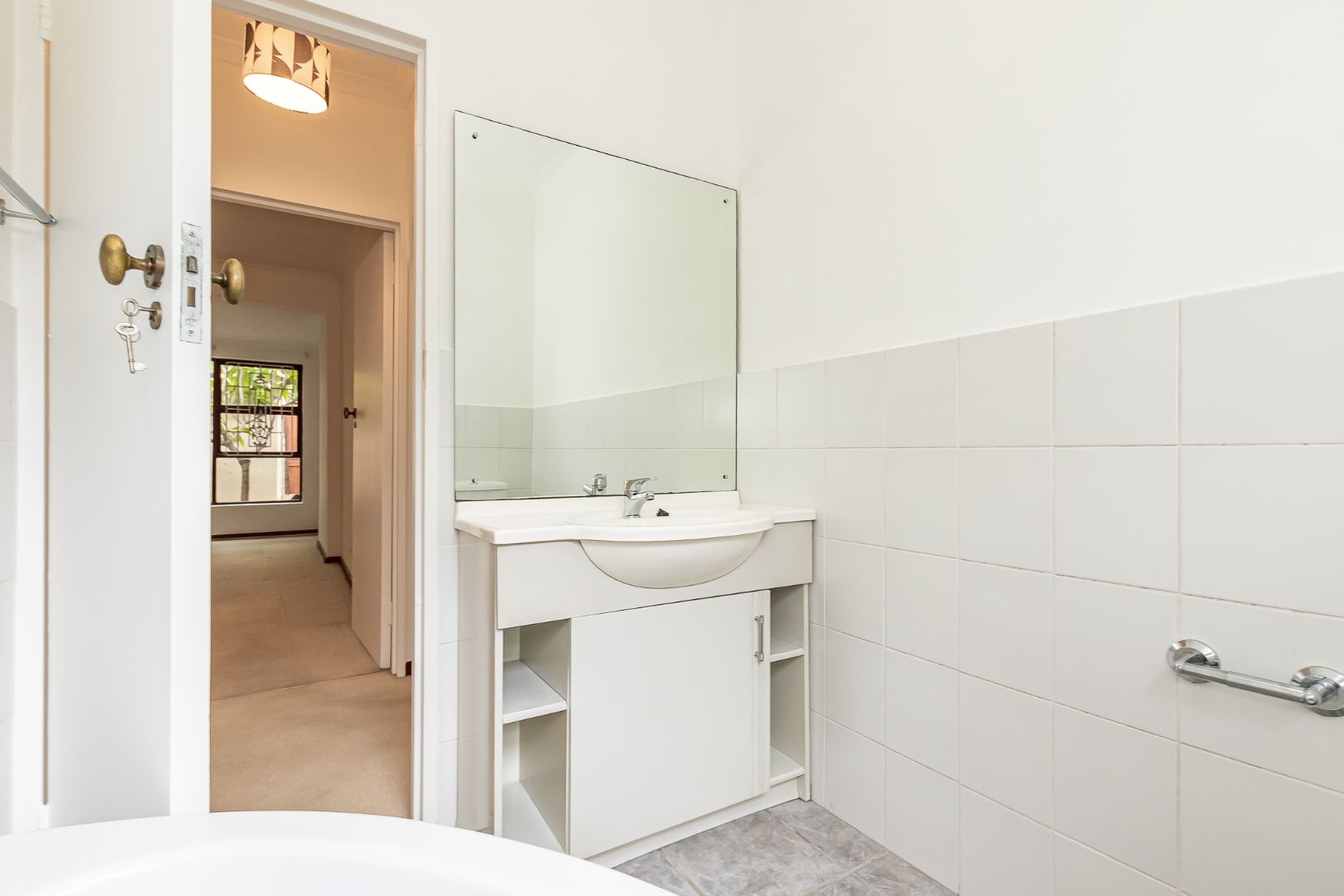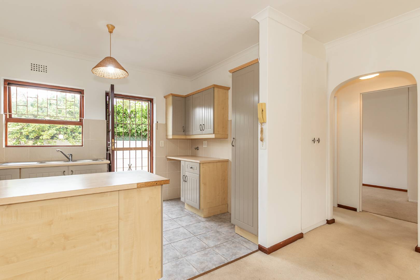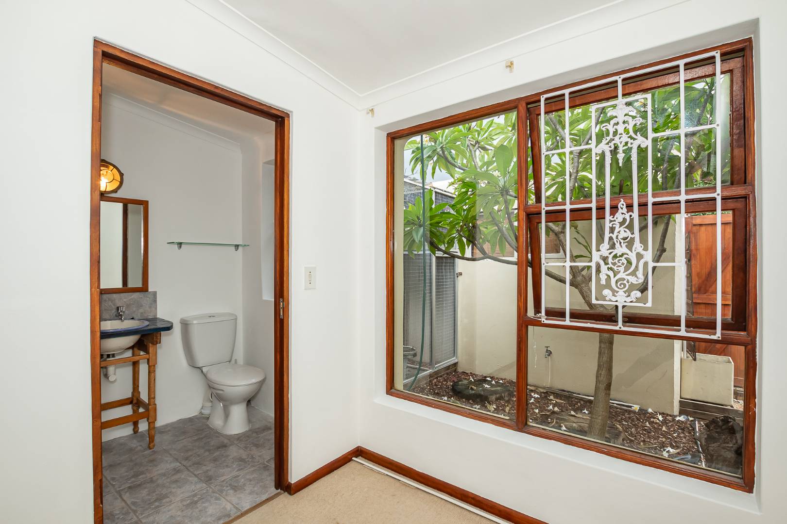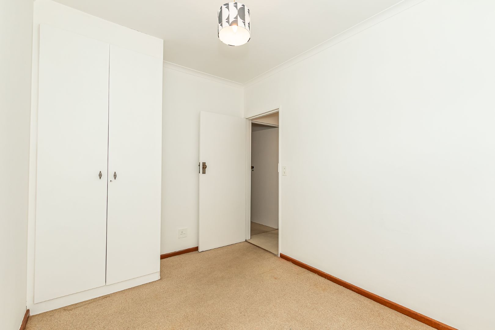 There are two carpeted bedrooms with built-in cupboards – the main bedroom has an en-suite shower, toilet and basin and there is a family bathroom with a corner bath, basin and toilet