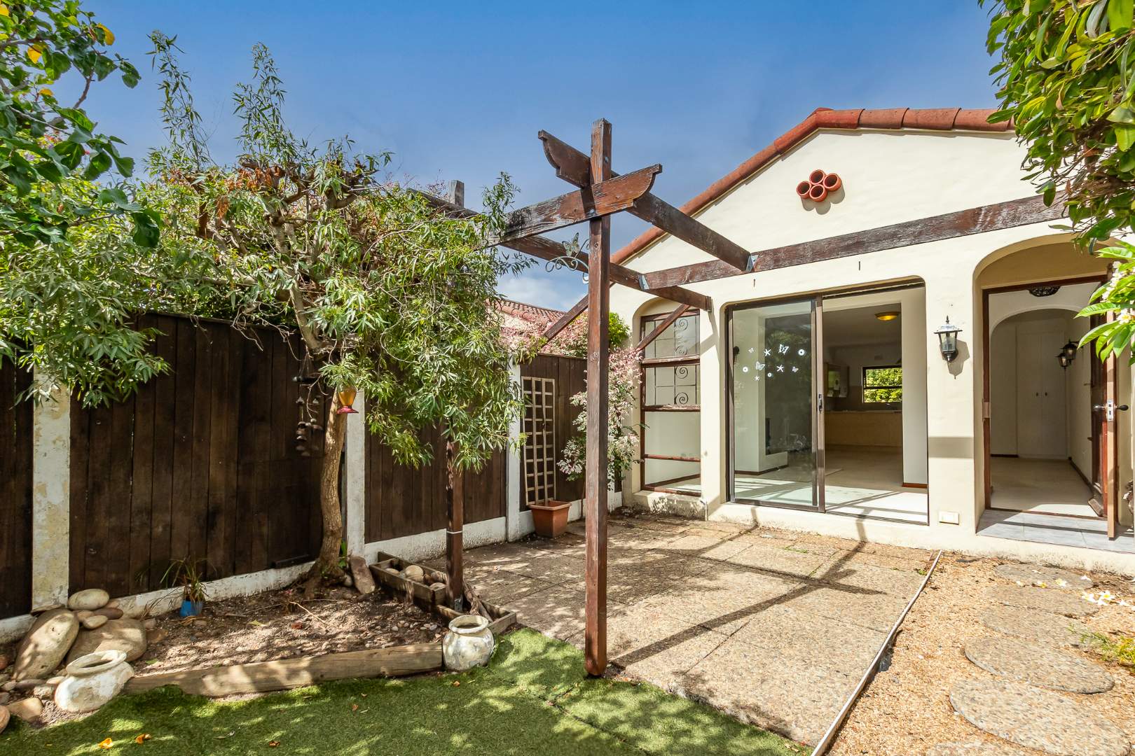 The home features a spacious open plan lounge area with a cosy fireplace, seamlessly flowing into a sunroom or dining area. This inviting space is ideal for relaxation and entertaining. Sliding doors lead off the sunroom, adding to the home's charm. Step outside to enjoy the delightful garden and patio area.