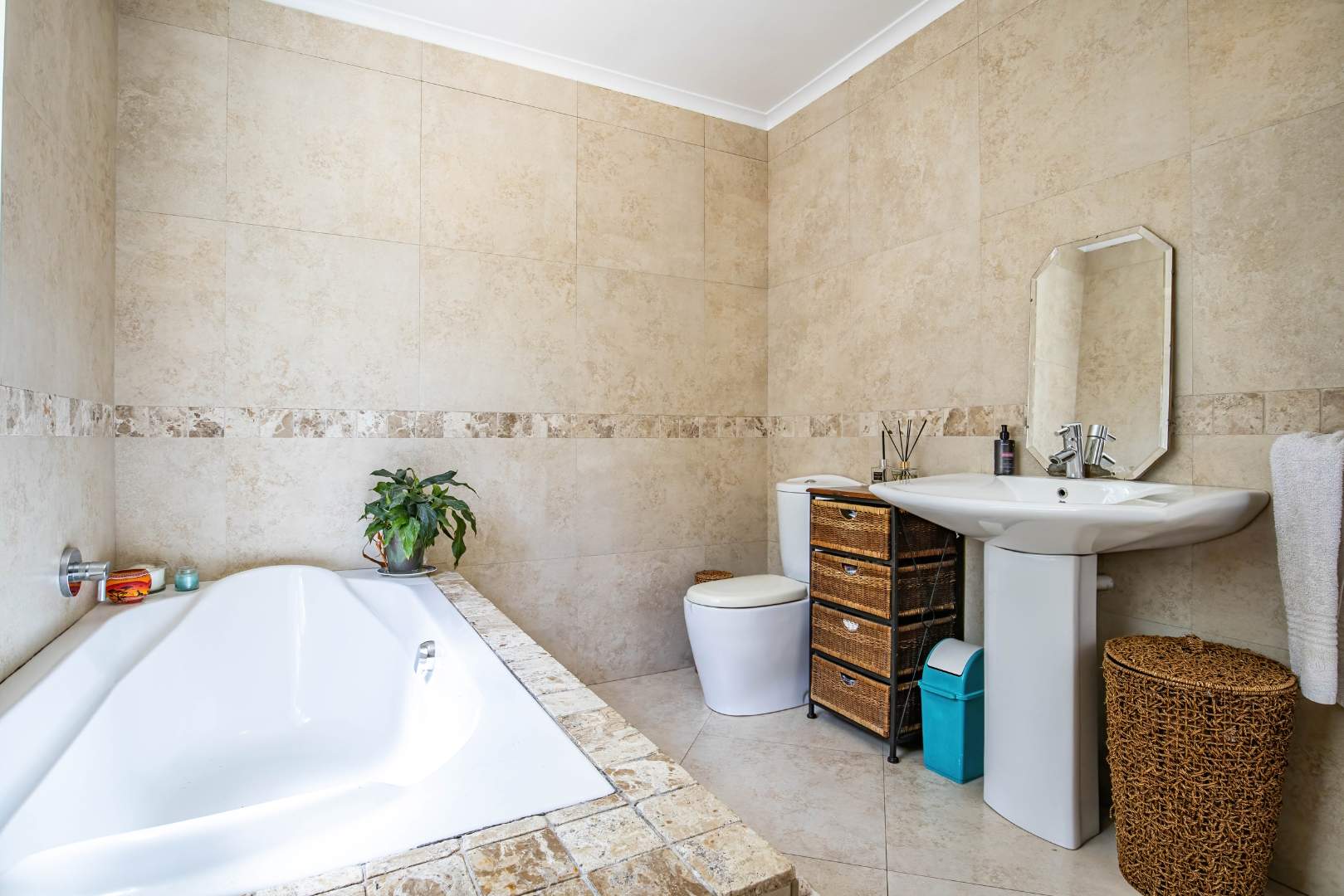 Main en-suite is spacious with a bath and shower (with a sandstone tile finish), a loo and