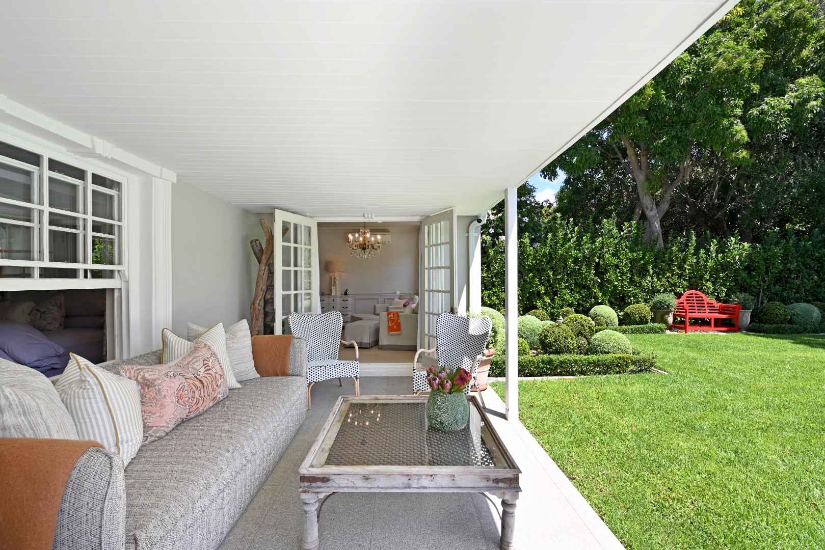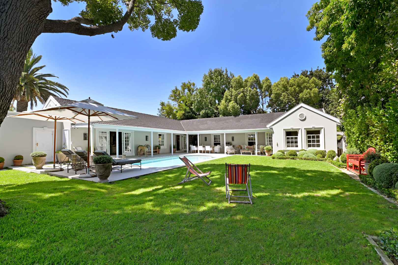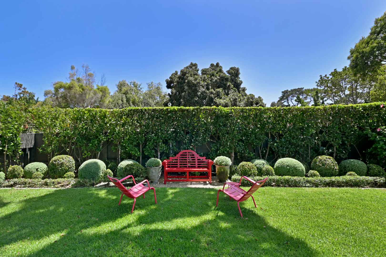 The private front garden with a level, manicured lawn and thoughtful landscaping sets a tone of calm order before you have even crossed the threshold.