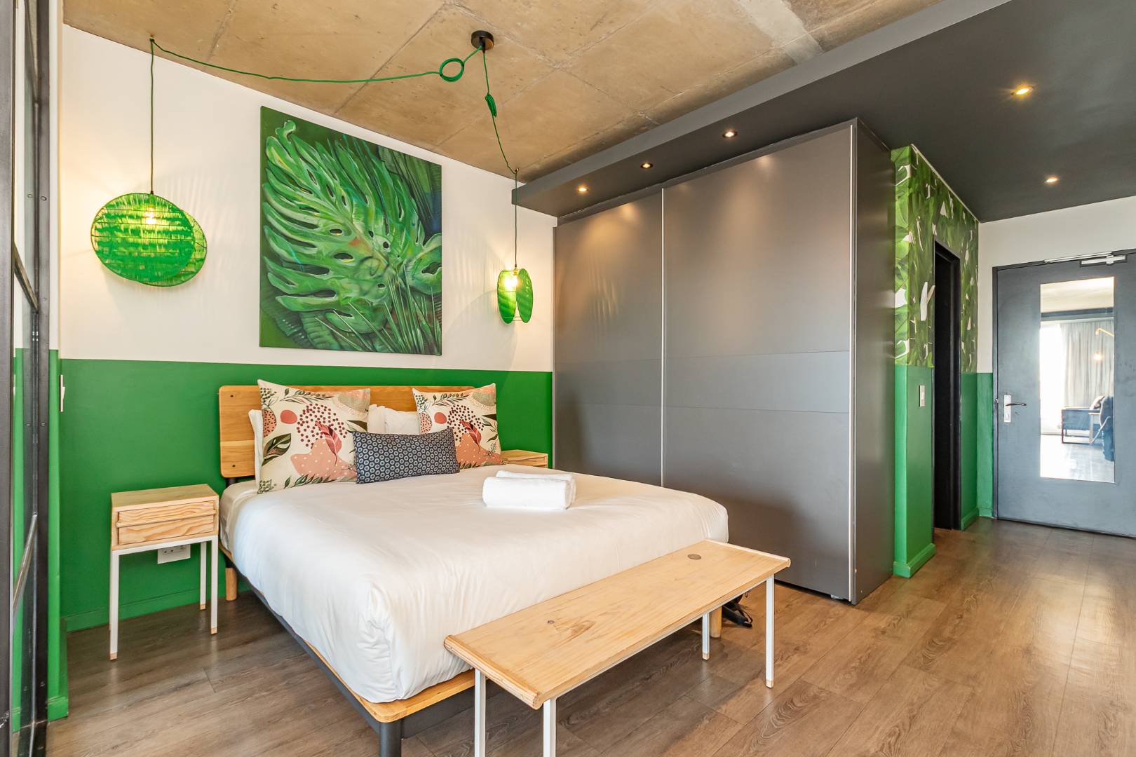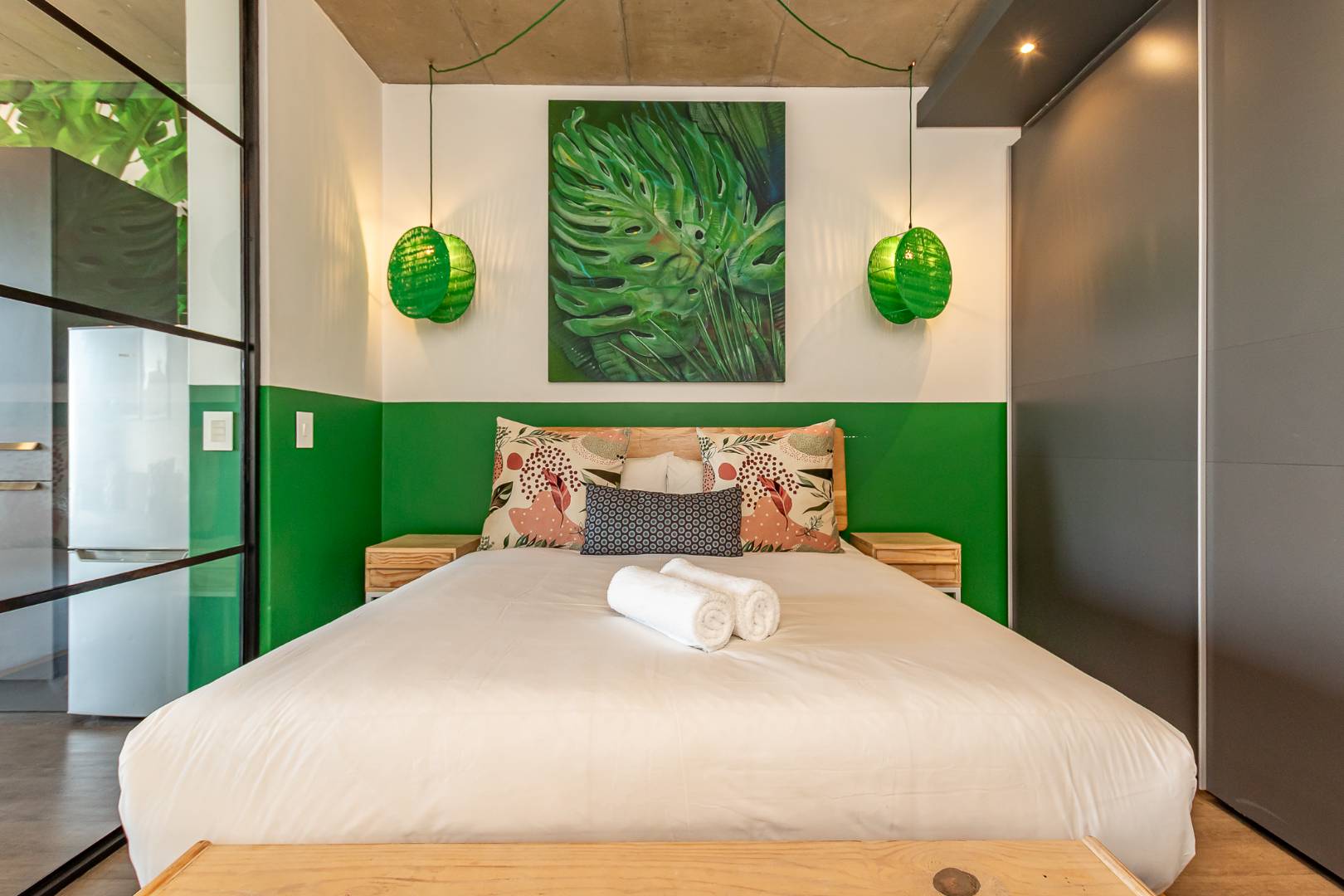 The bedroom is a tranquil retreat, enhanced by a stylish glass partition, which separates it from the living area while preserving the open-plan feel.