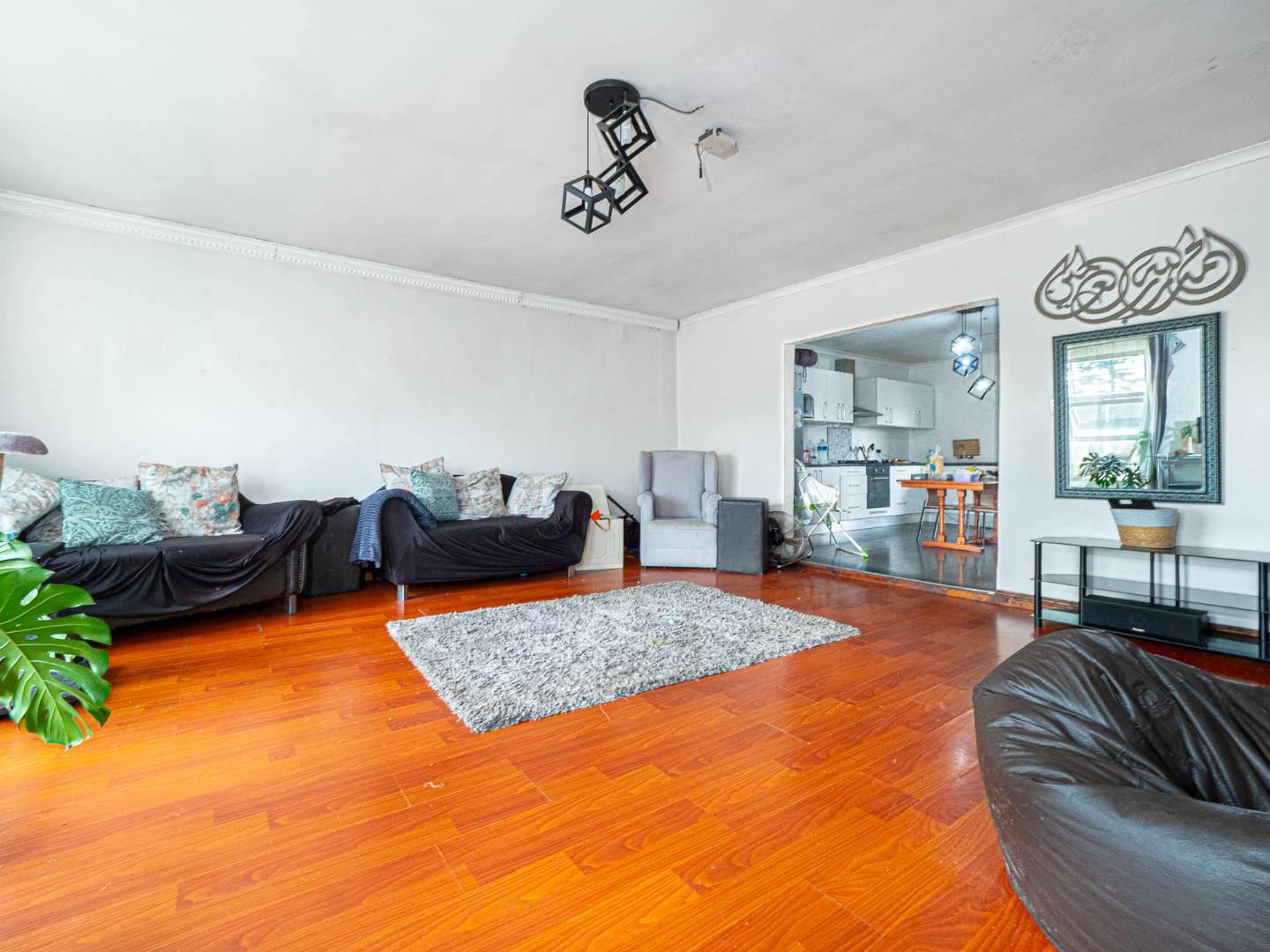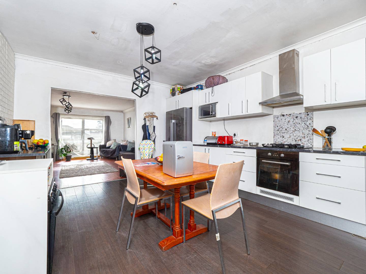 Big Lounge / Dining Room opening to spacious Kitchen with door leading to balcony overlooking garden