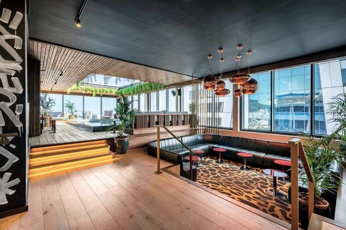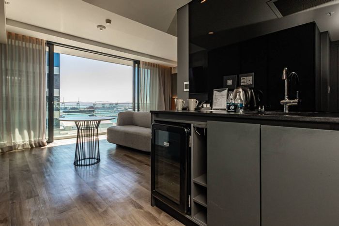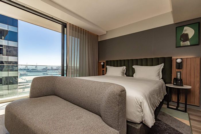 Cosmopolitan Foreshore living with easy access to Cape Town’s cultural and business hubs; 14th-floor studio offers panoramic harbour and Table Mountain views and rooftop bar, 1 bed, 1 bath.