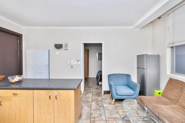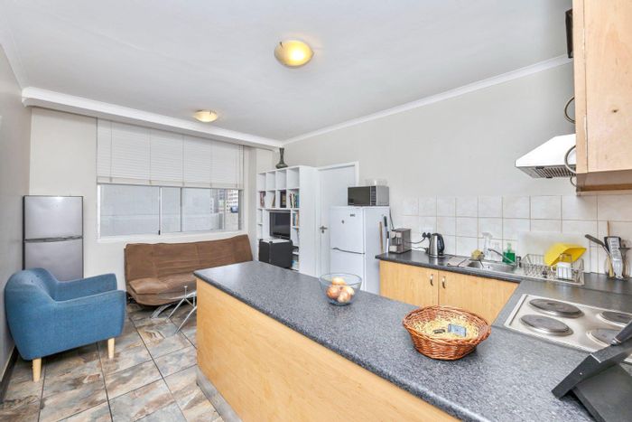 Modern open-plan living with natural light, private bedroom, balcony kitchen, built-in cupboards, and amenities near Groote Schuur Hospital.