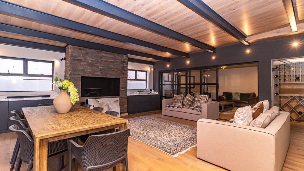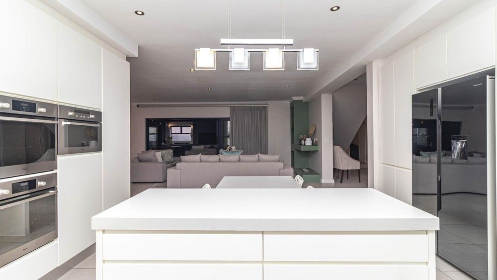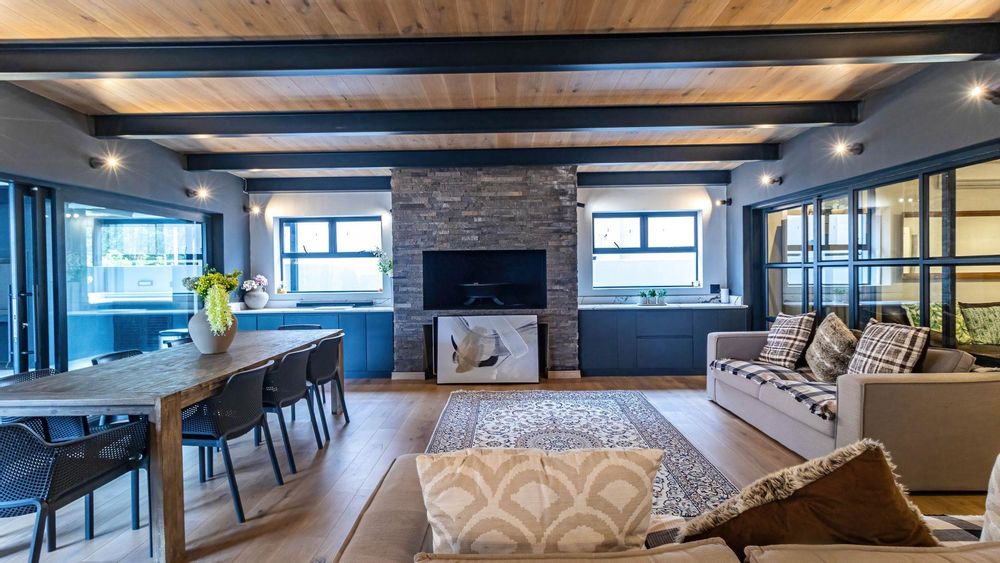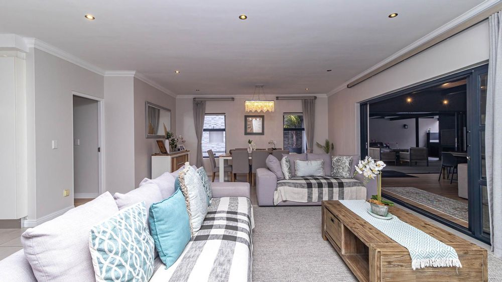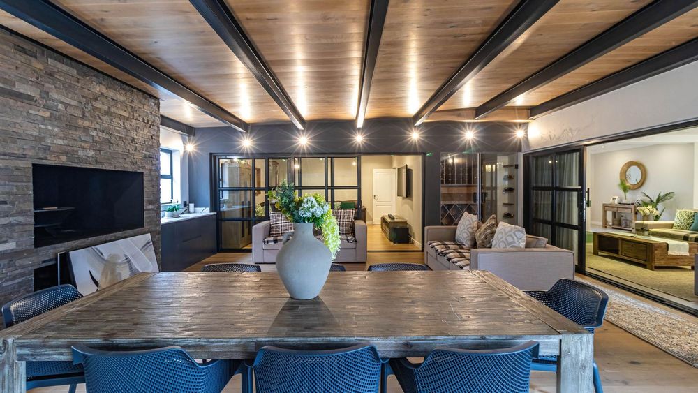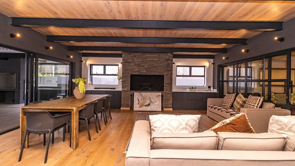 At the heart of the home, the sleek open-plan kitchen makes a bold statement with its contemporary finishes, generous workspace, and separate utility room for streamlined functionality. The adjoining dining and lounge areas create an easy indoor flow, leading into a light-filled entertainment room complete with an indoor braai—perfect for hosting in any season.