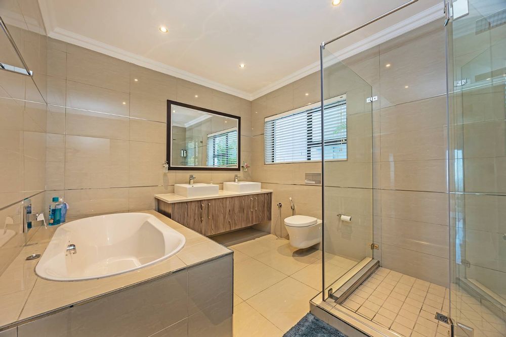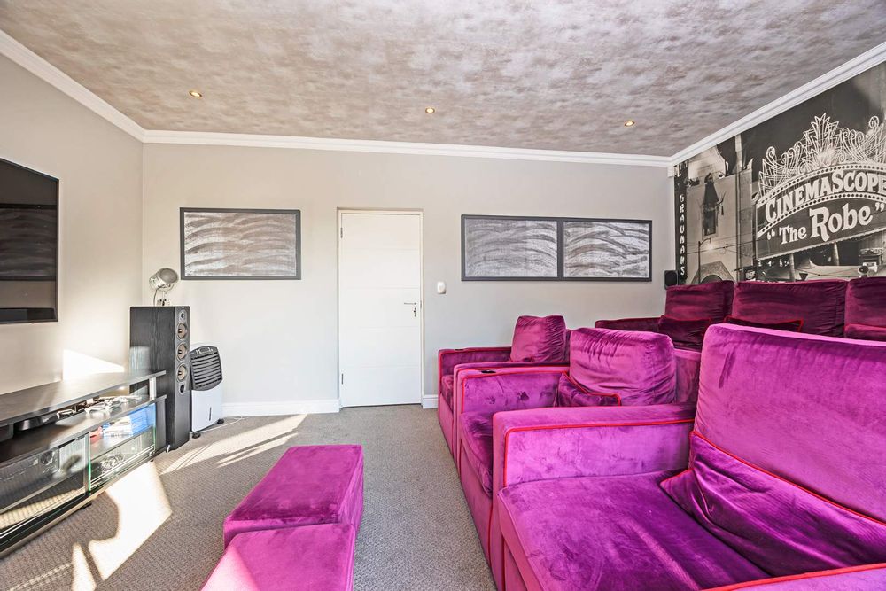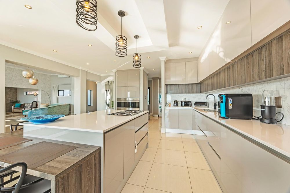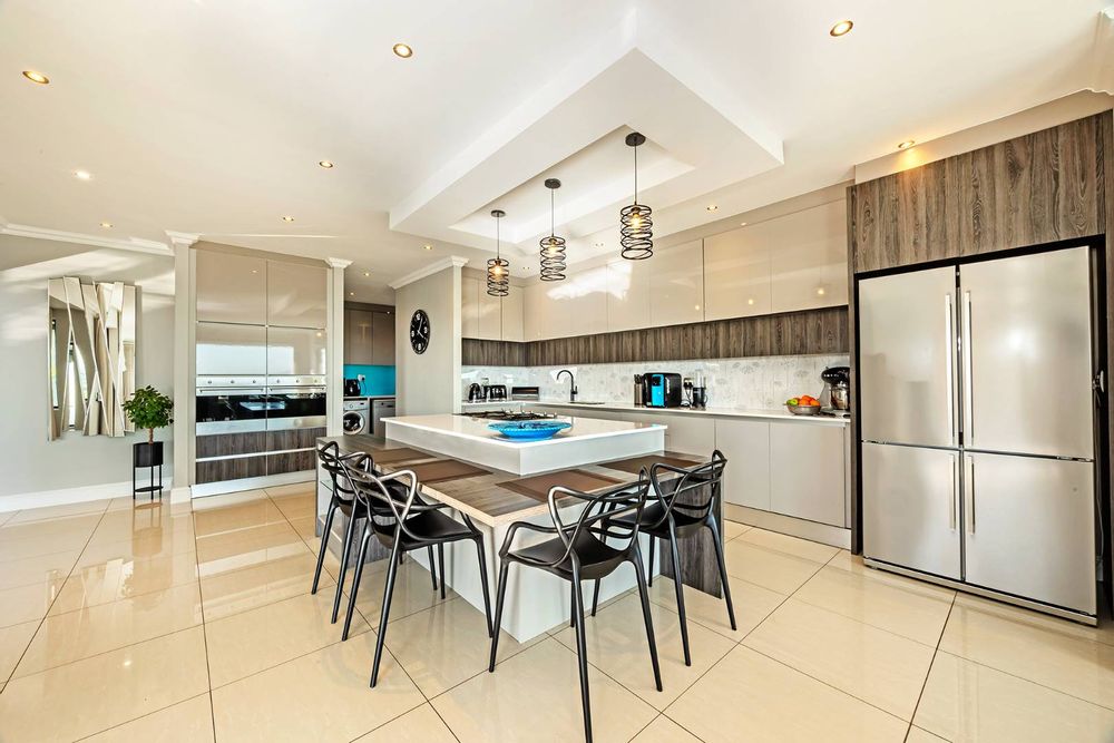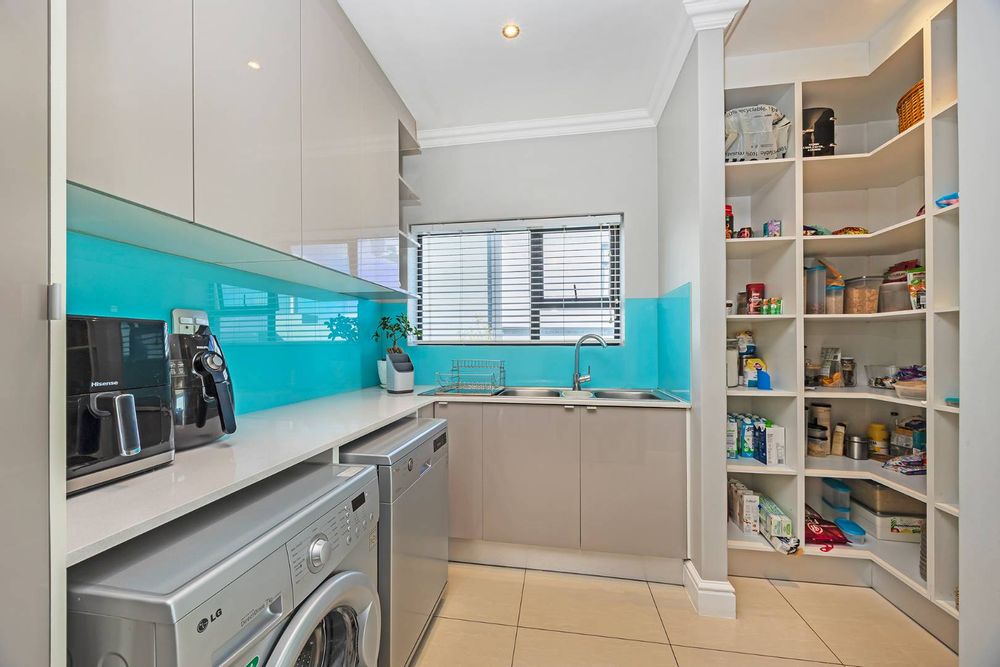 Additional features include three garages, off-street parking for four vehicles, a fully equipped gym, staff accommodation, and a storeroom. Sustainable living is made easy with a battery backup inverter system and solar geyser.