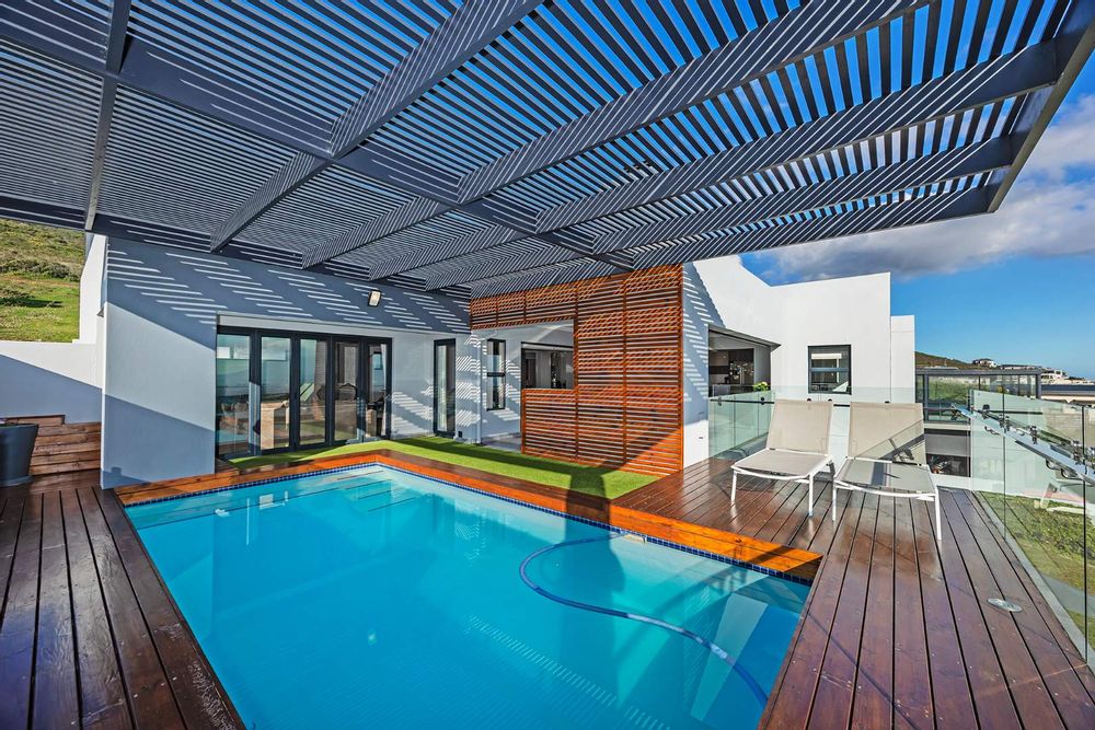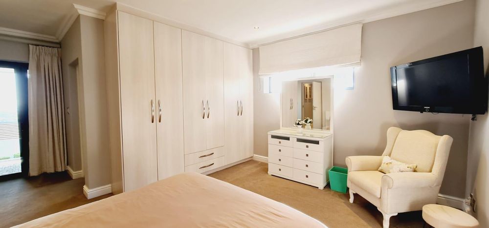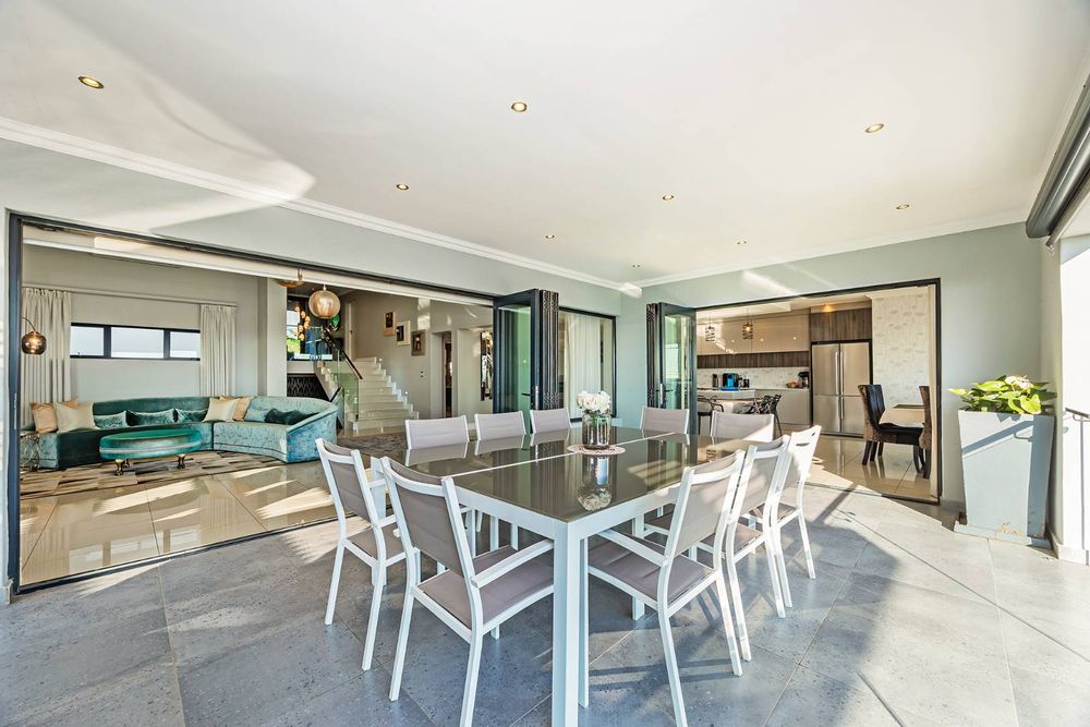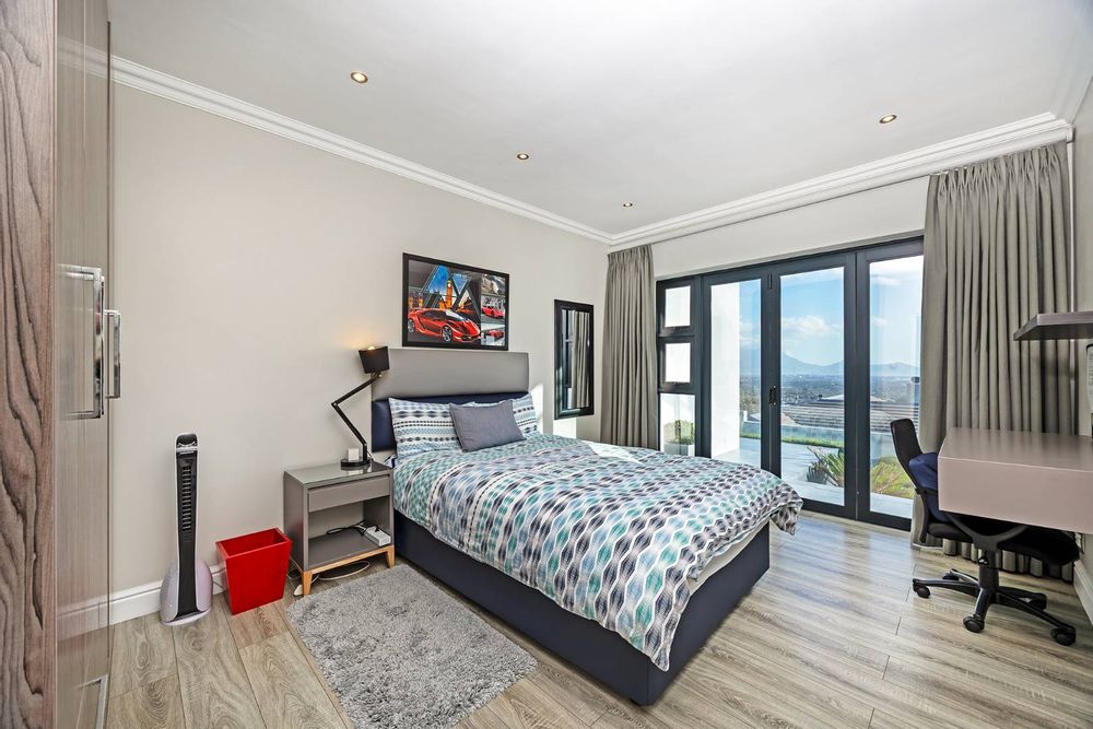 Flowing seamlessly across three levels, the home has been designed for effortless living and exceptional entertaining. At its heart, a bespoke designer kitchen — a hobby chef’s dream — integrates beautifully with an elegant dining area, where a wide picture window captures the ever-changing mountain skyline. Expansive reception areas open to a sunlit patio with a stylish undercover braai, leading to a heated pool that offers both privacy and world-class views.