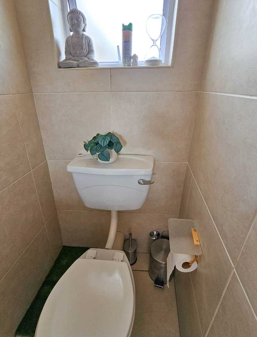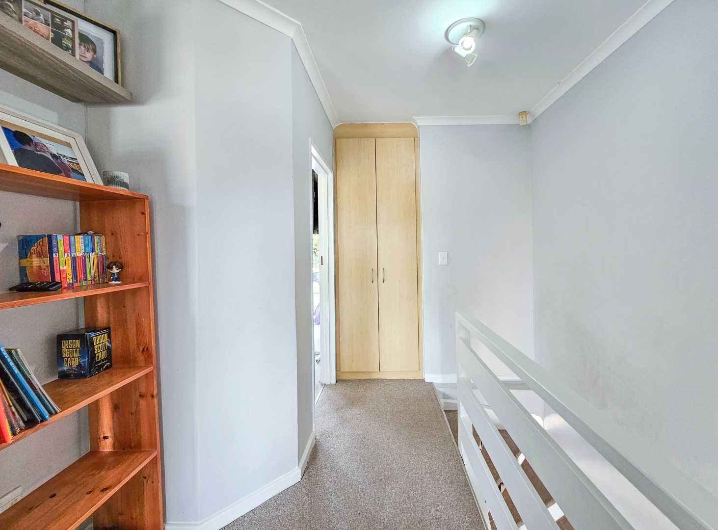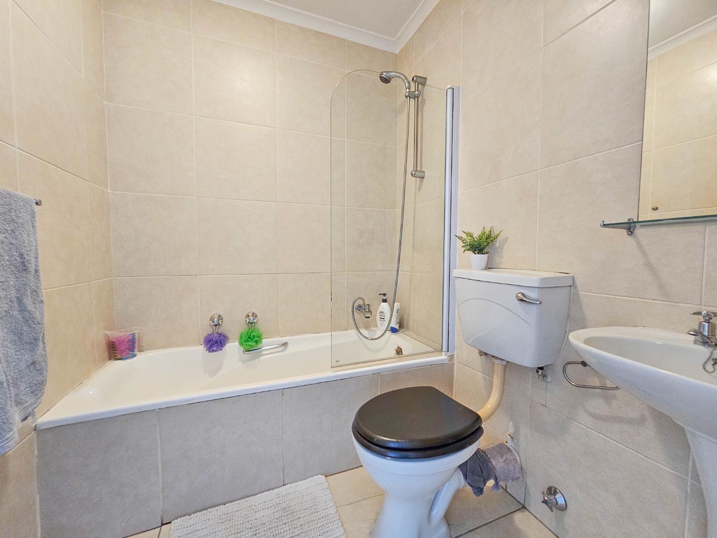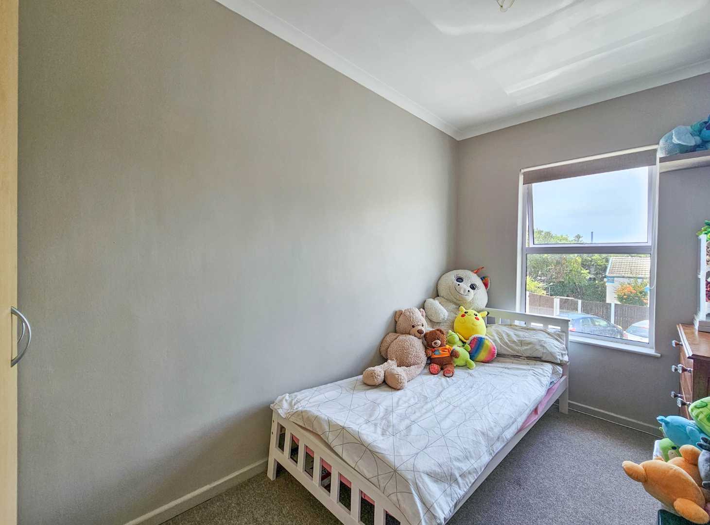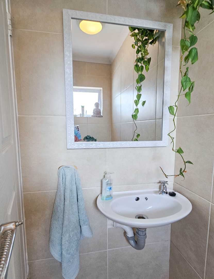 Upstairs there are 3 sizable bedrooms, family bathroom and spacious hallway cupboard. Main bedroom has plenty of cupboards, ensuite bathroom, balcony with awning and fantastic mountain and vlei views (spot the cows from nearby Dreyersdal Farm).