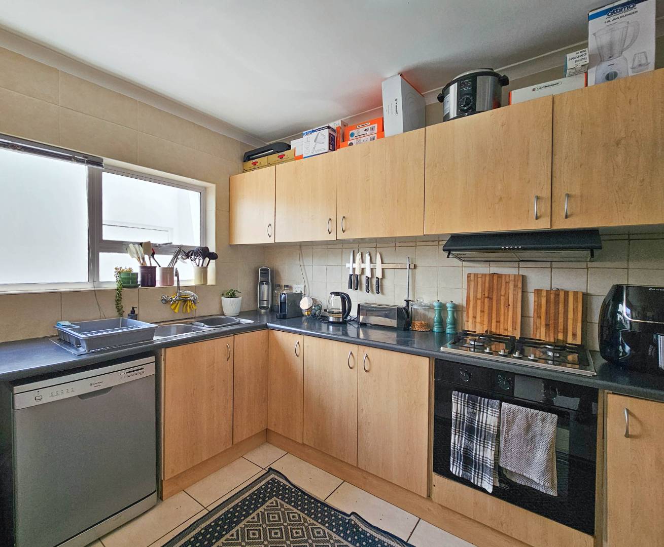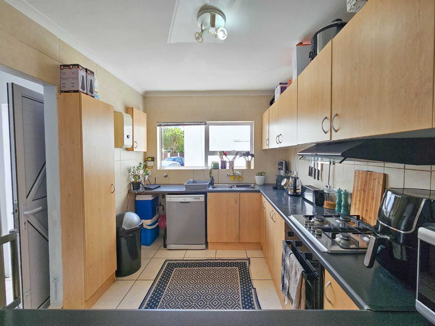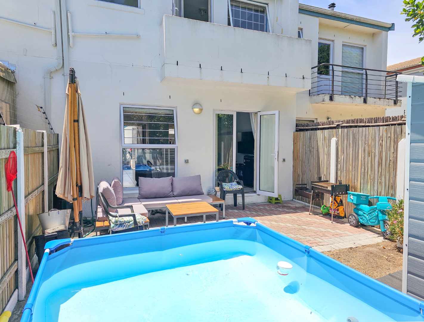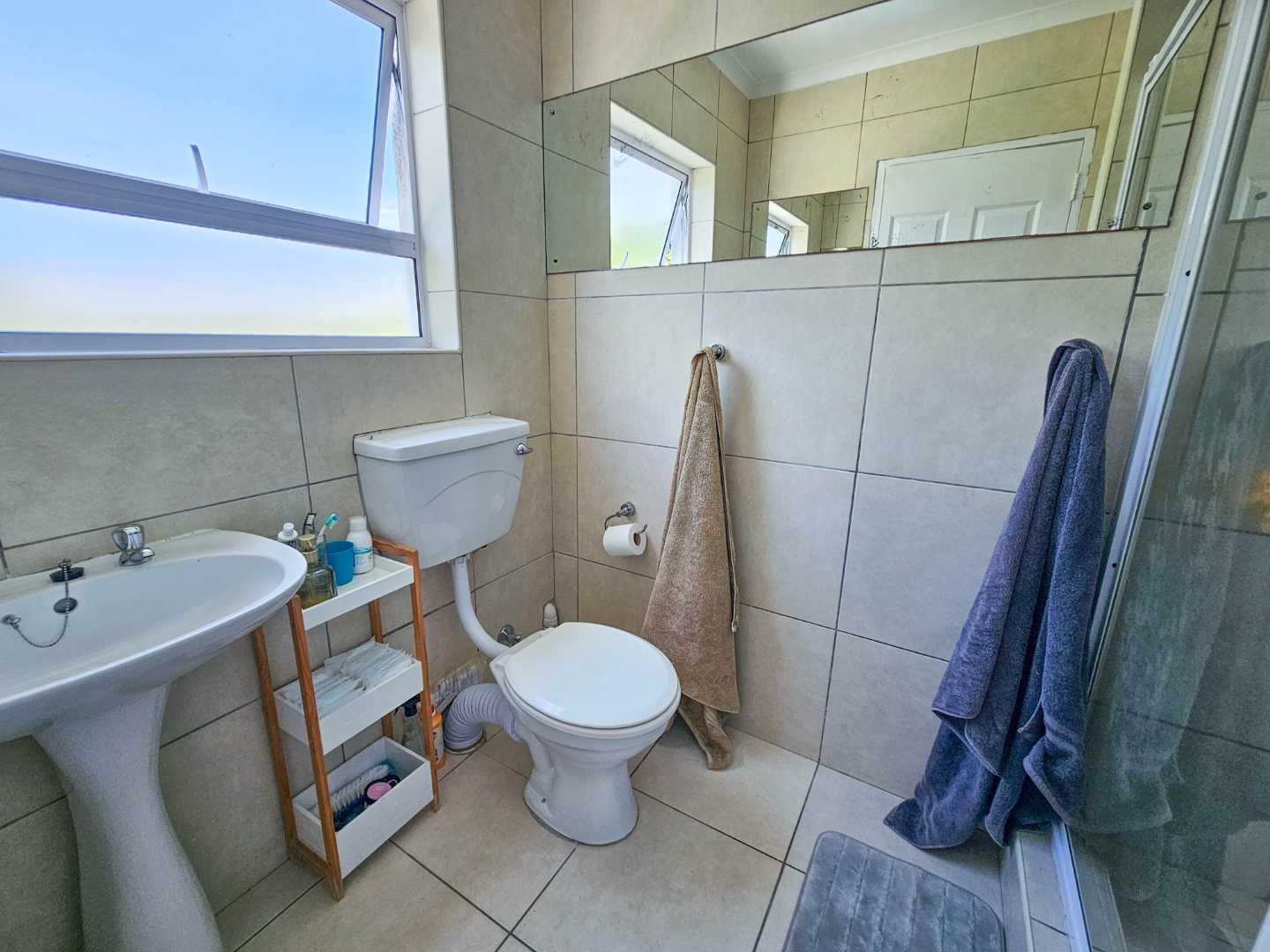 Upstairs there are 3 sizable bedrooms, family bathroom and spacious hallway cupboard. Main bedroom has plenty of cupboards, ensuite bathroom, balcony with awning and fantastic mountain and vlei views (spot the cows from nearby Dreyersdal Farm).