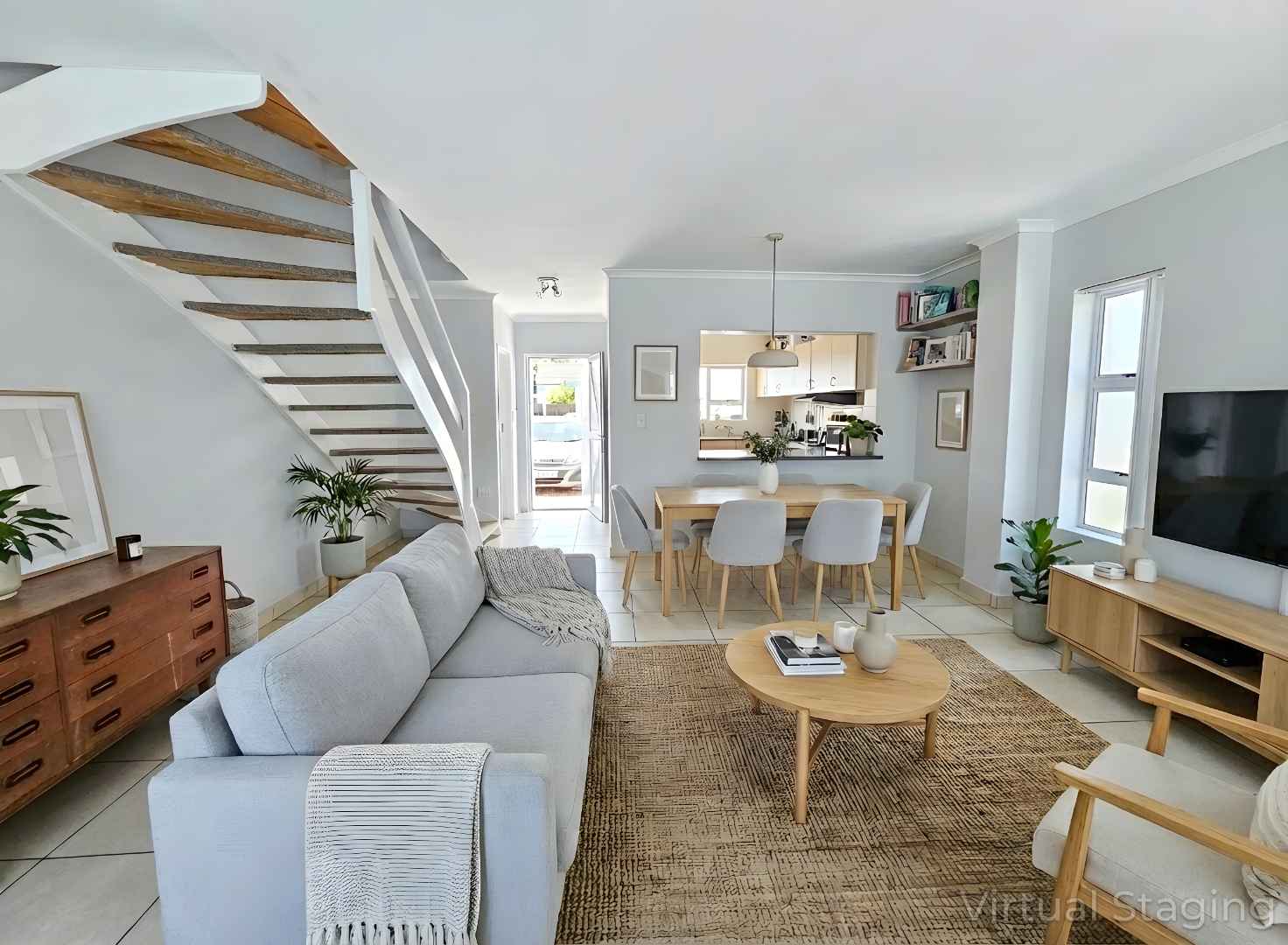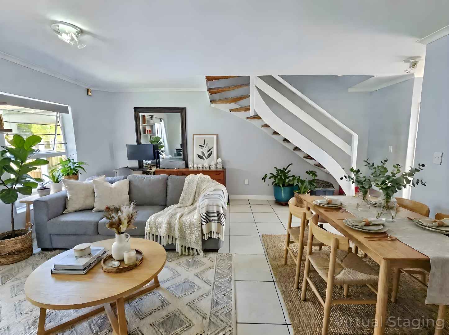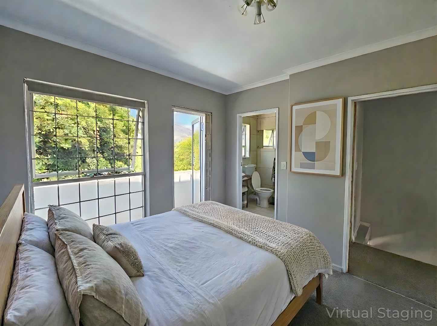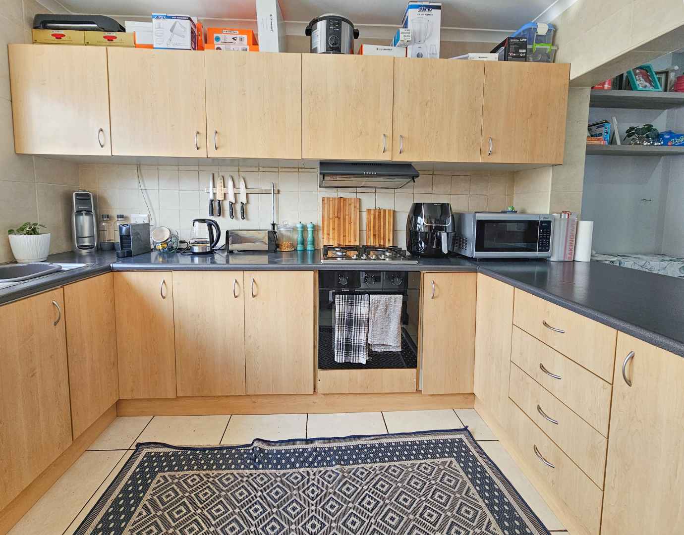 Upstairs there are 3 sizable bedrooms, family bathroom and spacious hallway cupboard. Main bedroom has plenty of cupboards, ensuite bathroom, balcony with awning and fantastic mountain and vlei views (spot the cows from nearby Dreyersdal Farm).