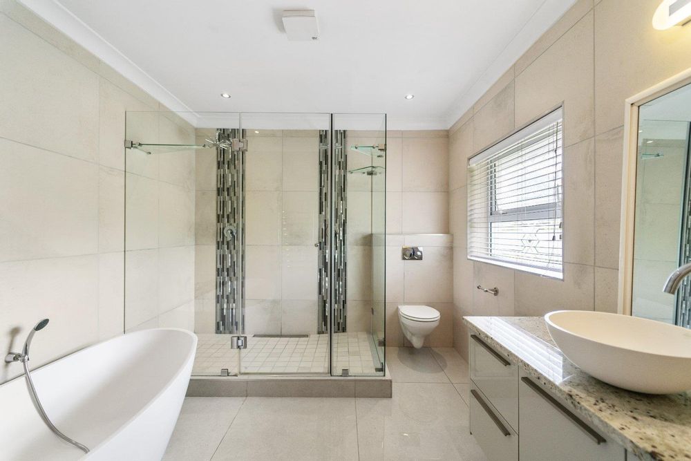 Downstairs Bedroom: Spacious bedroom with en-suite bathroom, double shower and German style waterfall showerheads; opening onto a patio with spectacular Table Mountain views. Air conditioning adds to comfort.