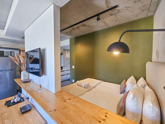 Enjoy vibrant Bo Kaap living steps from Long, Loop and Bree Streets; apartment with terrace and Table Mountain views, communal pool and gym, secure parking — one bedroom, one bathroom.