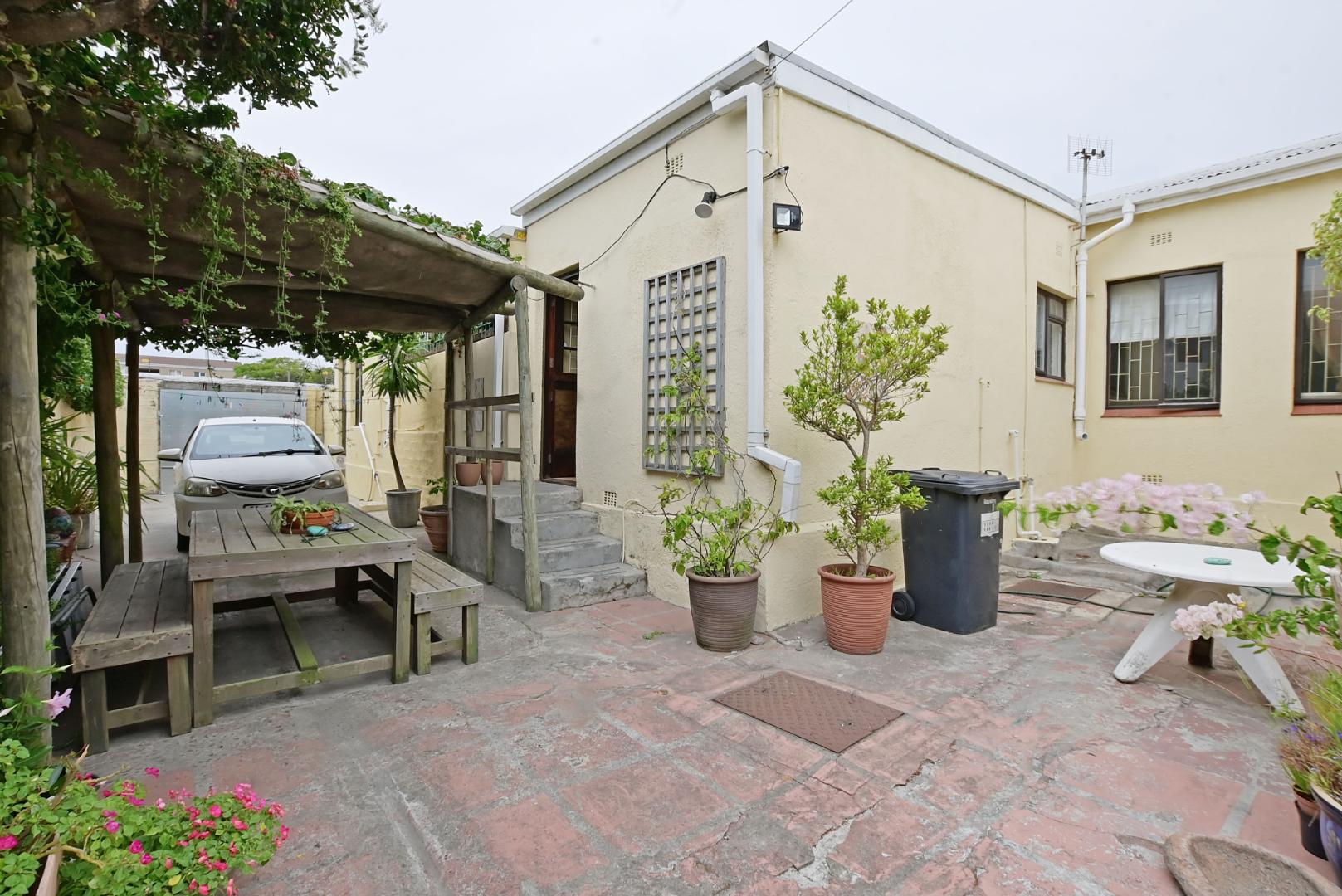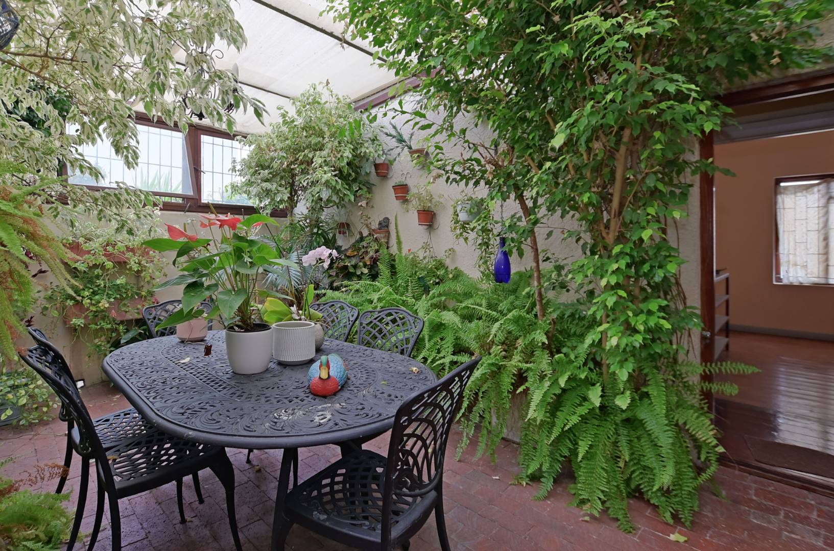 Quaint back garden with fig trees, plants and grape vine.