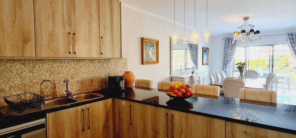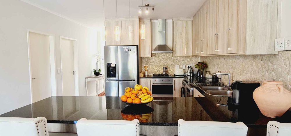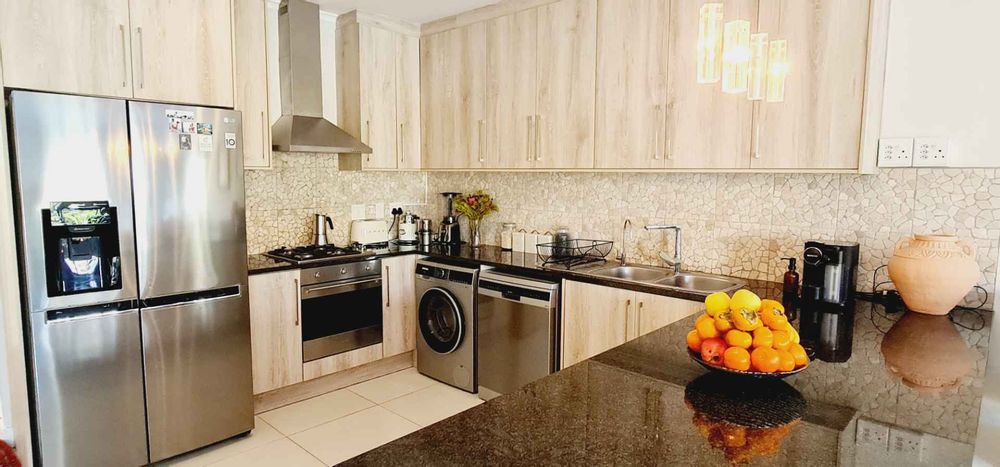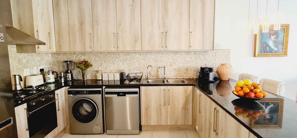 A well-appointed kitchen serves as the heart of the home, featuring granite counters, sleek floor-to-ceiling cabinetry, a gas hob, dual plumbing points, and space for a double-door fridge – combining form and function with understated style.