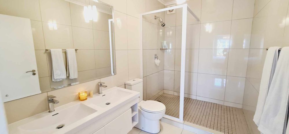 Downstairs, the spacious guest bedroom features a modern ensuite bathroom with a walk-in shower and double vanity, cleverly designed to serve as both private and guest access.
