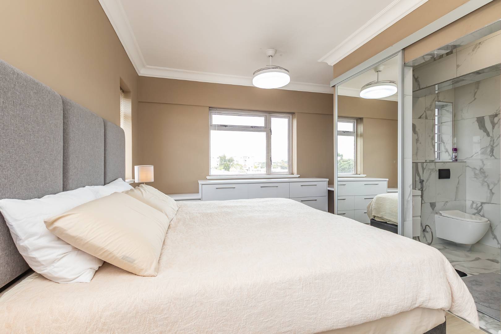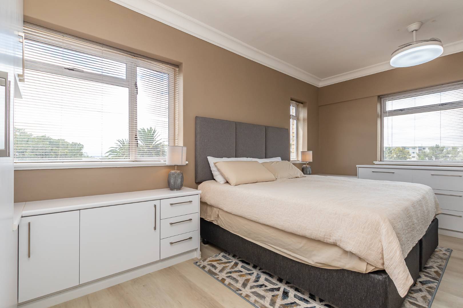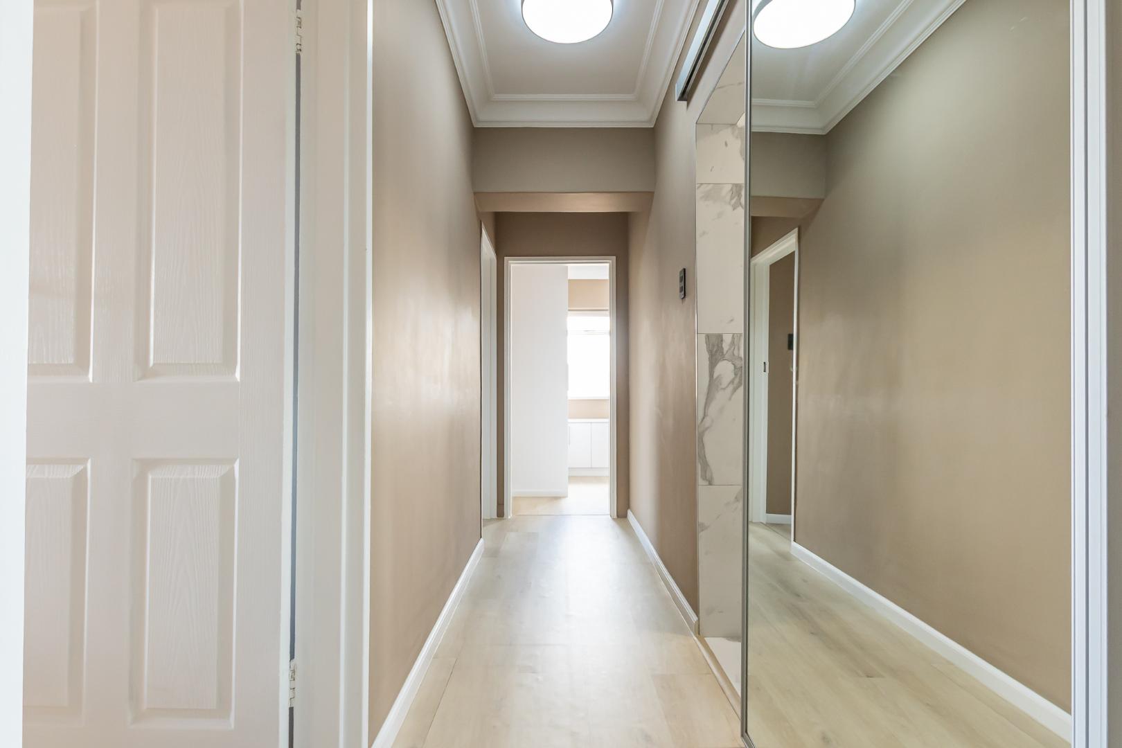 All three bedrooms offer an abundance of built-in-cupboards, while the two tastefully designed bathrooms combine clean lines with refined simplicity.