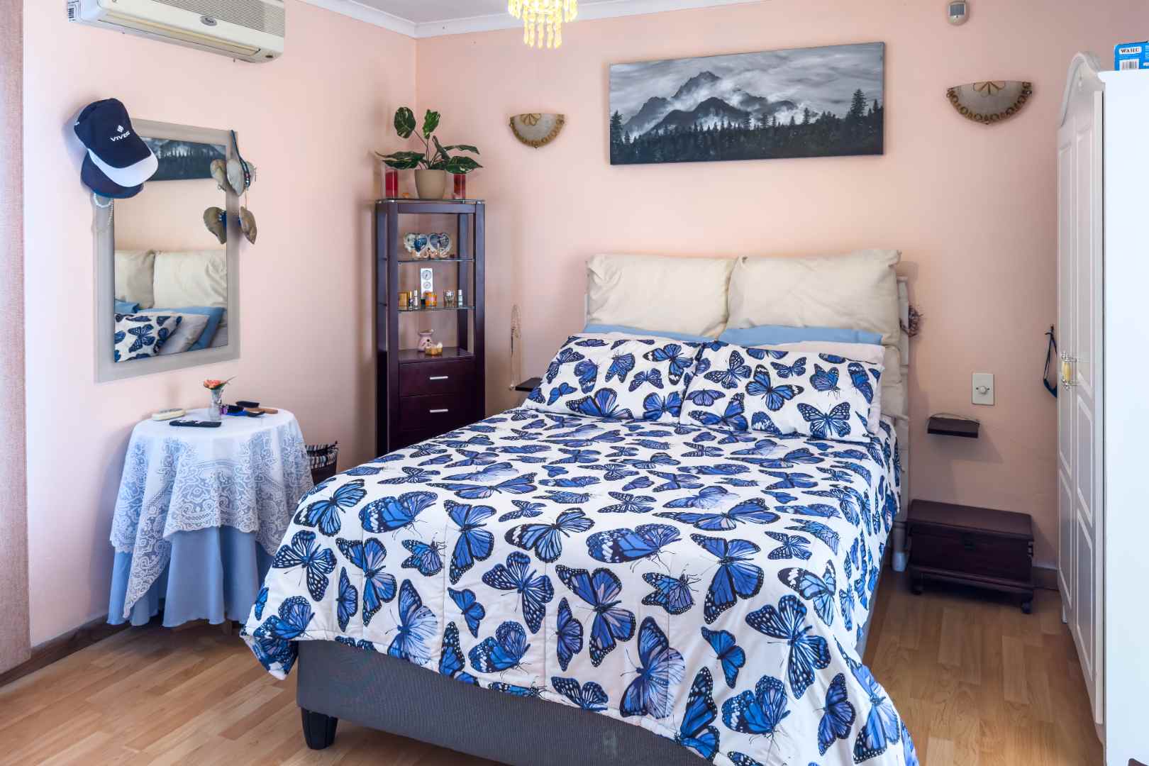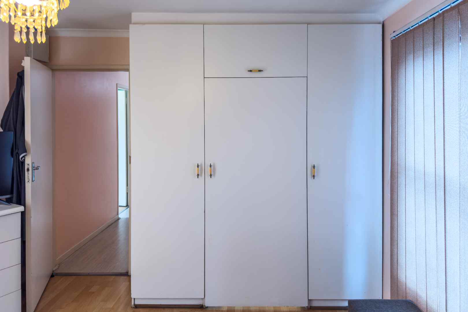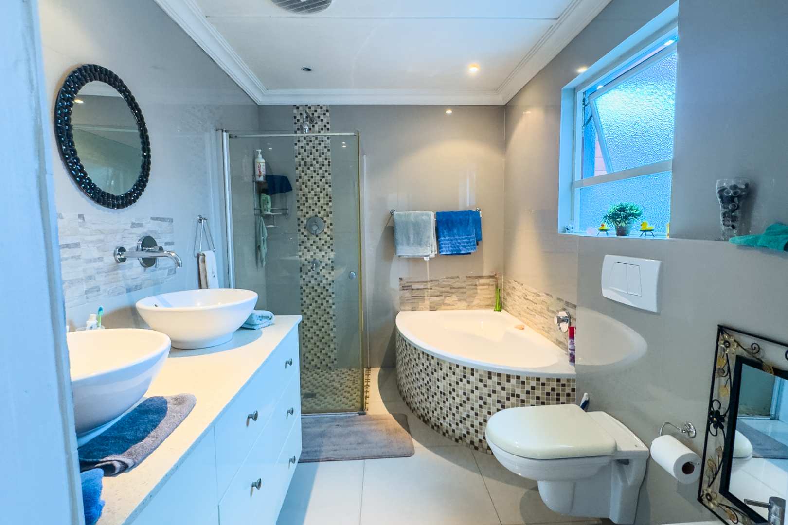 The property boasts three spacious bedrooms, each with built-in cupboards and laminate flooring. The main bedroom features a modern en-suite bathroom with double sink, shower, bath, bidet, and toilet.