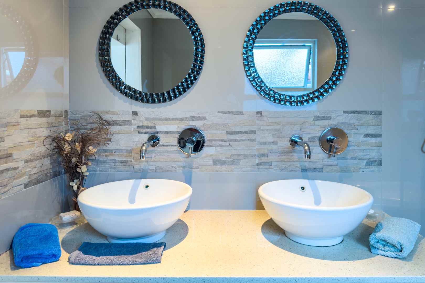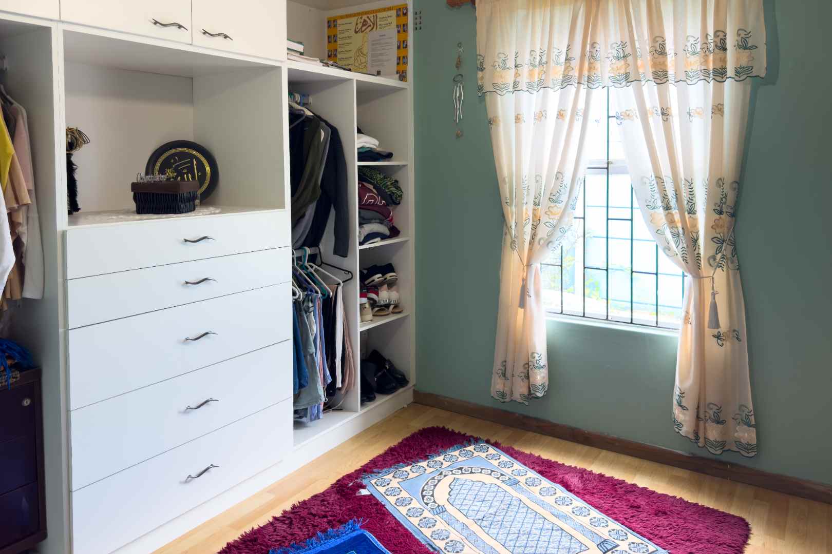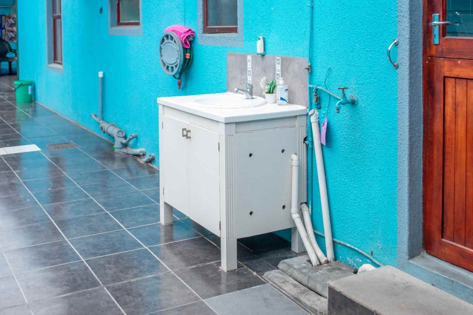The property boasts three spacious bedrooms, each with built-in cupboards and laminate flooring. The main bedroom features a modern en-suite bathroom with double sink, shower, bath, bidet, and toilet.