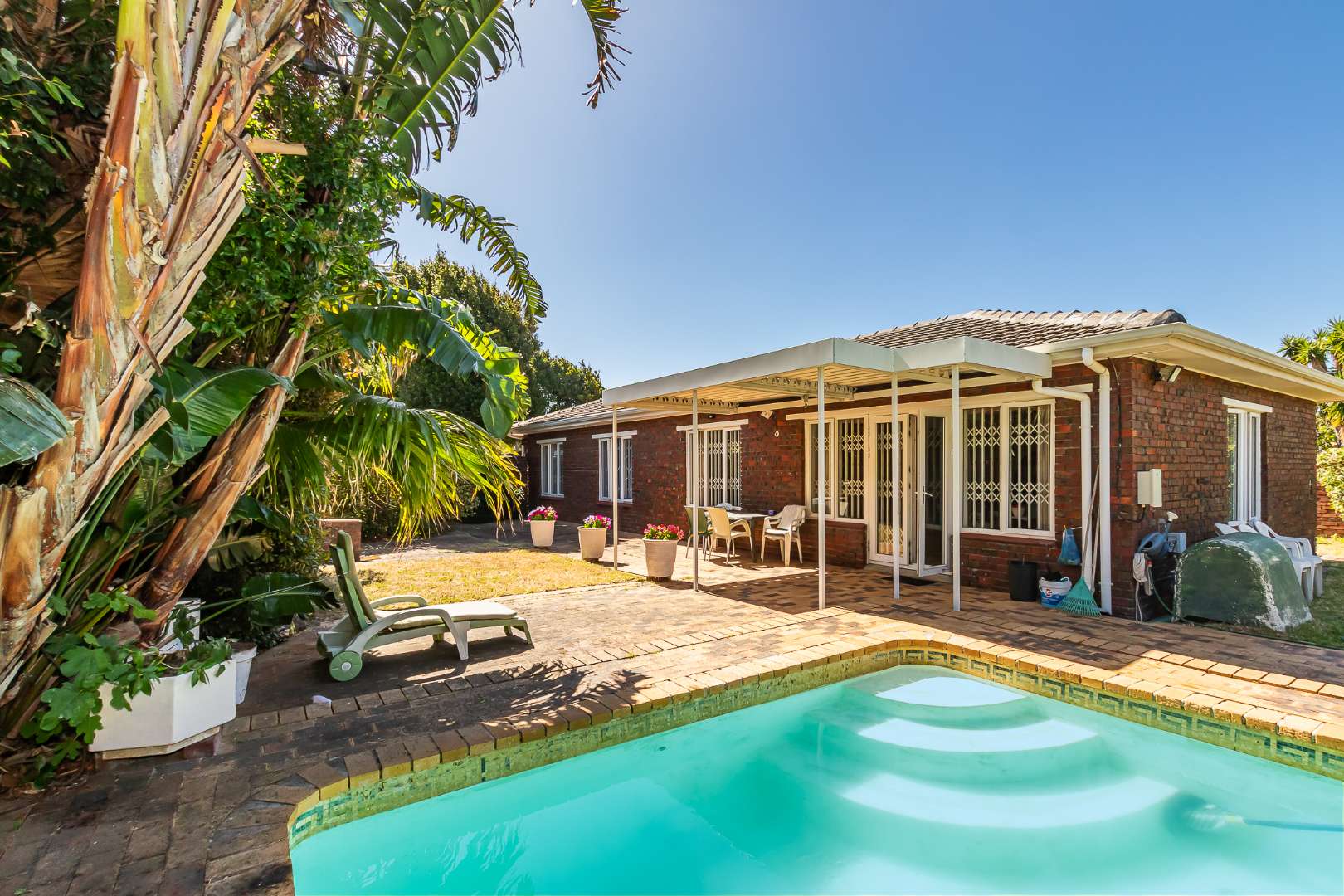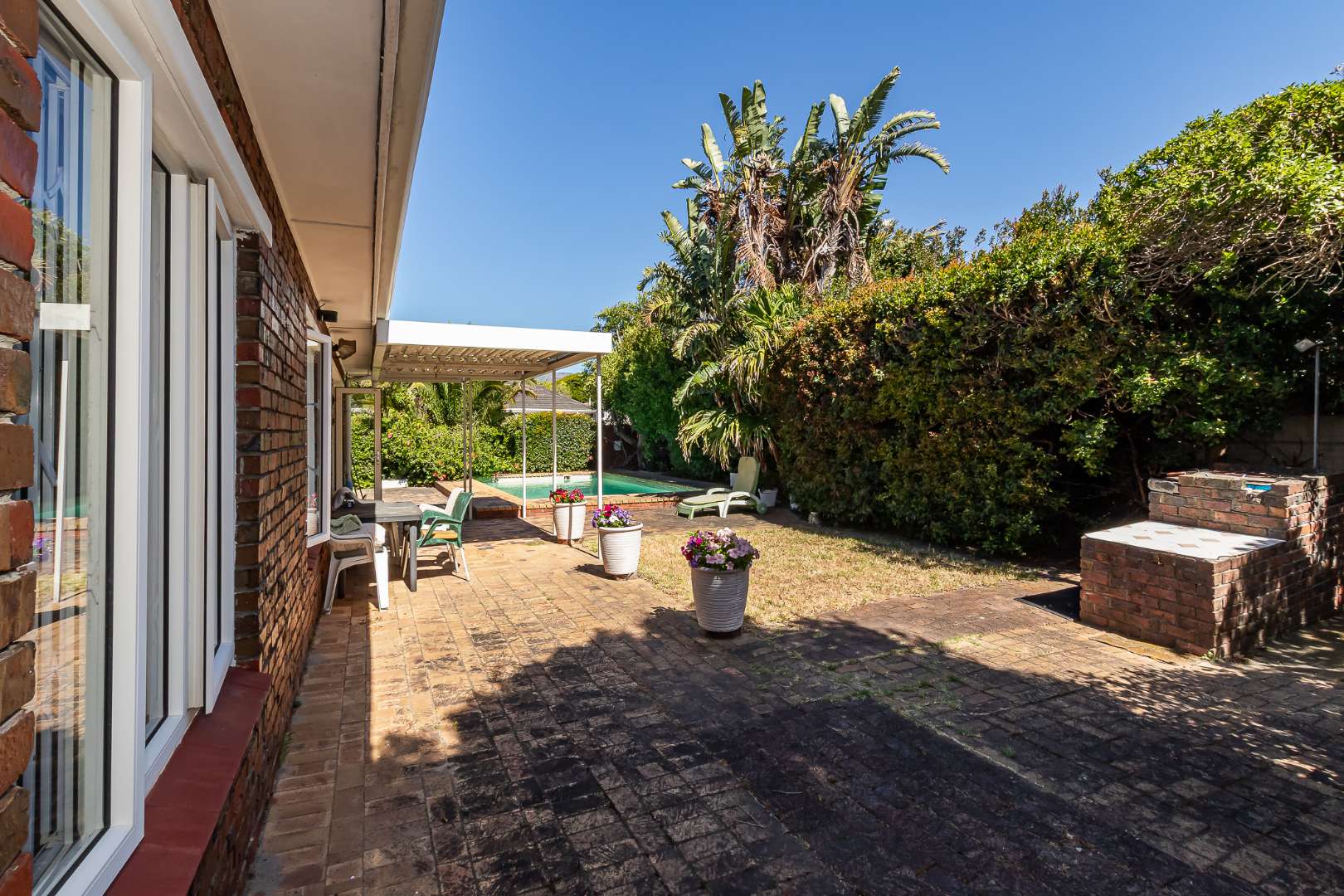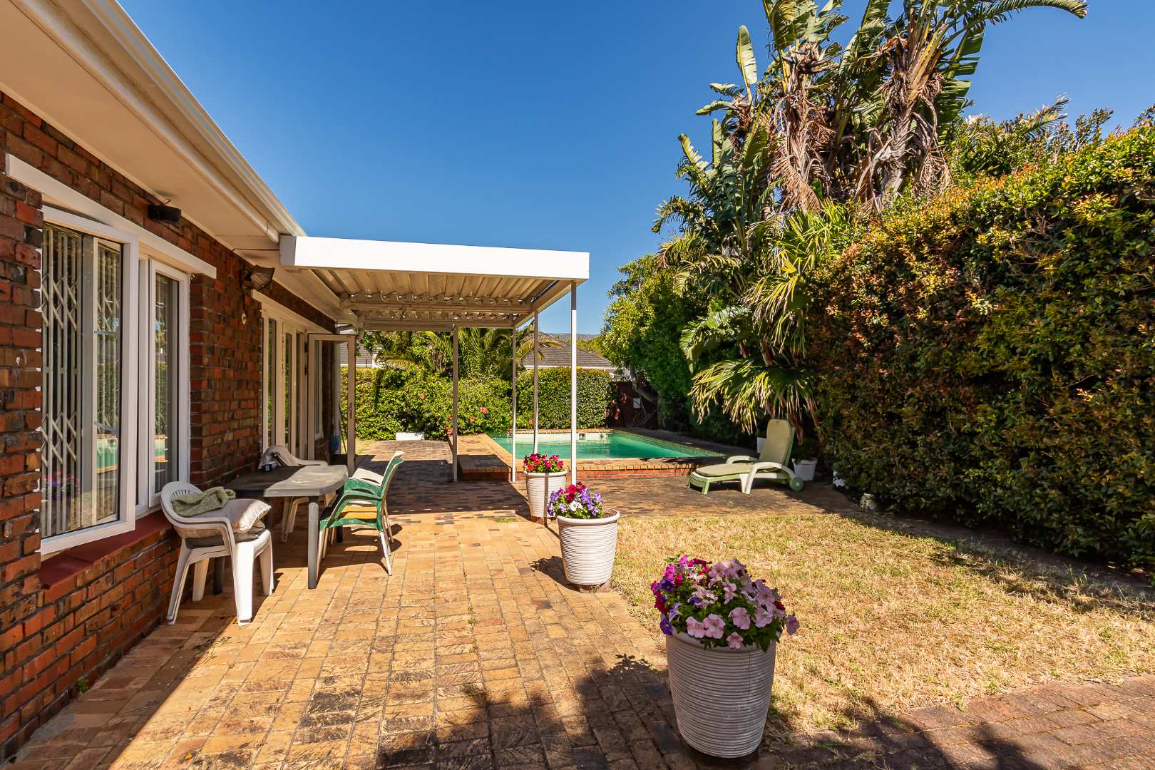 Outdoors, you’ll enjoy a sparkling pool and mature hedges that provide excellent privacy for summer relaxation. The double garage offers exciting potential for conversion into a flatlet, especially convenient given the additional covered carport space and a separate storeroom.