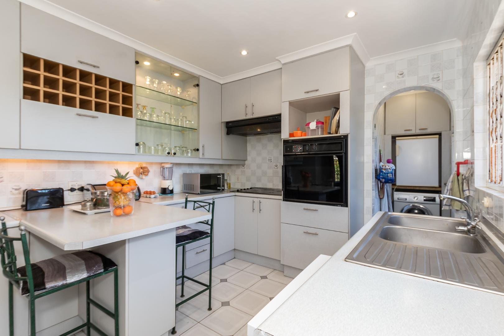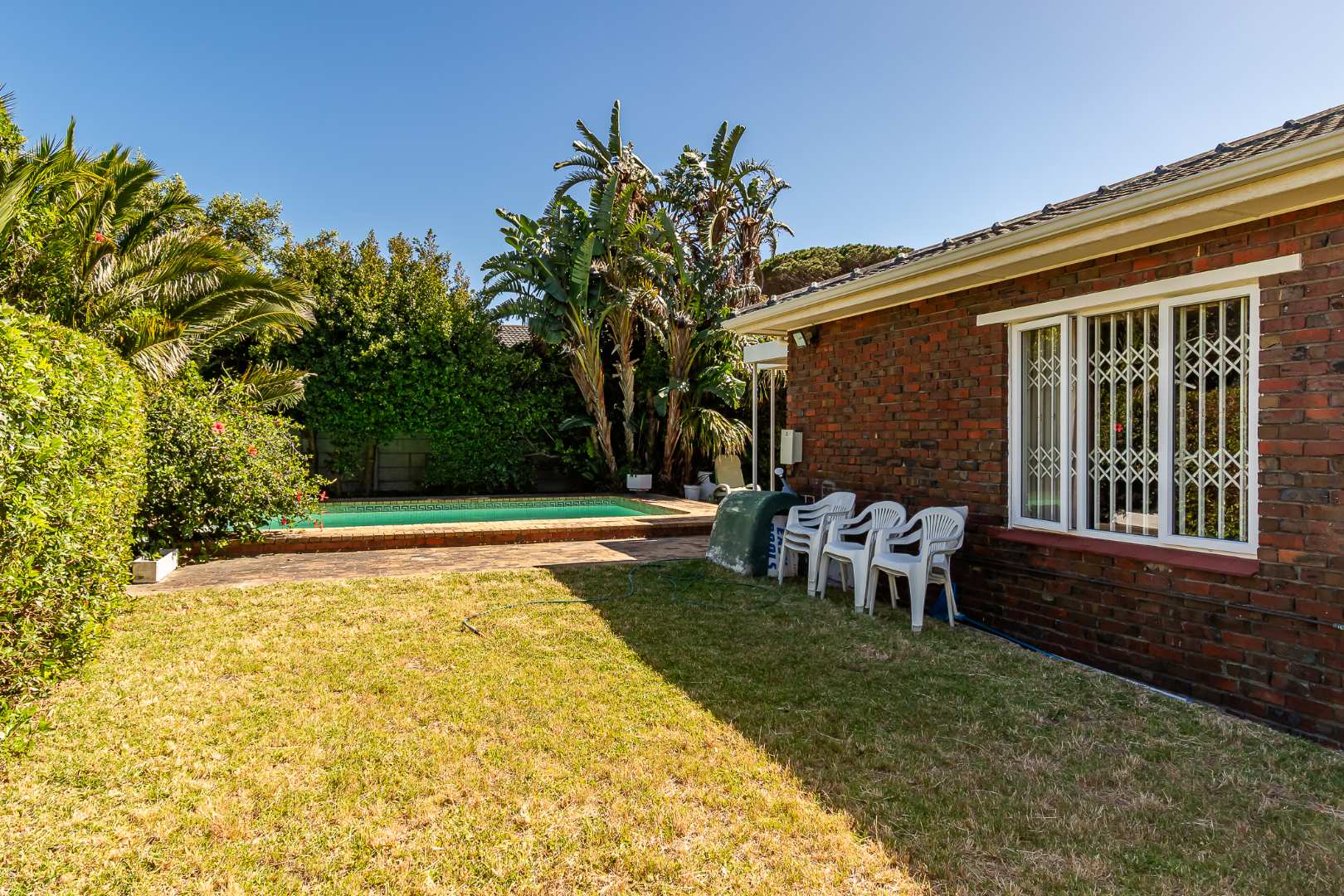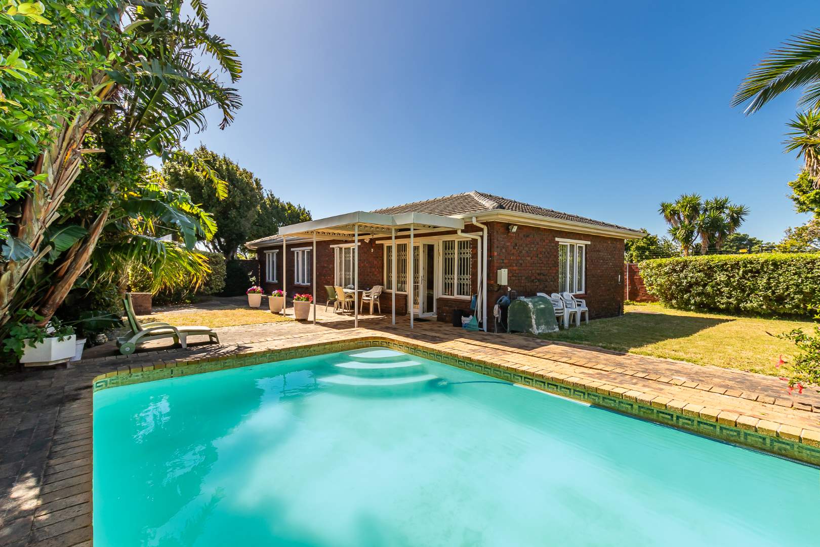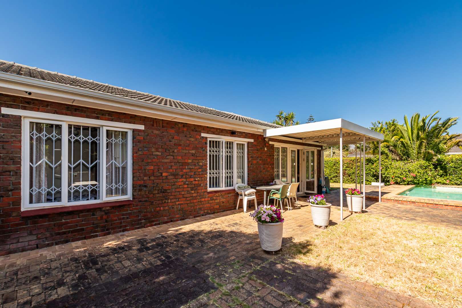 Outdoors, you’ll enjoy a sparkling pool and mature hedges that provide excellent privacy for summer relaxation. The double garage offers exciting potential for conversion into a flatlet, especially convenient given the additional covered carport space and a separate storeroom.