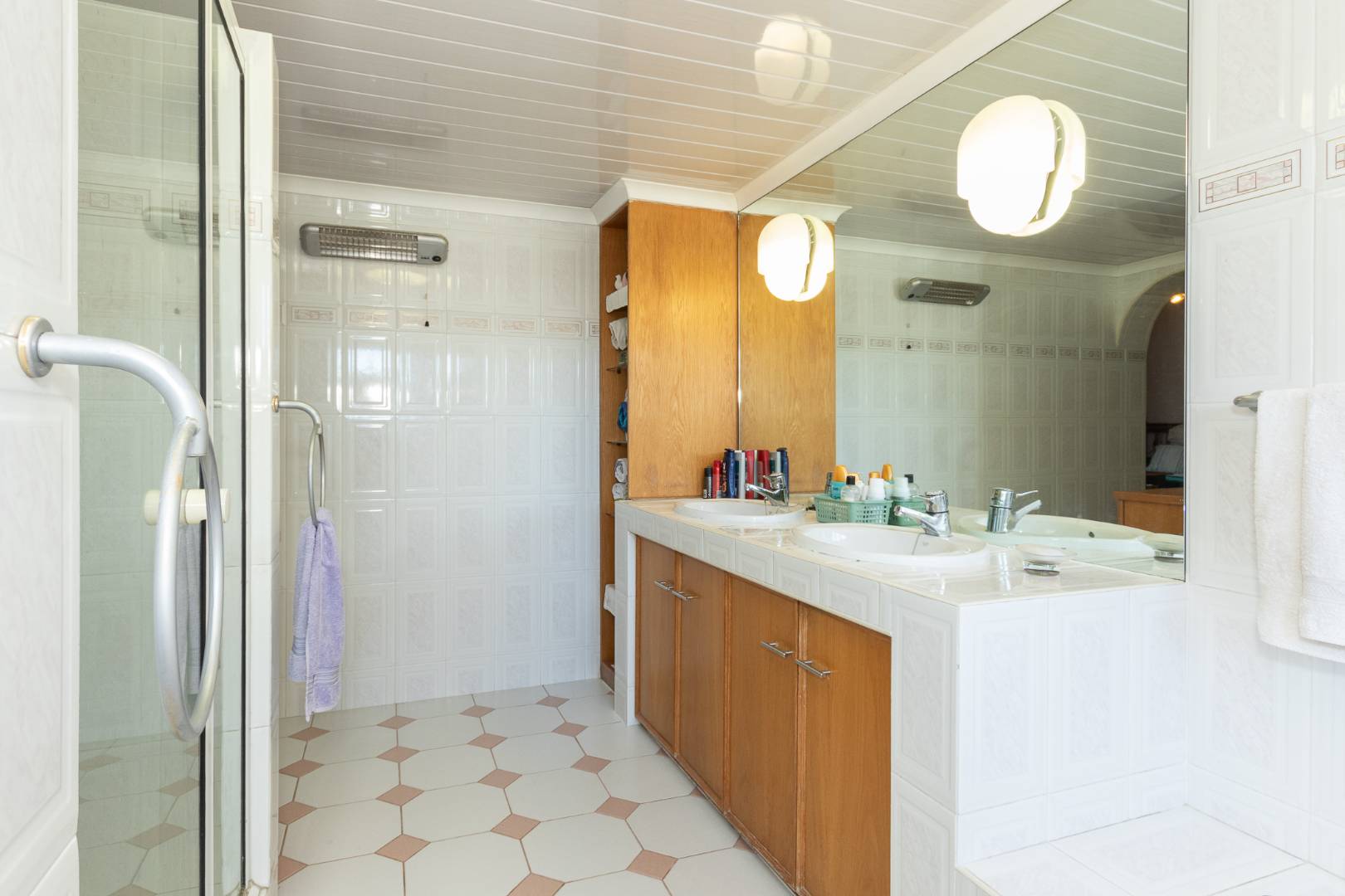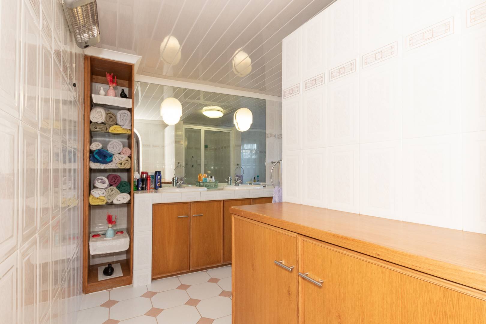 All three bedrooms are north-facing and fitted with built-in cupboards. The main bedroom offers solid oak cabinetry, laminated flooring, and a spacious en-suite bathroom equipped with a double basin, shower, bathtub, toilet, and bidet. The remaining two carpeted bedrooms share a family bathroom with a bathtub and hand-held shower.