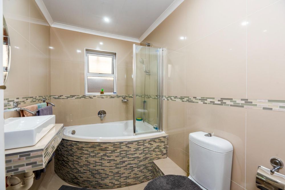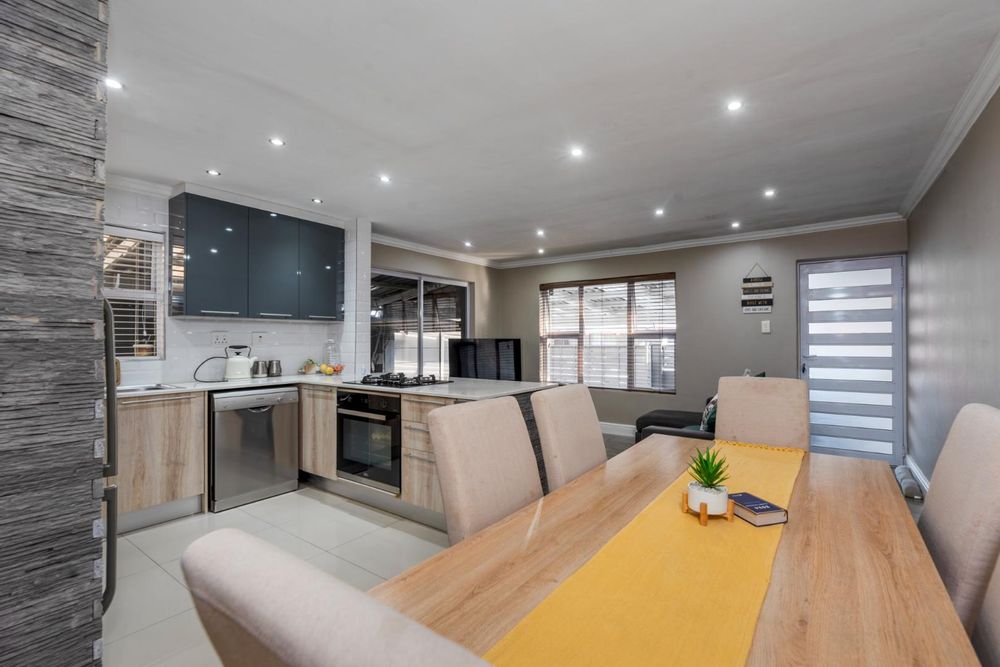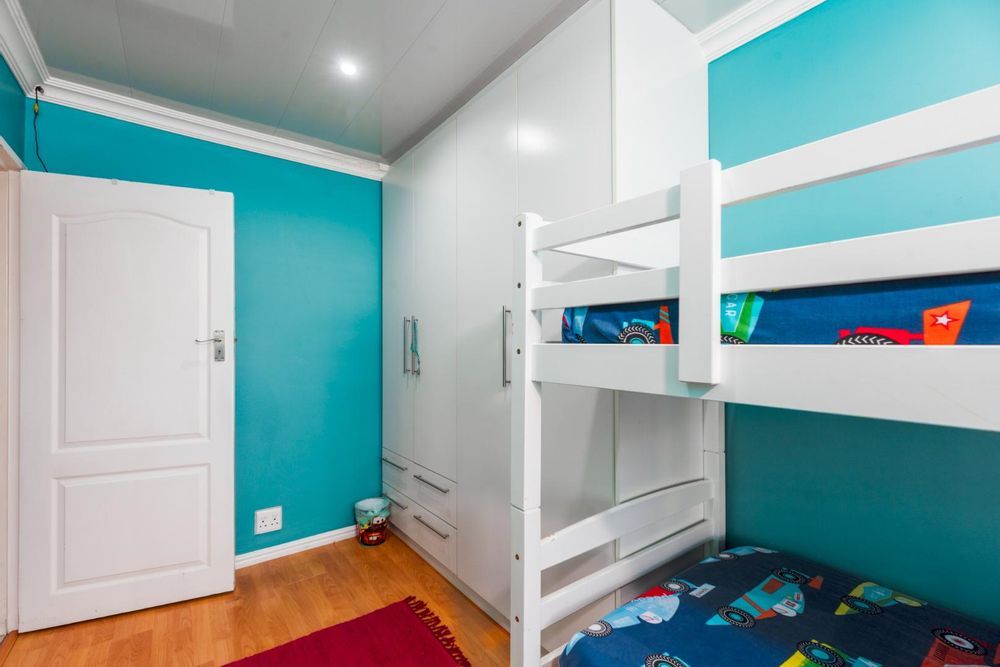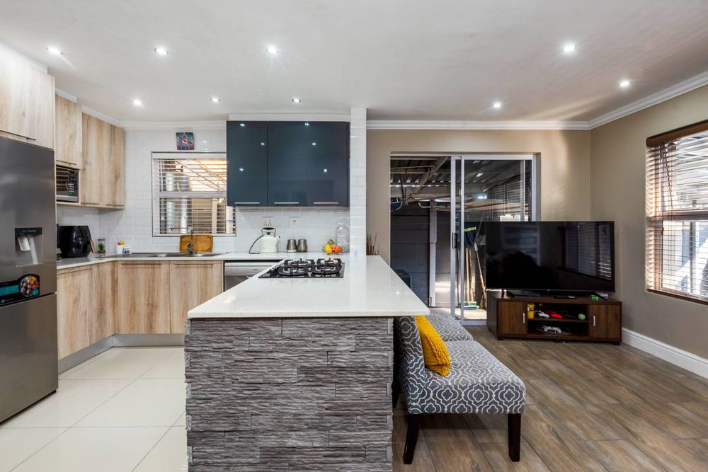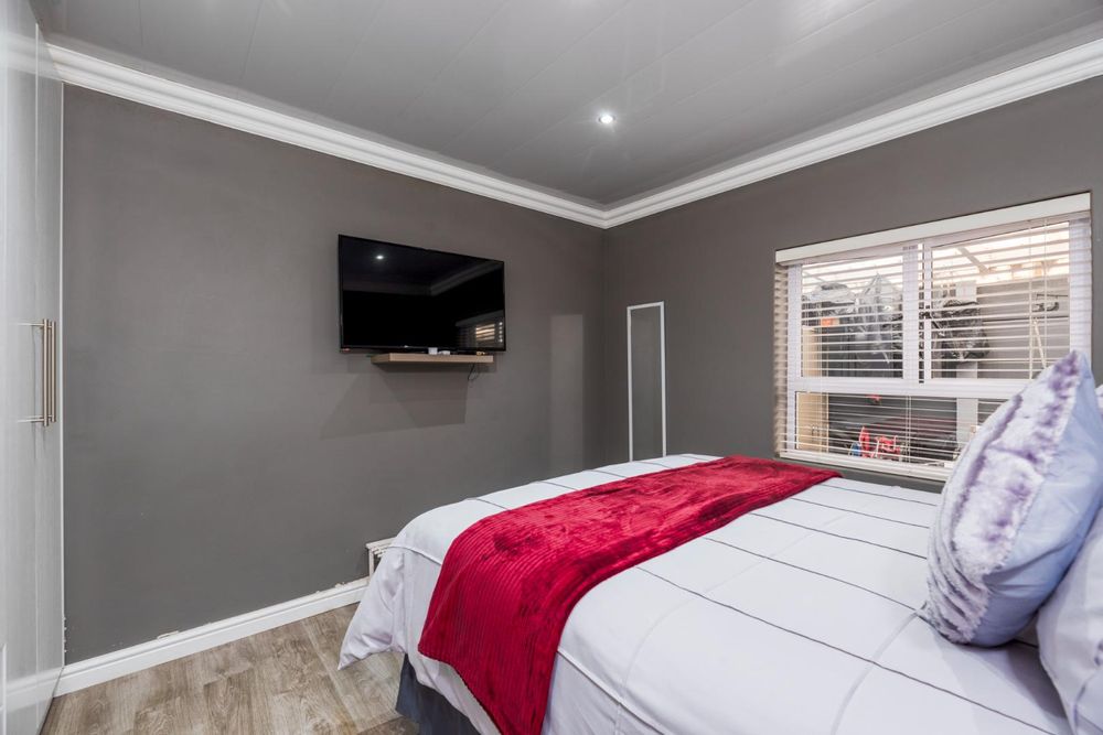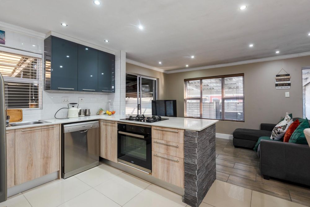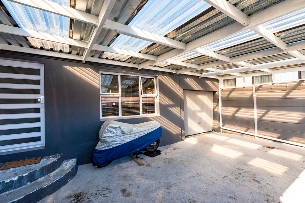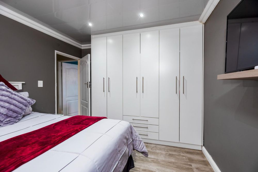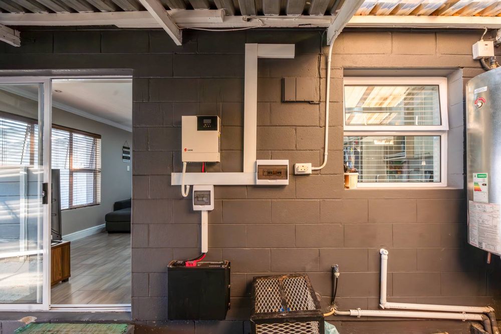 The modern kitchen is equipped with built-in cupboards, providing ample storage and a stylish finish. The home includes two spacious bedrooms with laminated flooring and built-in cupboards for convenient storage, and a well-appointed family bathroom with a bath, shower, toilet, and basin. All windows are fitted with durable aluminum frames for enhanced security, and the property includes a motorized garage for one vehicle, a carport, and additional parking space for two vehicles secured by an electric motor gate.