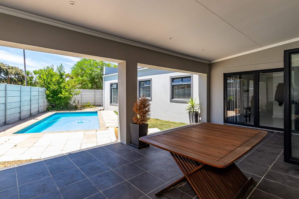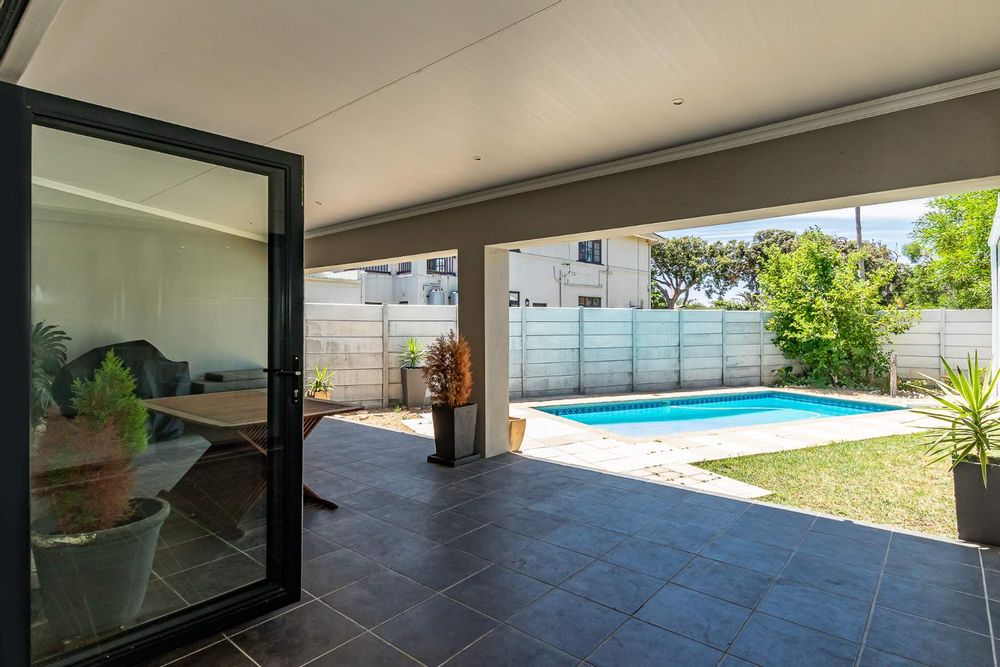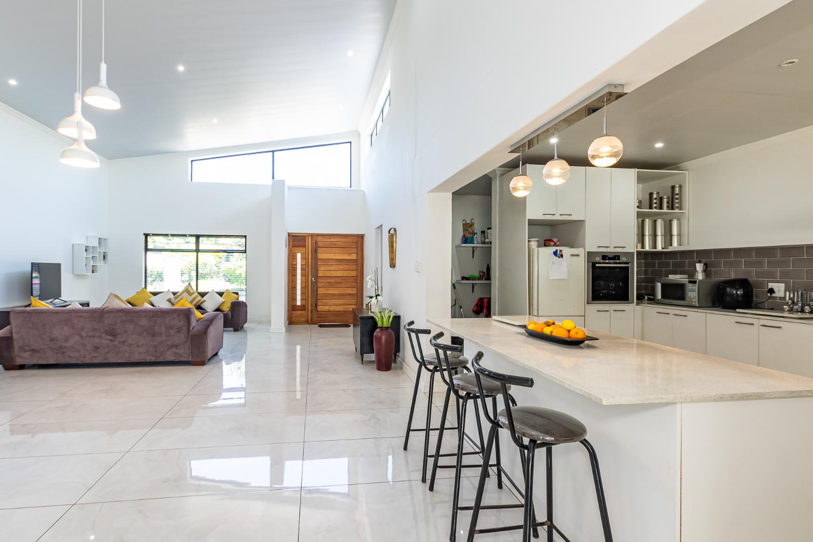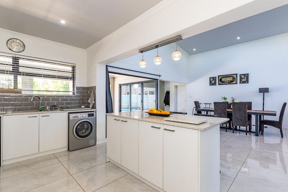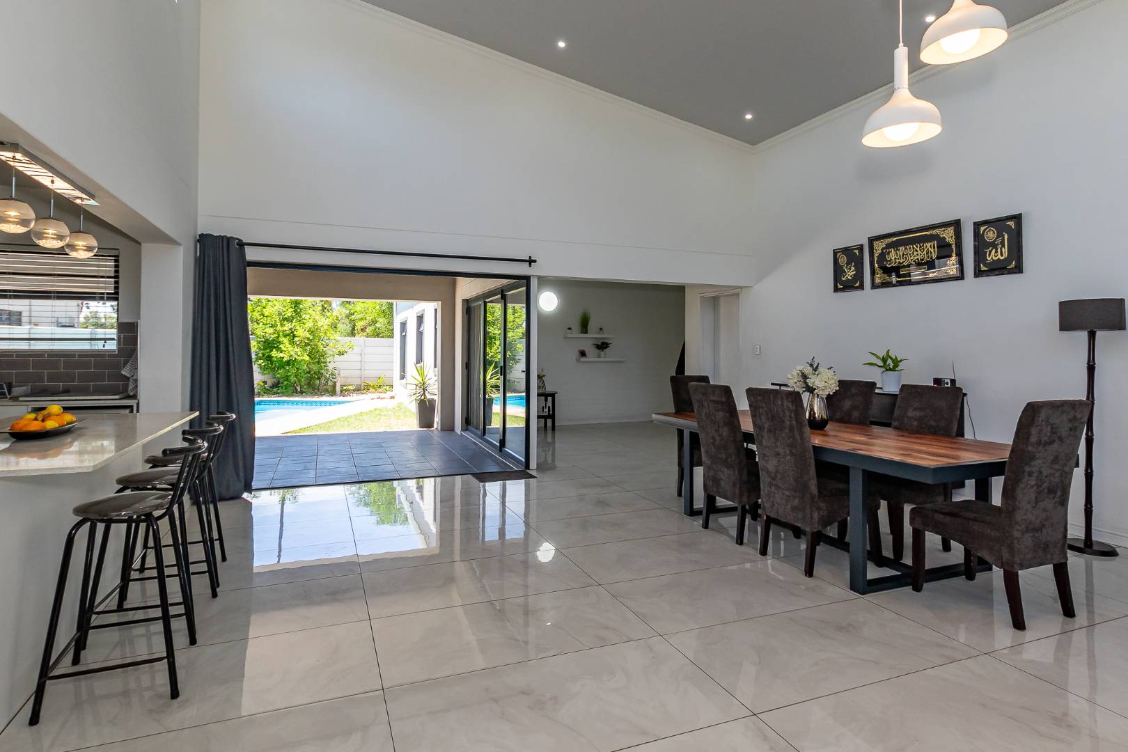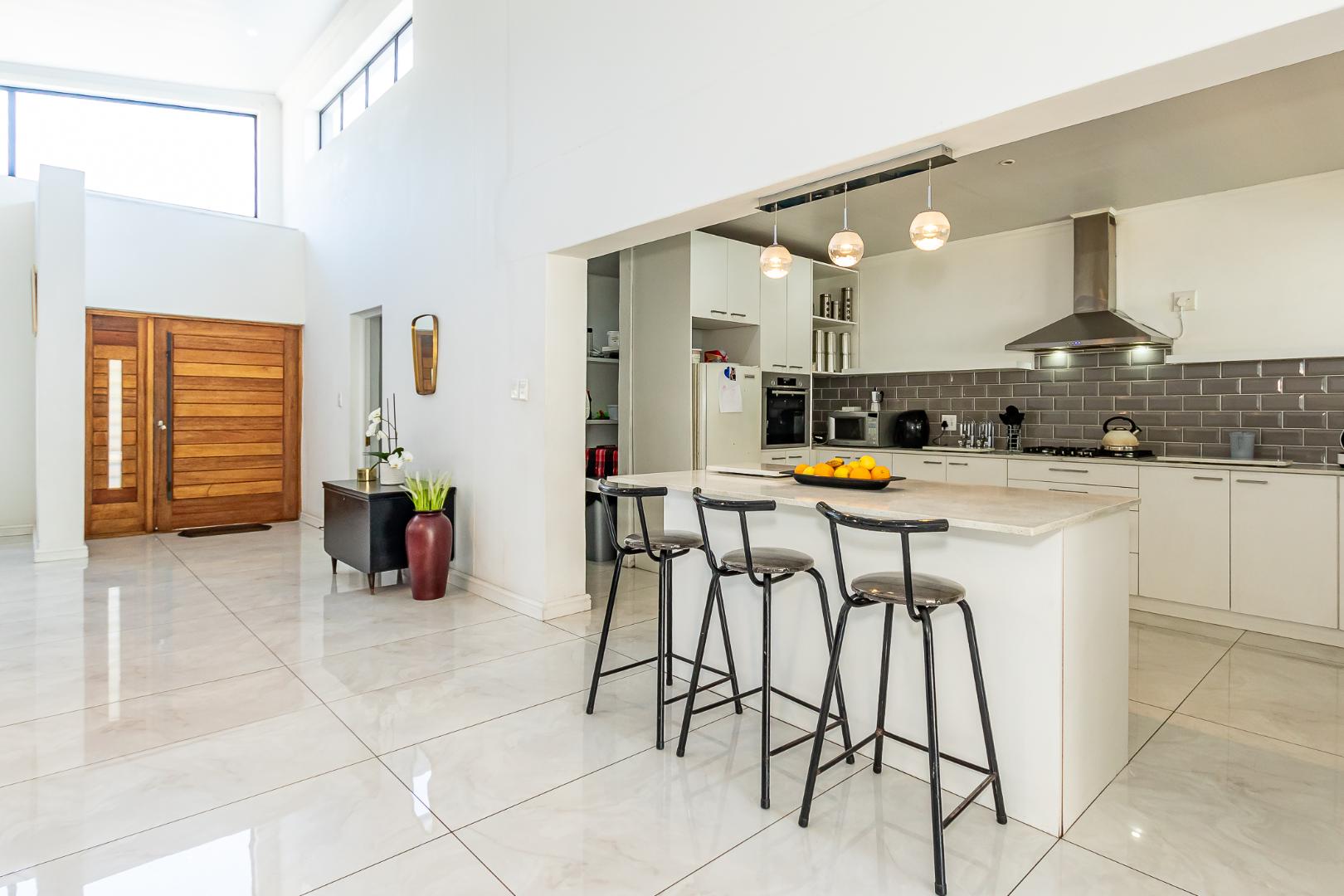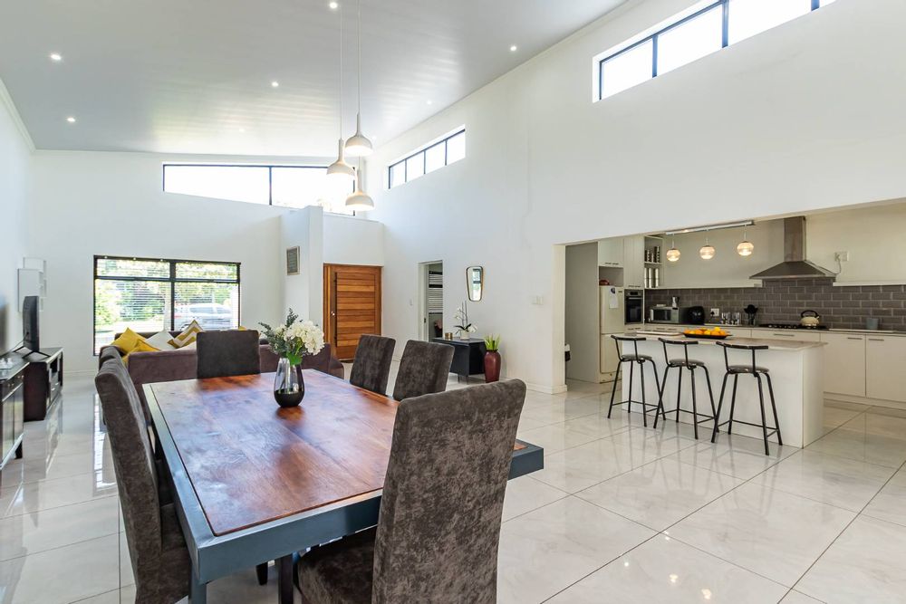 A designer kitchen flows effortlessly into the dining and lounge areas, extending onto a covered entertainment patio overlooking a sparkling swimming pool — ideal for relaxed family gatherings or vibrant get-togethers.