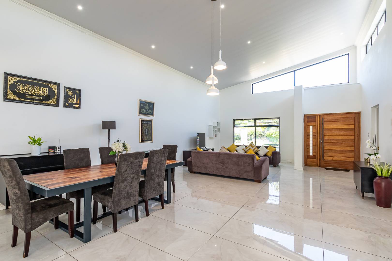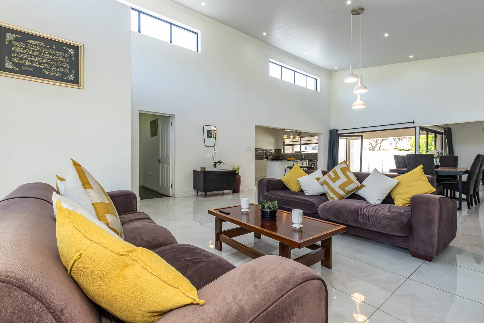 Step into a light-filled open-plan living area boasting double-volume ceilings that create an impressive sense of space and elegance.