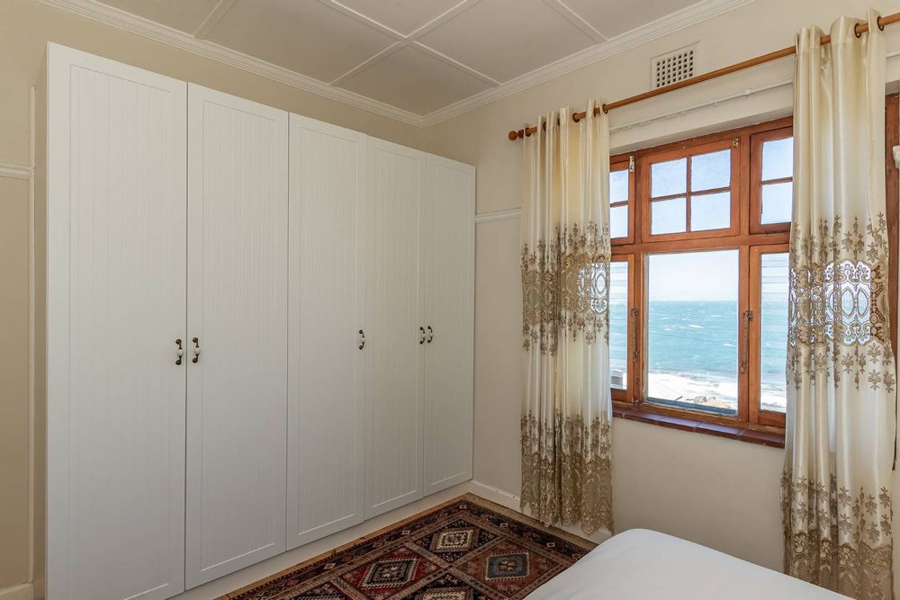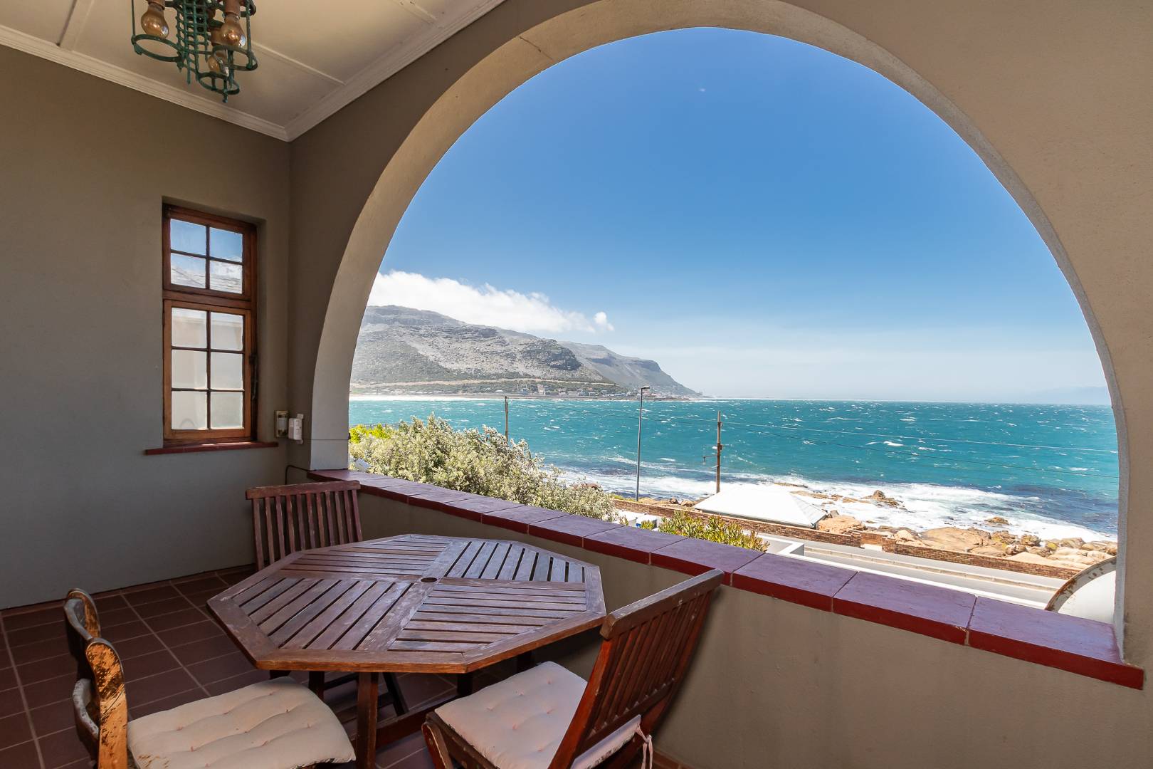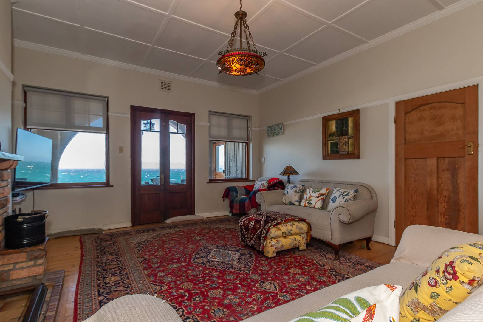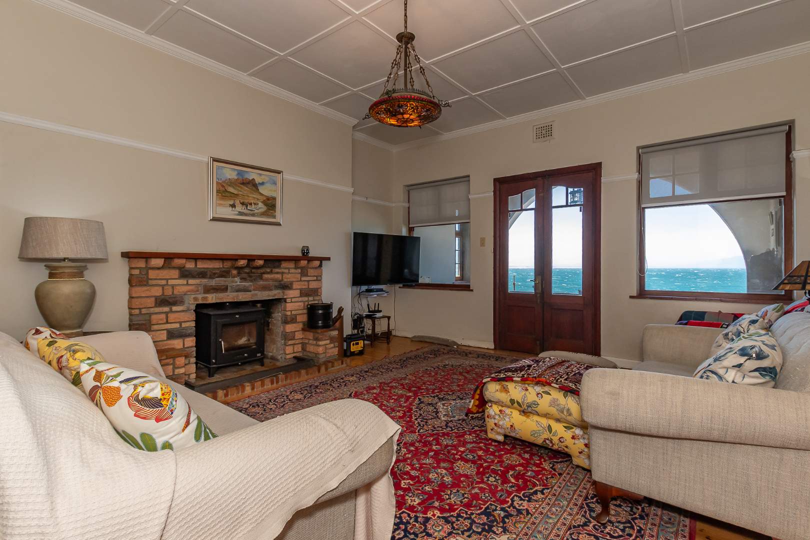 Open plan cosy lounge and dinging area with fireplace. The lounge area with doors leading to a balcony with the most amazing 180-degree sea views.